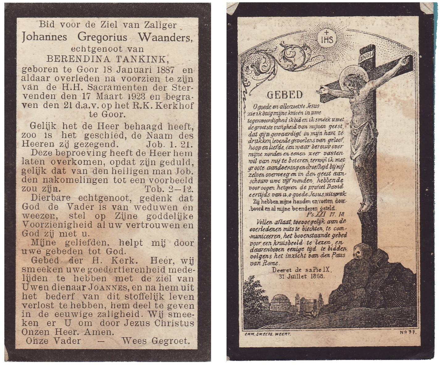 WAANDERS, Johannes Gregorius, geboren op 18-01-1887 te Goor, overleden op 17-3-1923 op 36-jarige leeftijd, begraven op 21-3-1923 te Goor.