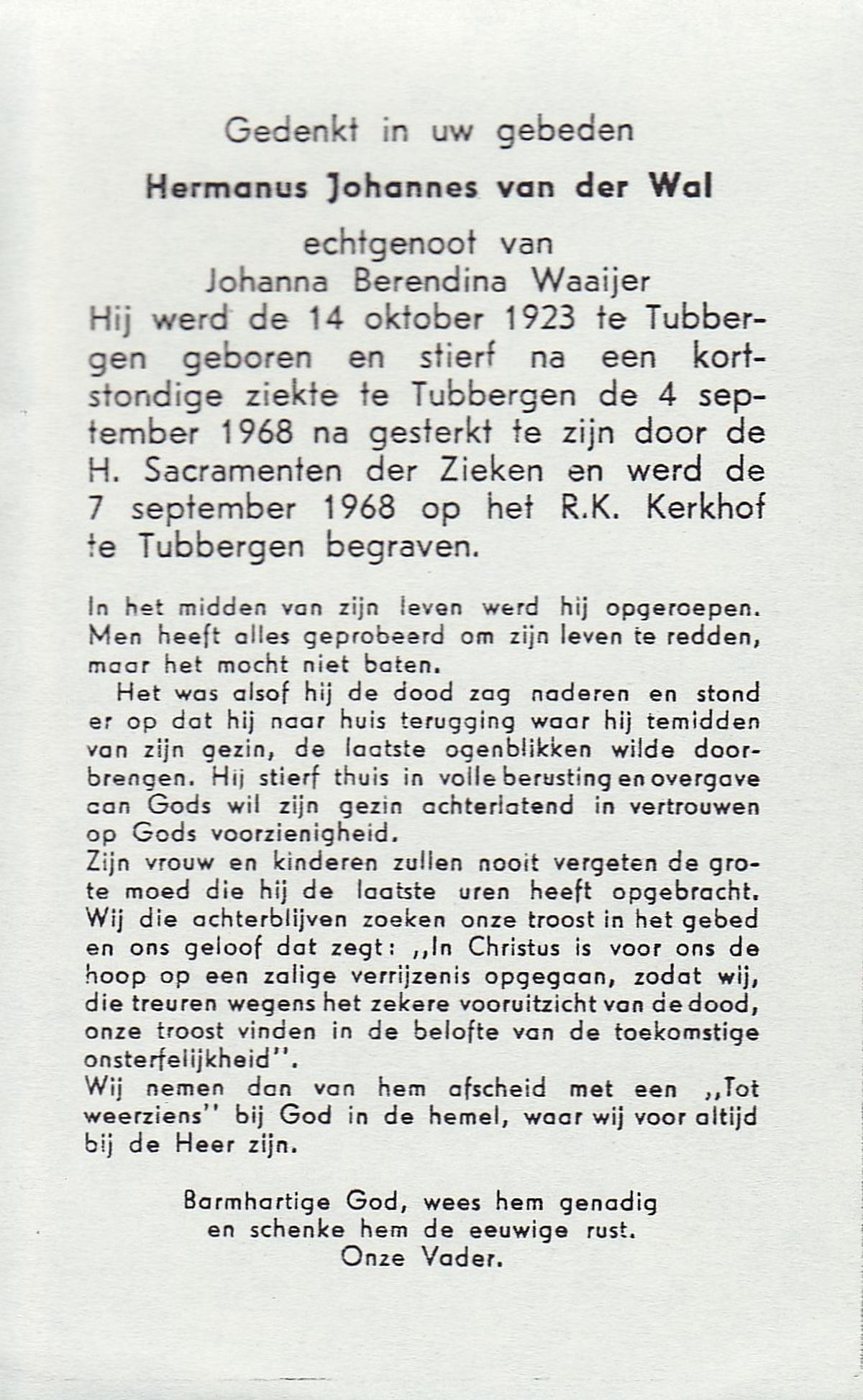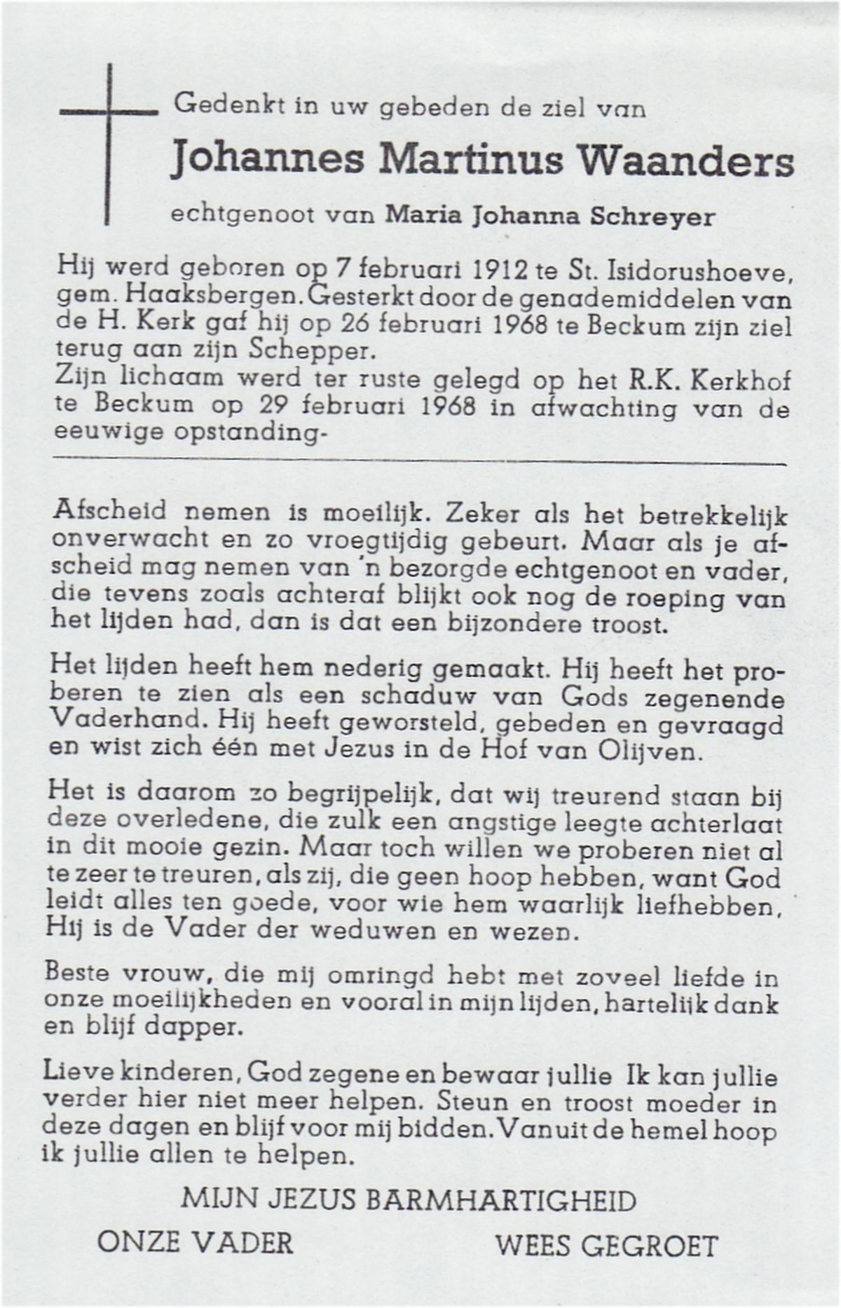 WAANDERS, Johannes Martinus, geboren op 7-2-1912 te St. Isidorushoeve, overleden op 26-2-1968 te Beckum op 56-jarige leeftijd, begraven op 29-2-1968 te Beckum.