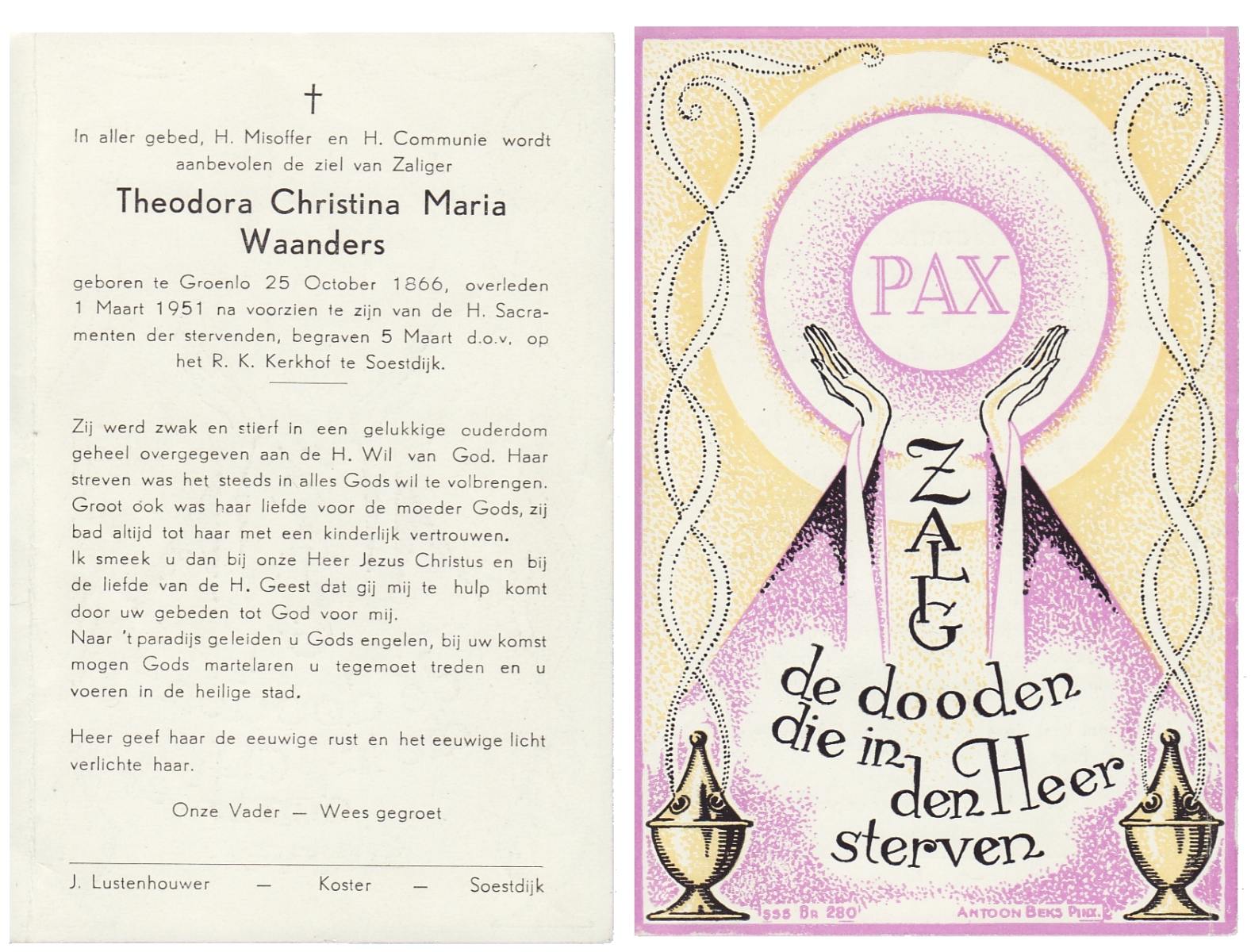 WAANDERS, Theodora Christina Maria, geboren op 25-10-1866 te Groenlo, overleden op 1-3-1951 op 84-jarige leeftijd, begraven op 5-3-1951 te Soestdijk.