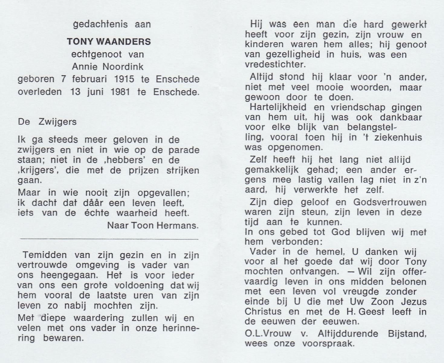 WAANDERS, Tony, geboren op 7-2-1915 te Enschede, overleden op 13-6-1981 te Enschede op 66-jarige leeftijd.