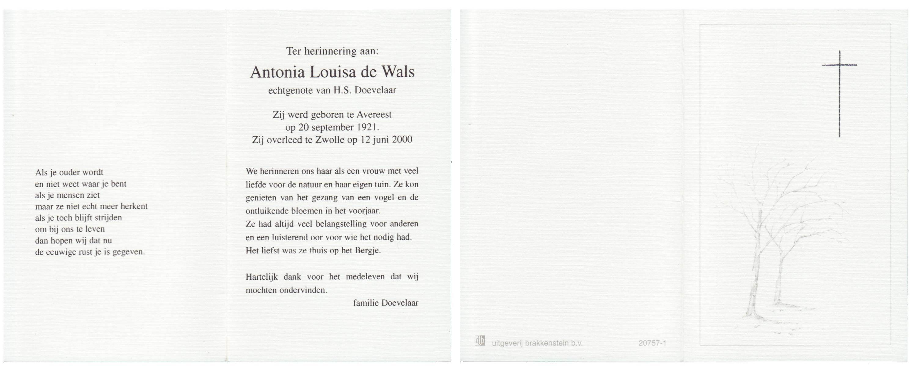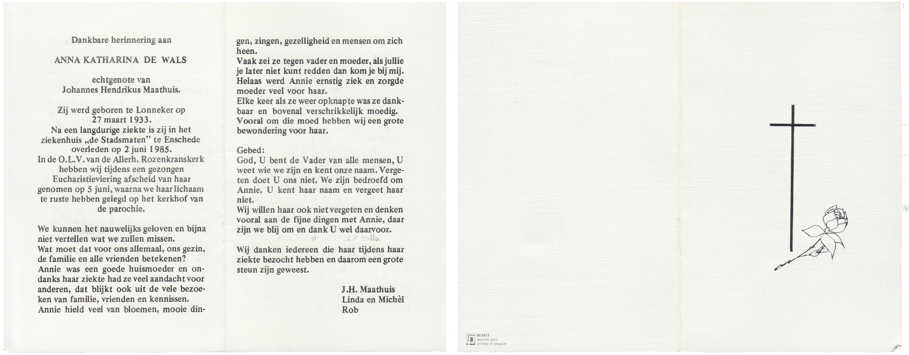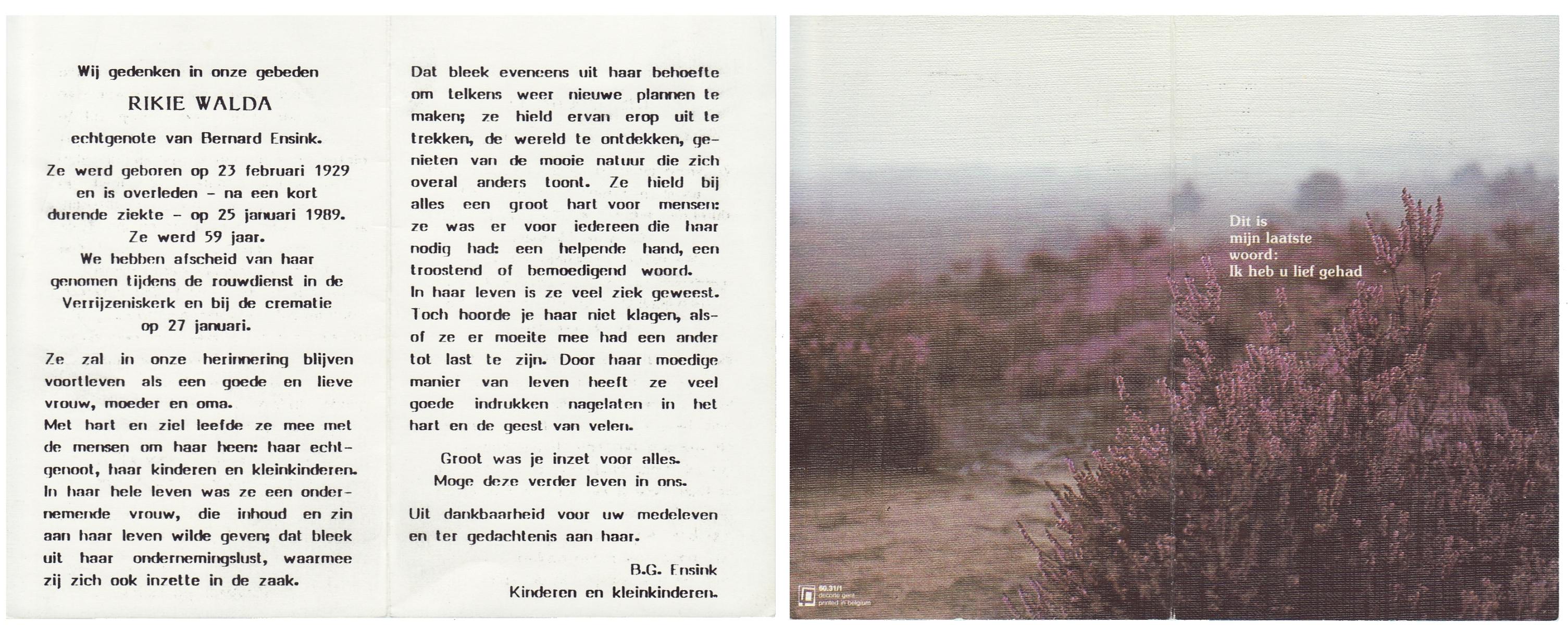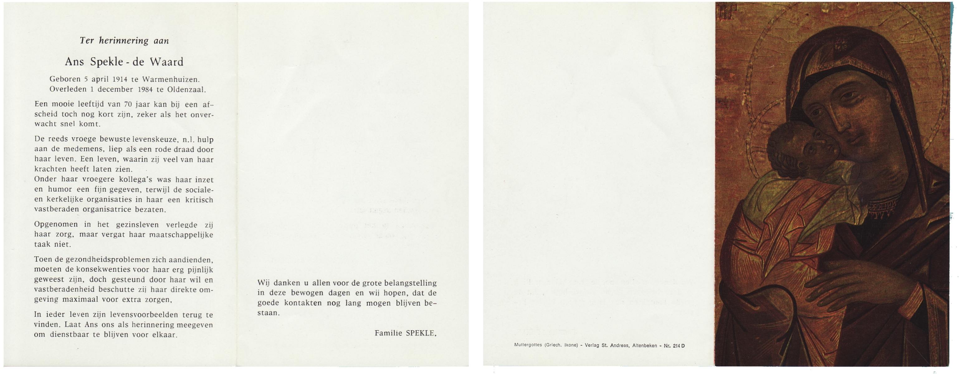 WAARD, de, Ans, geboren op 5-4-1914 te Warmenhuizen, overleden op 1-12-1984 te Oldenzaal op 70-jarige leeftijd.
