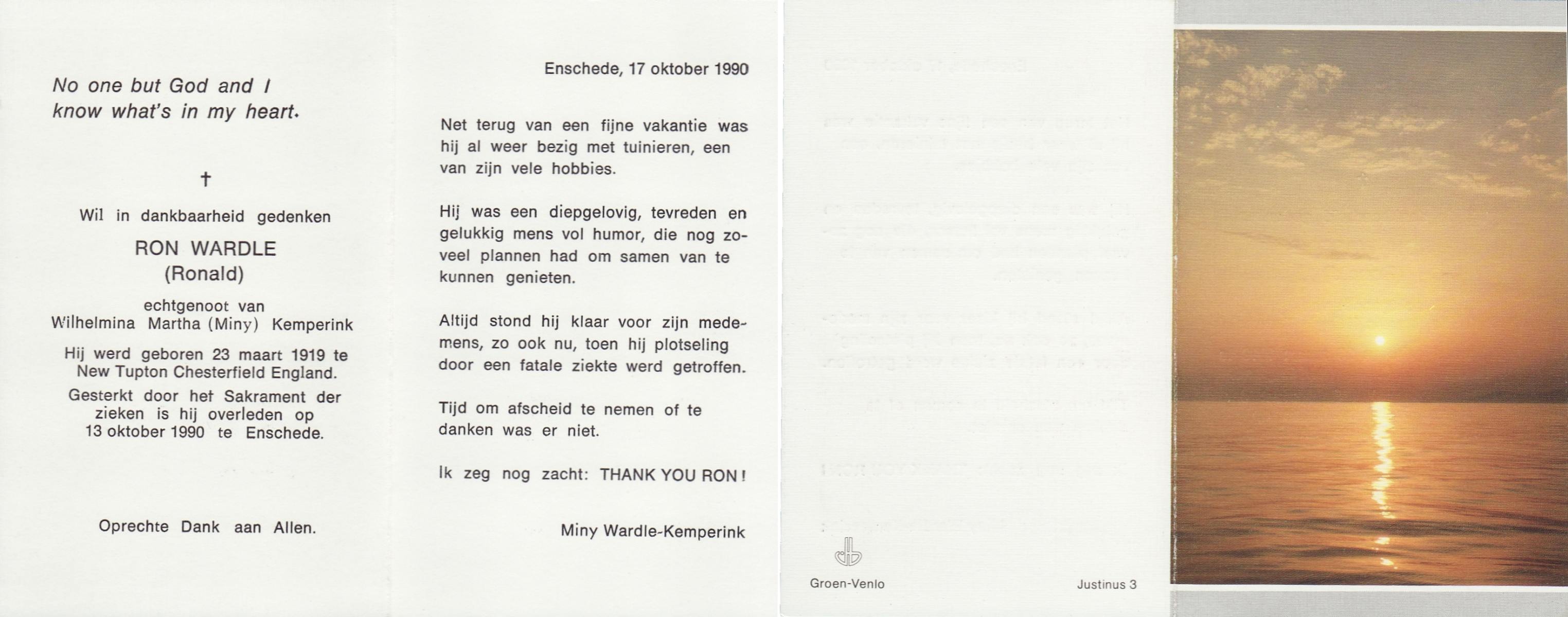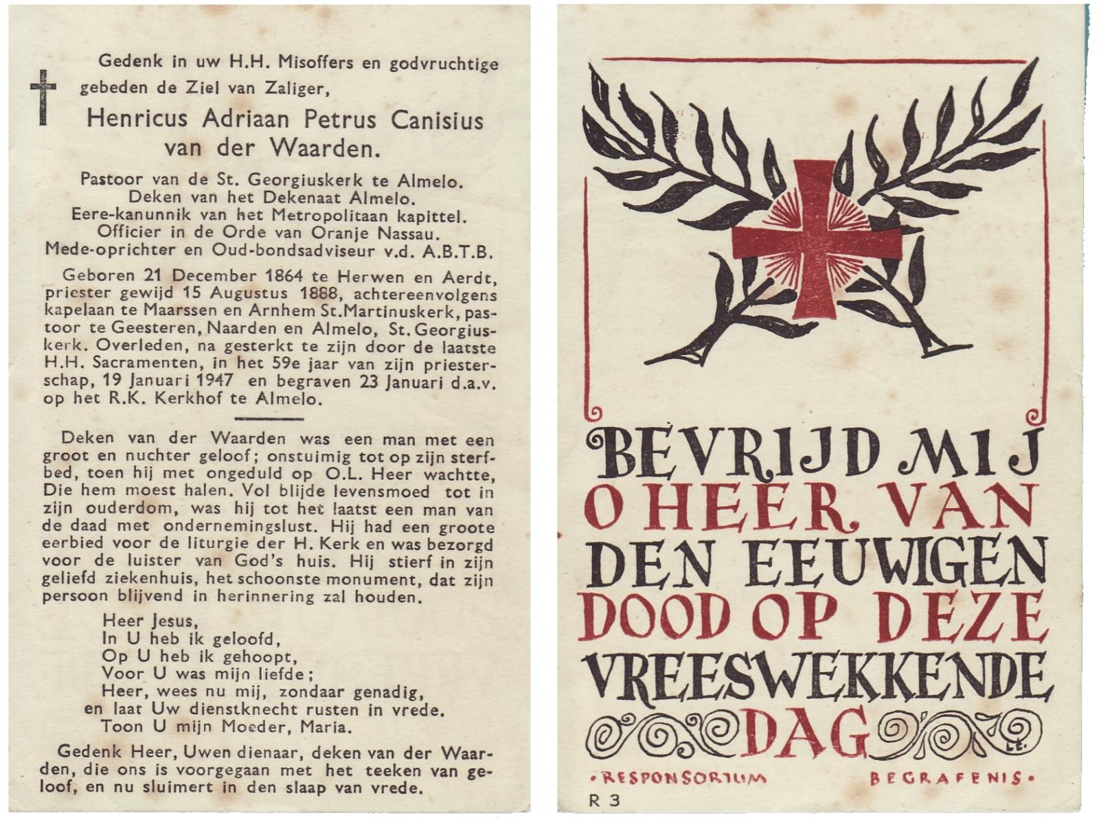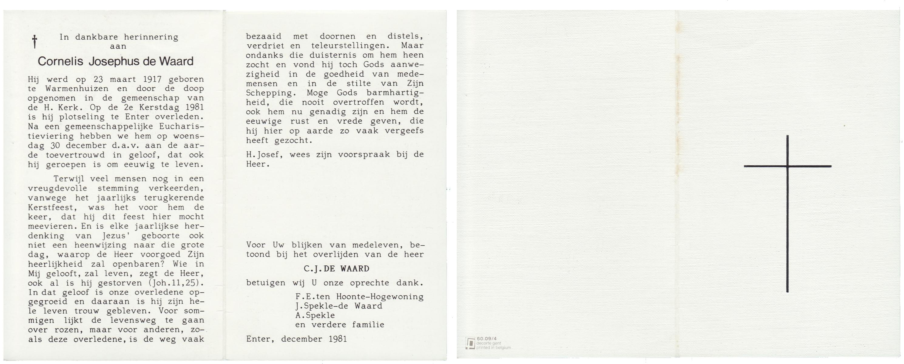 WAARD, de, Cornelis Josephus, geboren op 23-3-1917 te Warmenhuizen, overleden op 26-12-1981 te Enter op 64-jarige leeftijd, begraven op 30-12-1981 te Enter.