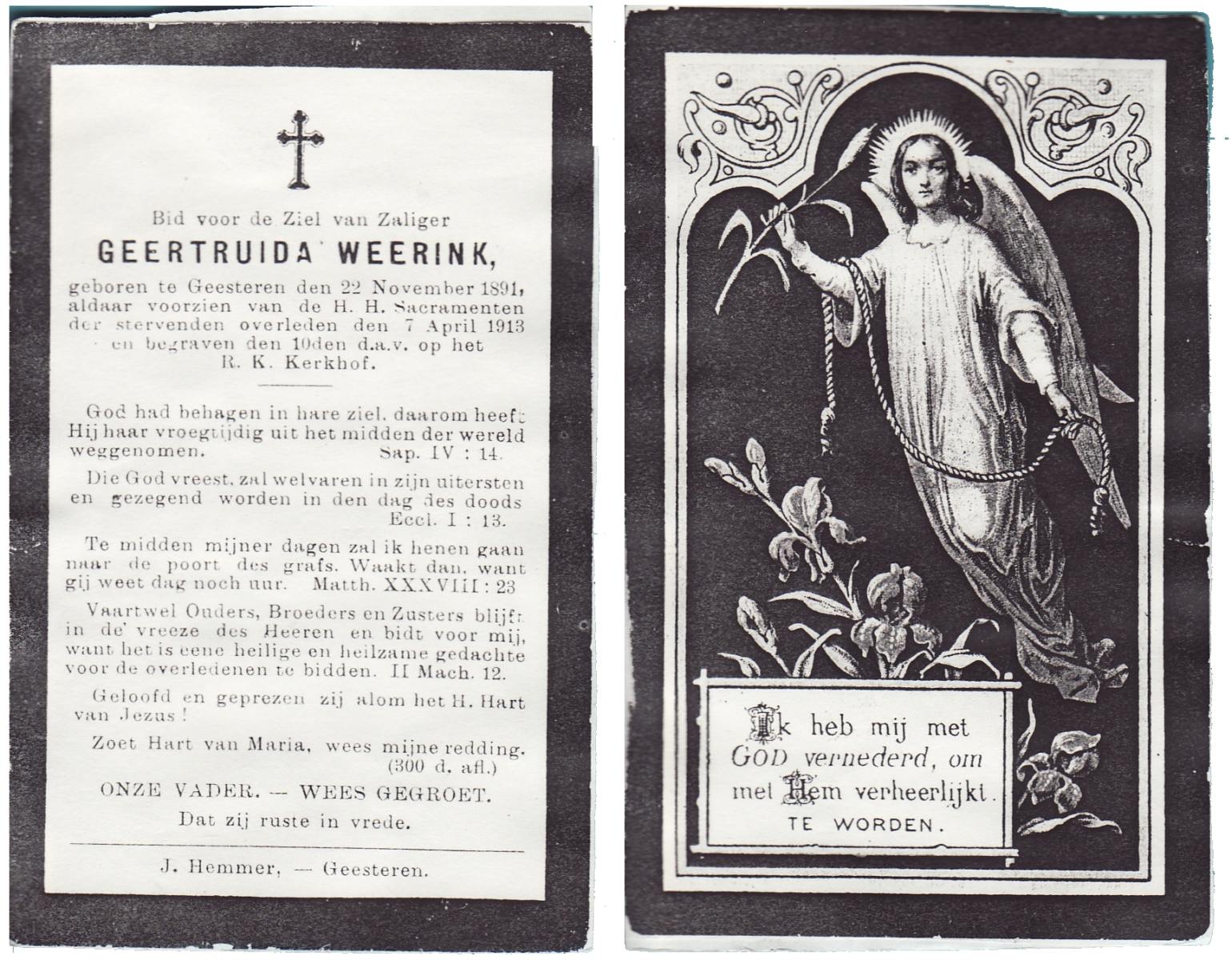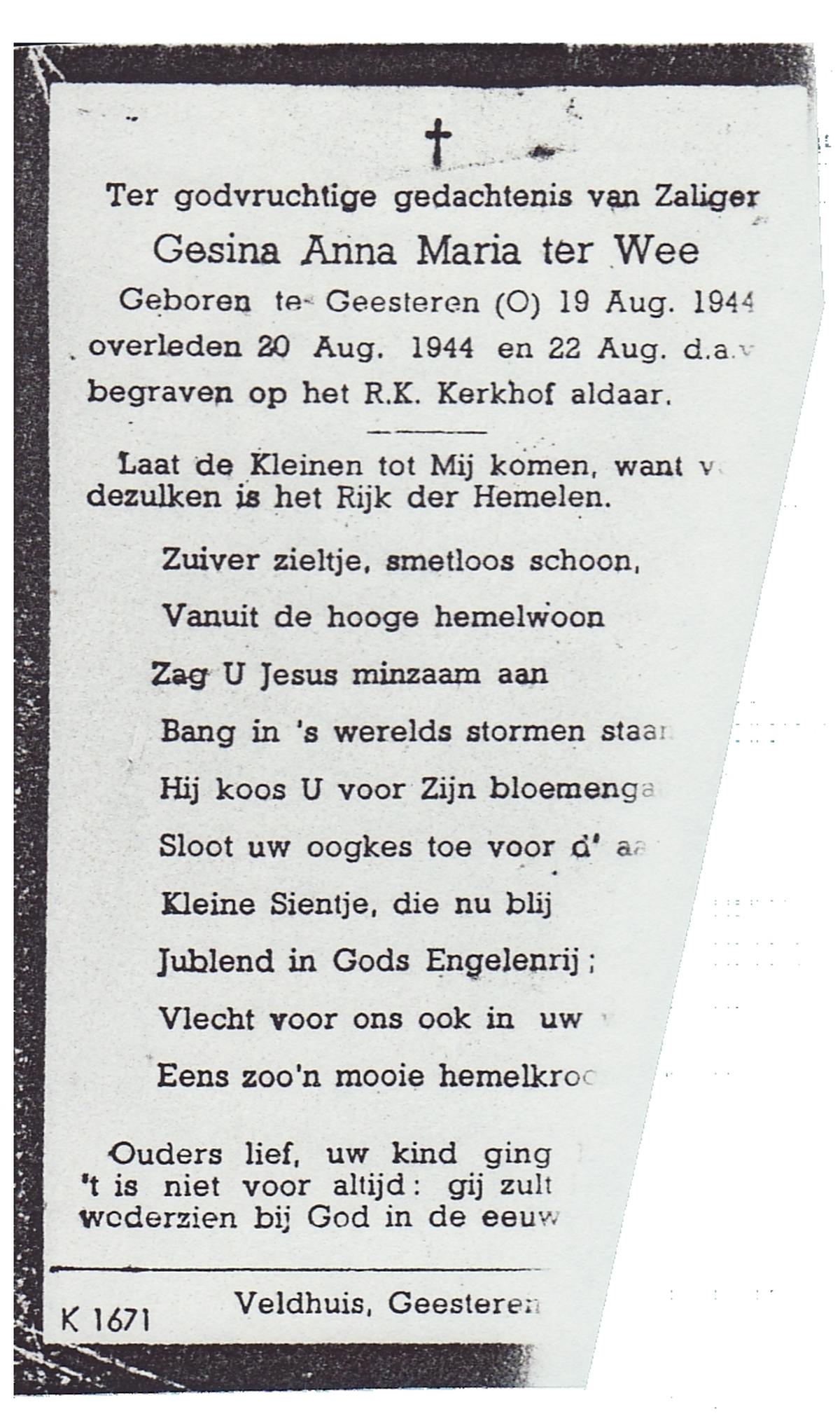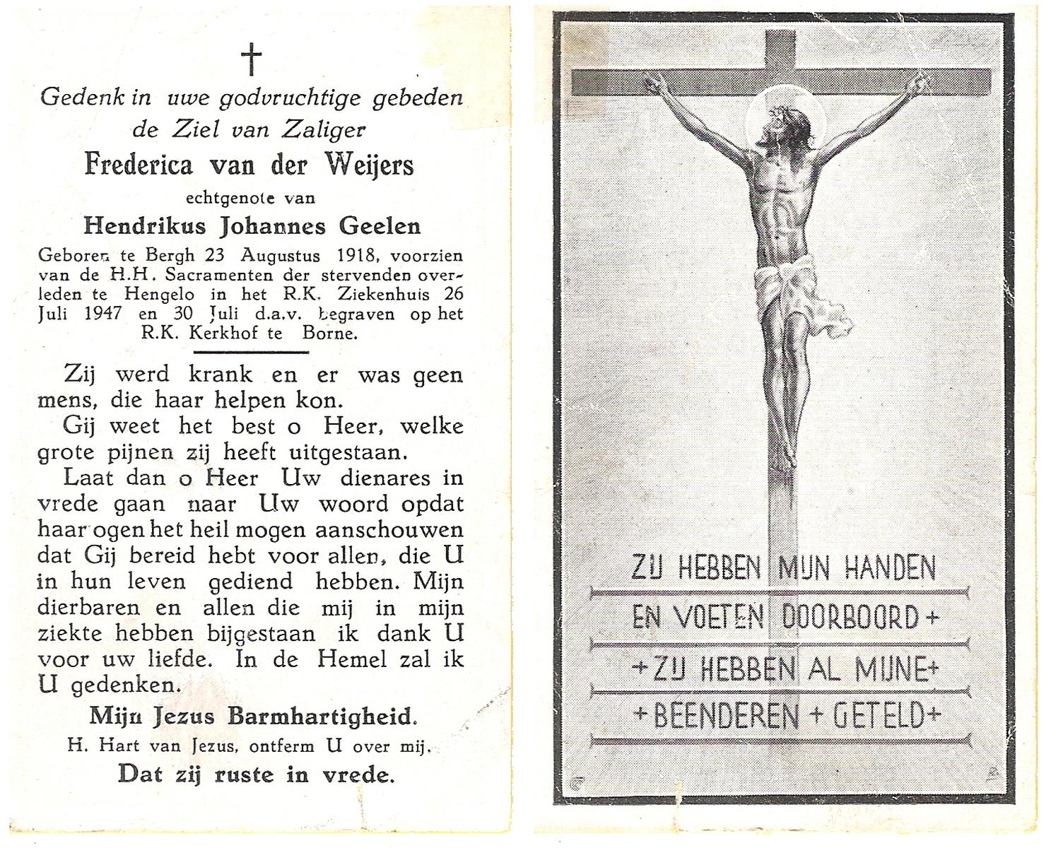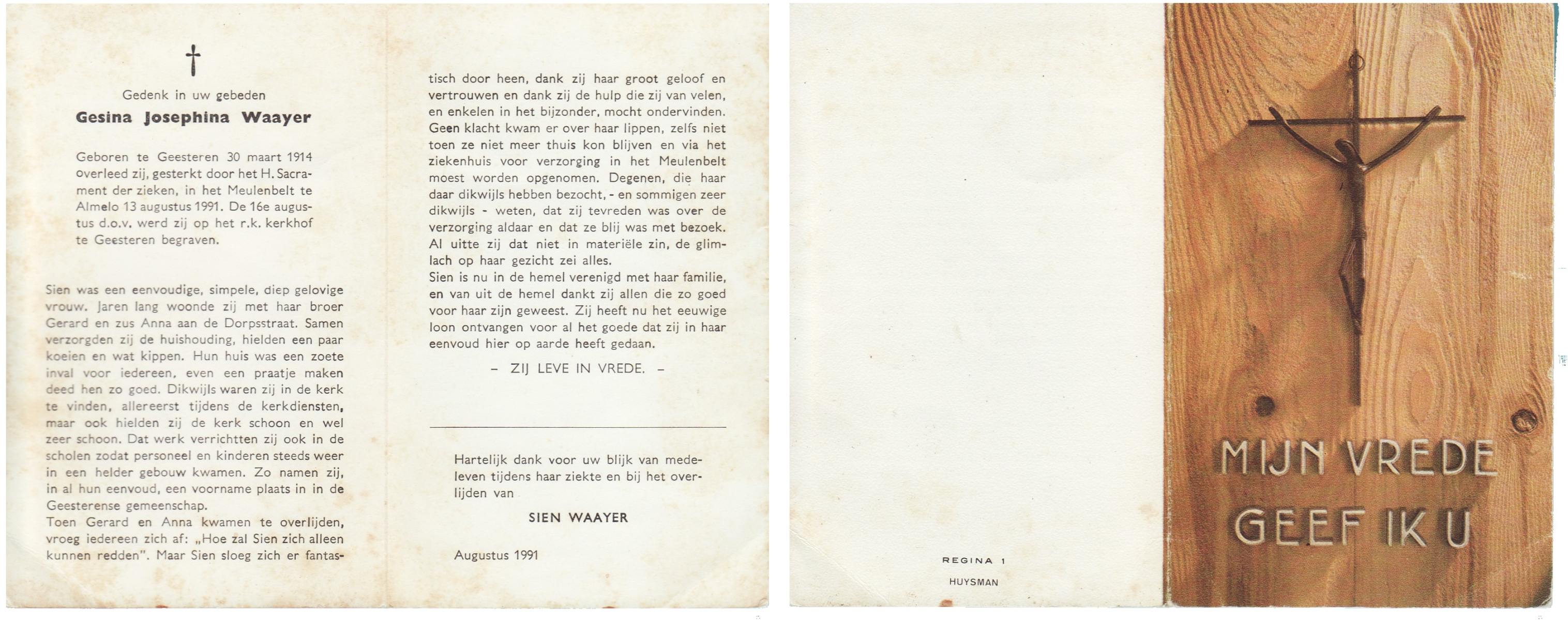 WAAYER, Gesina Josephina, geboren op 30-3-1914 te Geesteren (Ov.), overleden op 13-8-1991 te Almelo op 77-jarige leeftijd, begraven op 16-8-1991 te Geesteren.