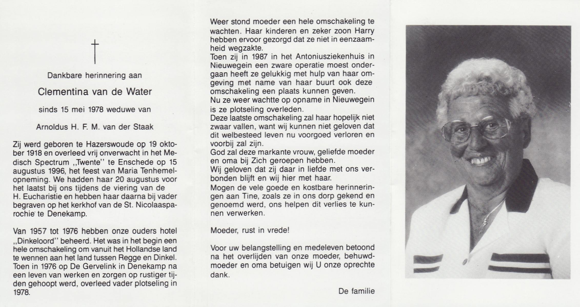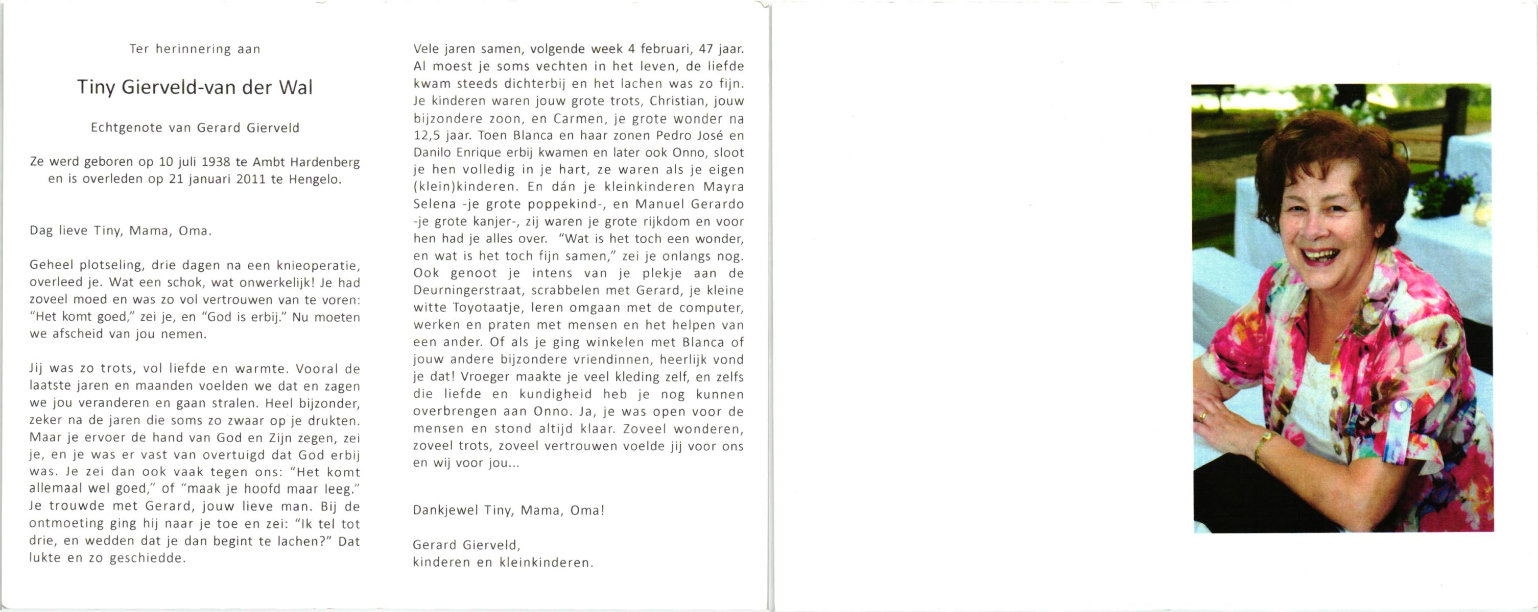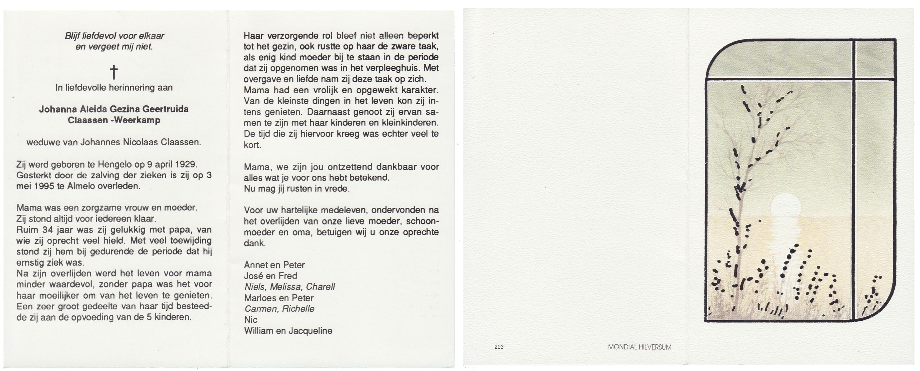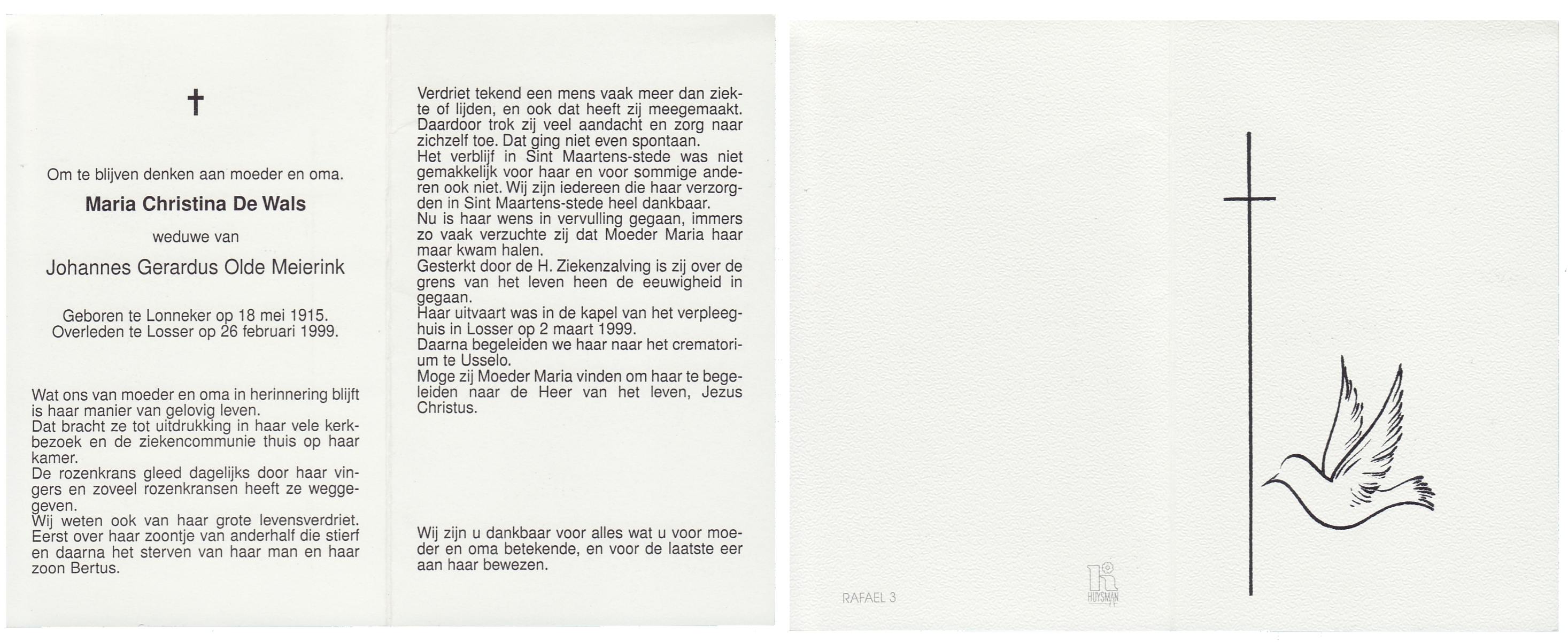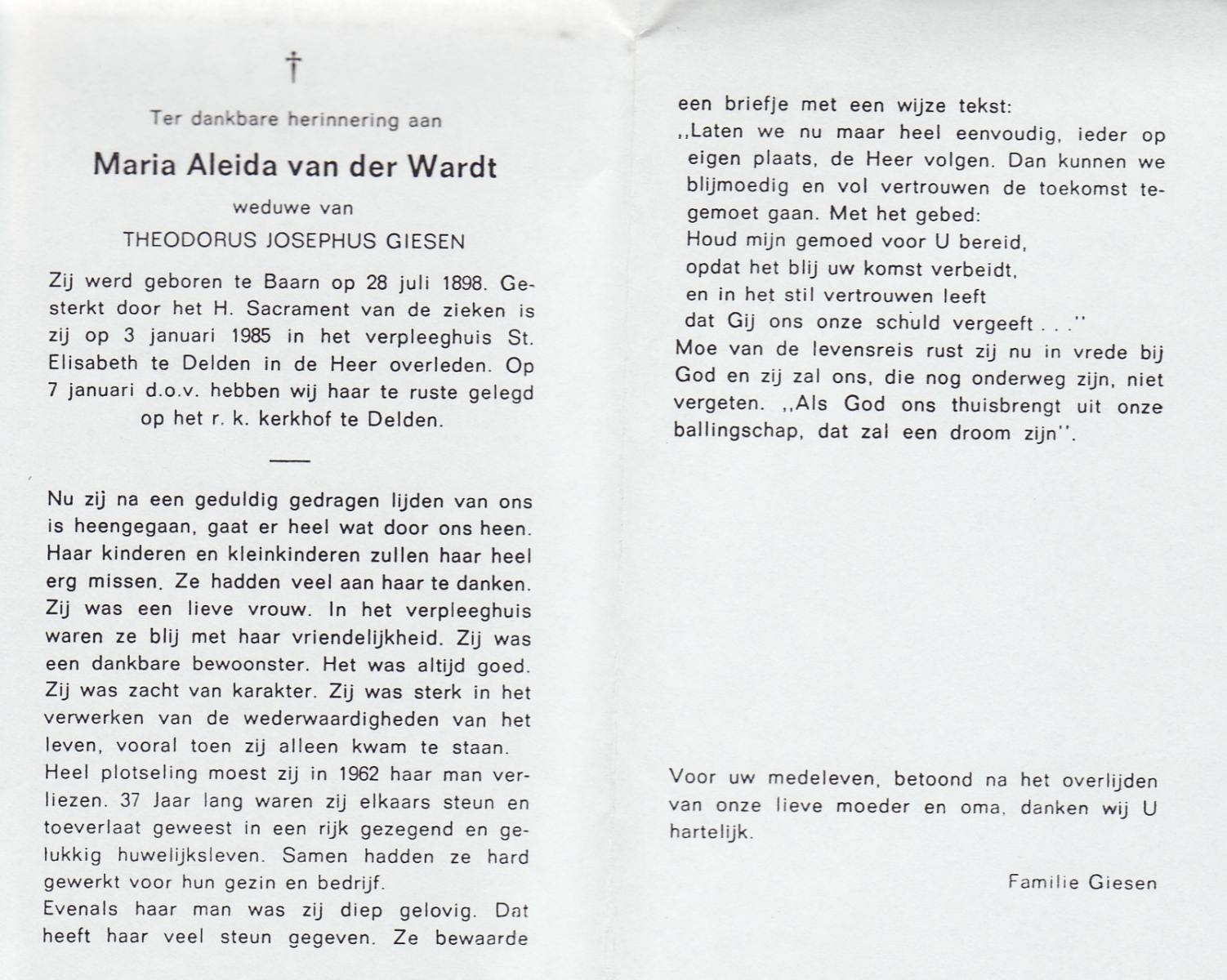 WAAYER, Gesina Josephina, geboren op 30-3-1914 te Geesteren (Ov.), overleden op 13-8-1991 te Almelo op 77-jarige leeftijd, begraven op 16-8-1991 te Geesteren.