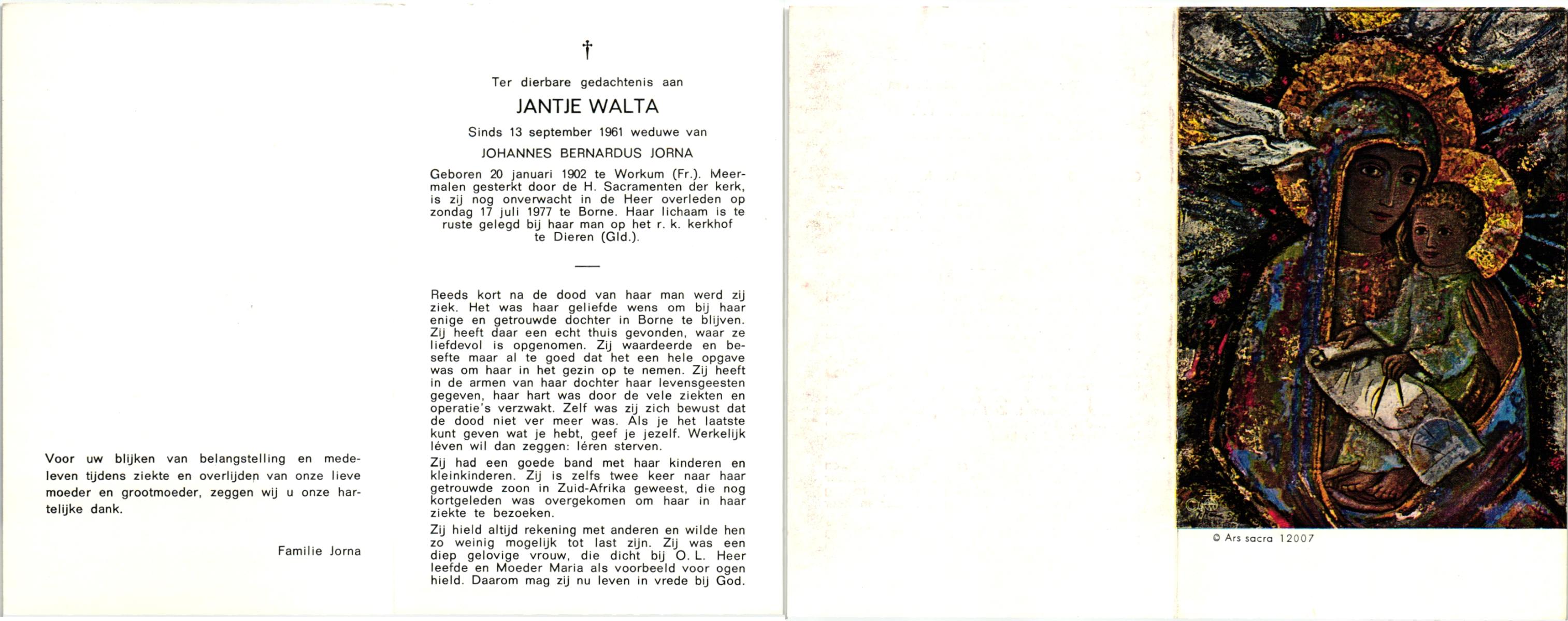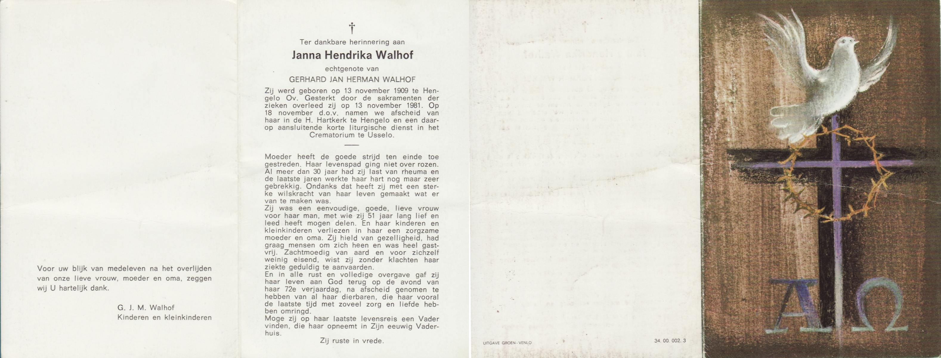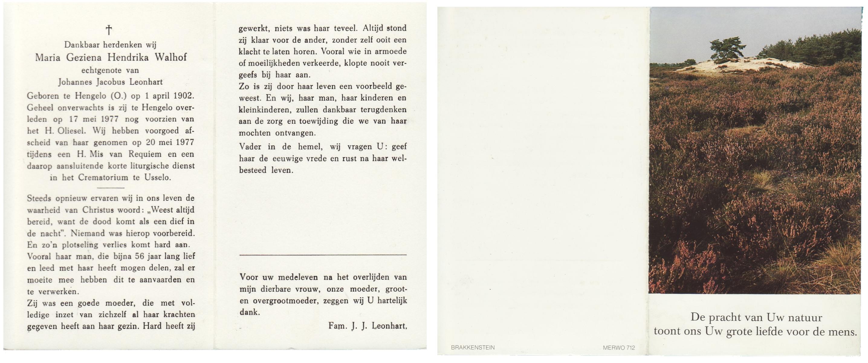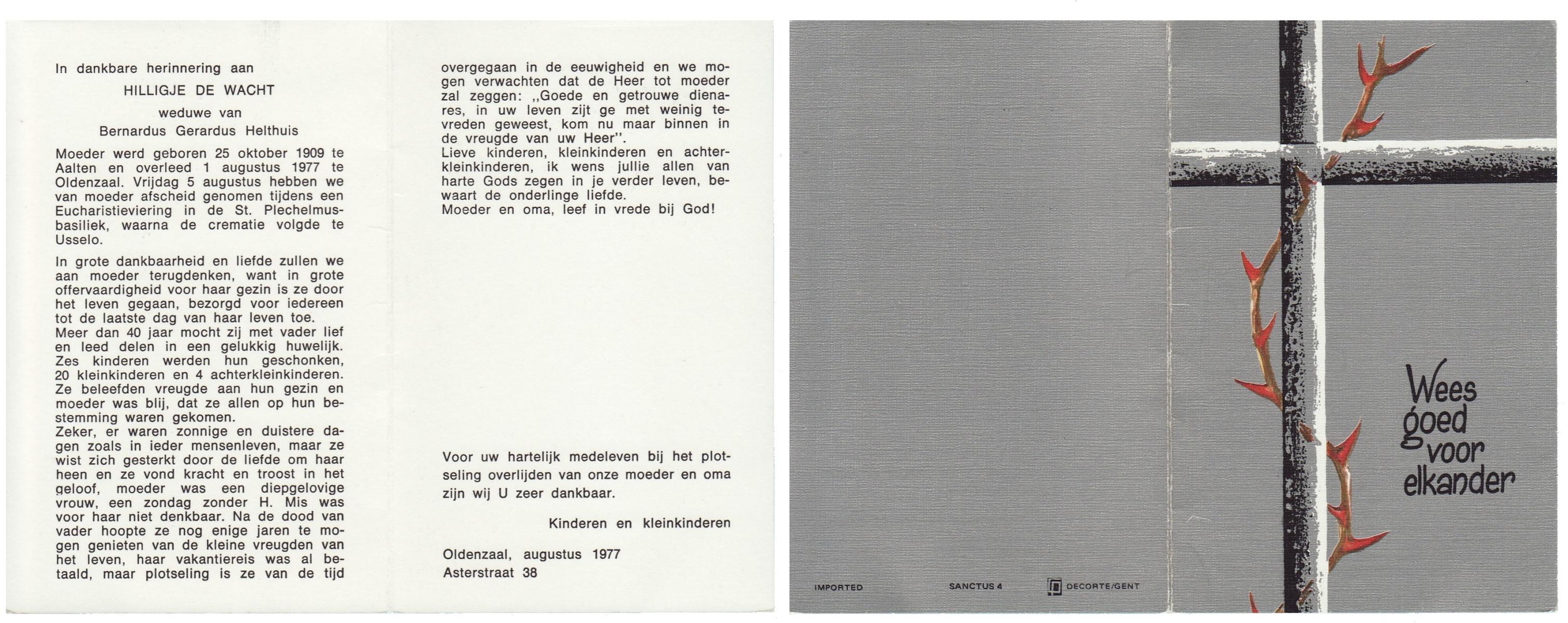 WACHT, de, Hilligje, geboren op 25-10-1909 te Aalten, overleden op 1-8-1977 te Oldenzaal op 67-jarige leeftijd, gecremeerd op 5-8-1977 te Usselo.