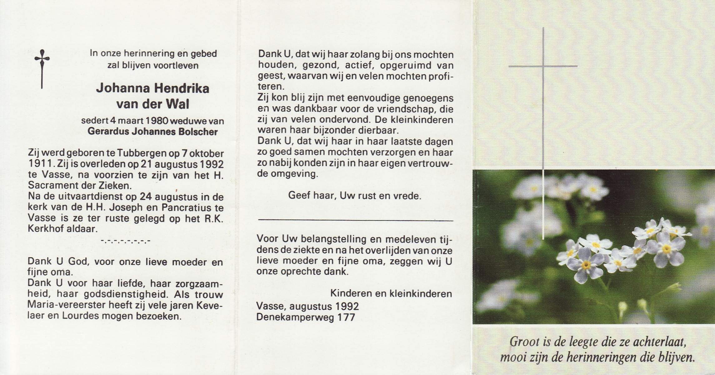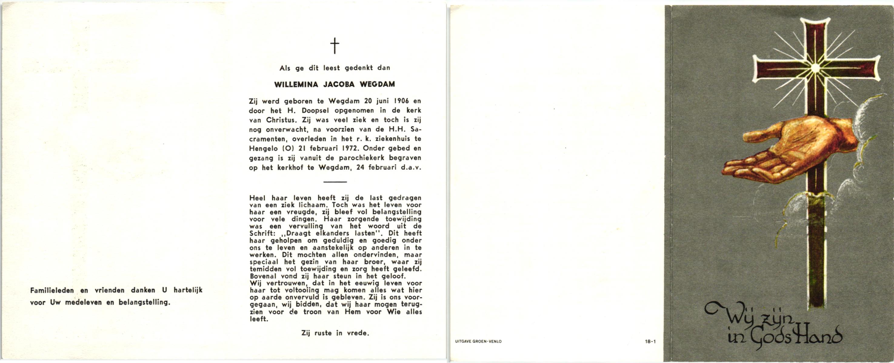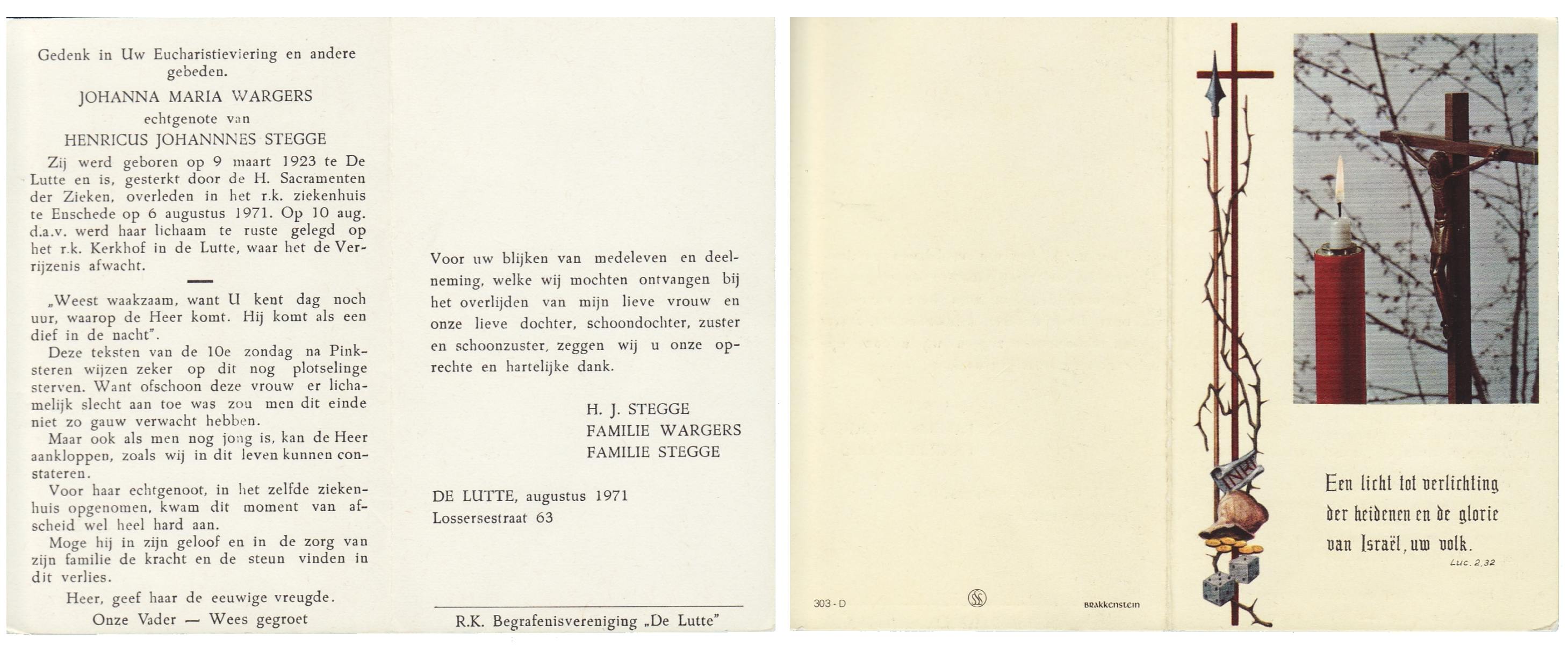 WACHT, de, Hilligje, geboren op 25-10-1909 te Aalten, overleden op 1-8-1977 te Oldenzaal op 67-jarige leeftijd, gecremeerd op 5-8-1977 te Usselo.