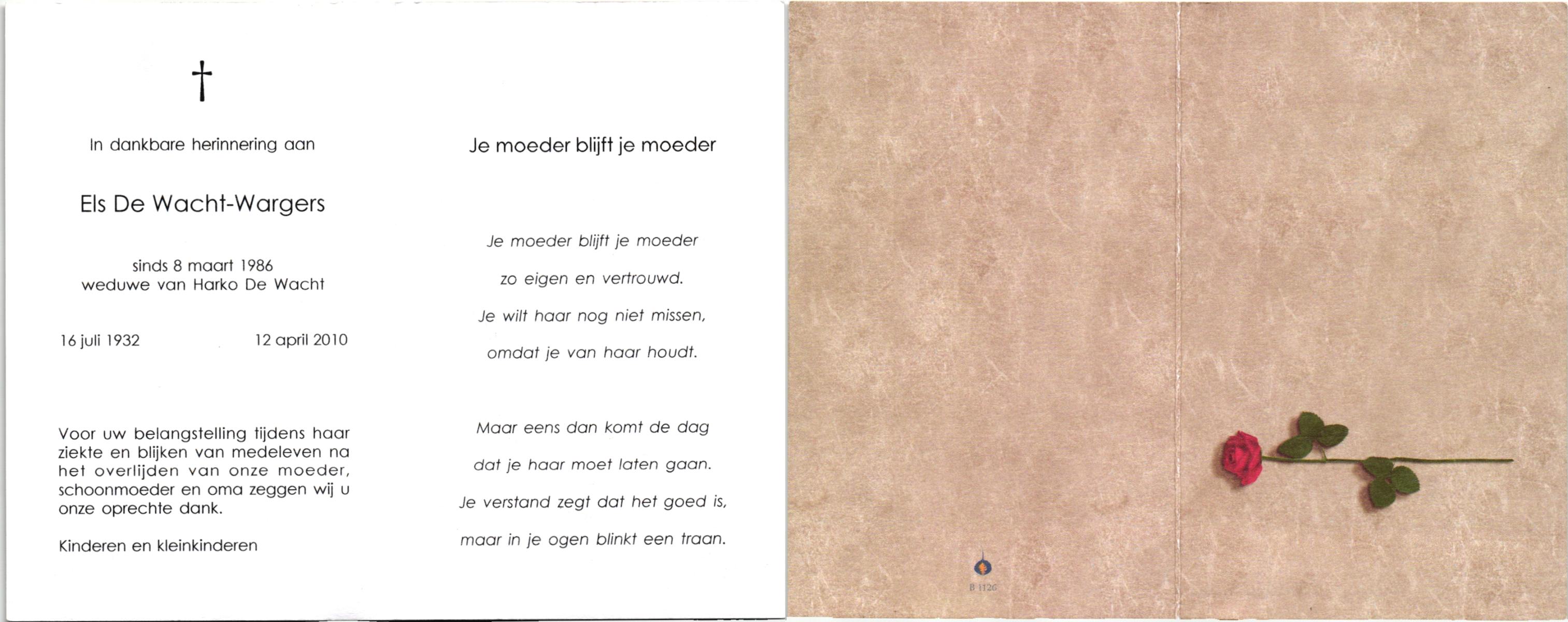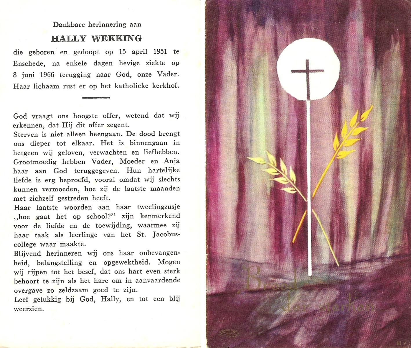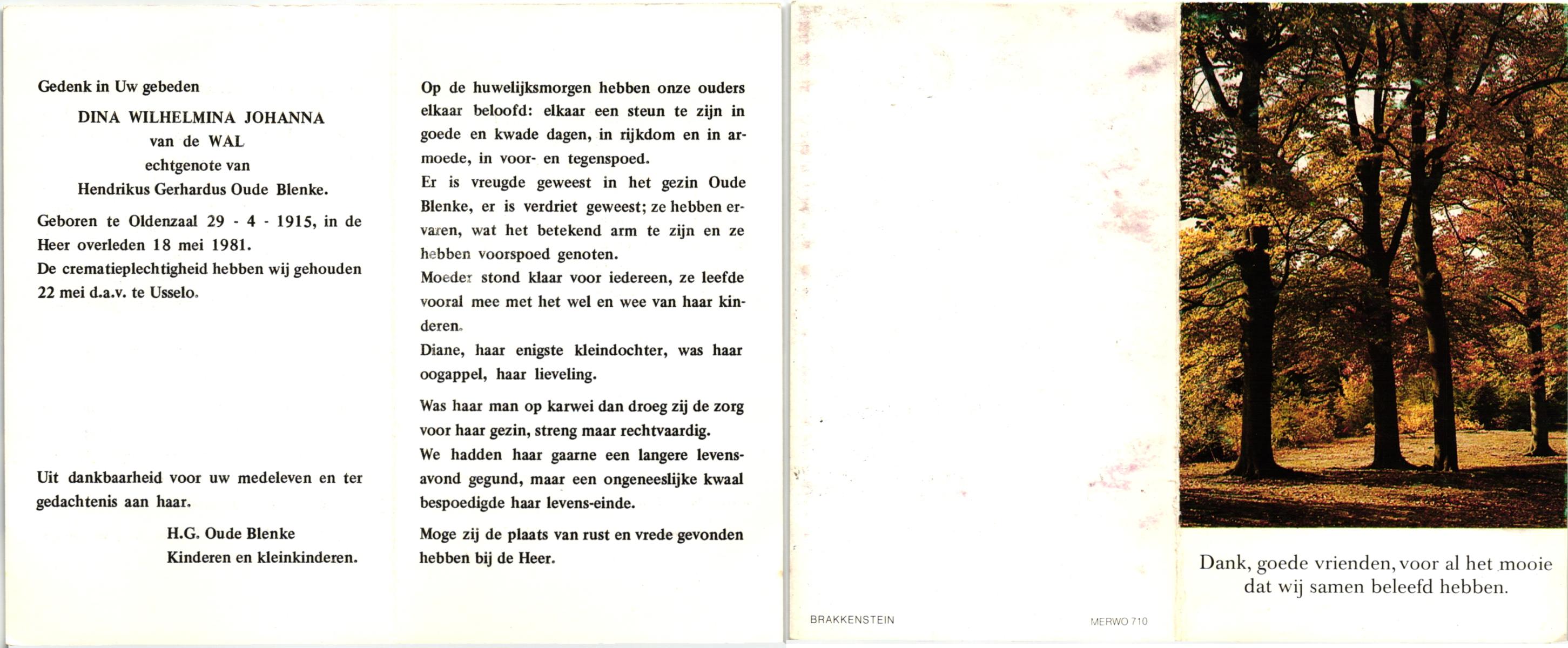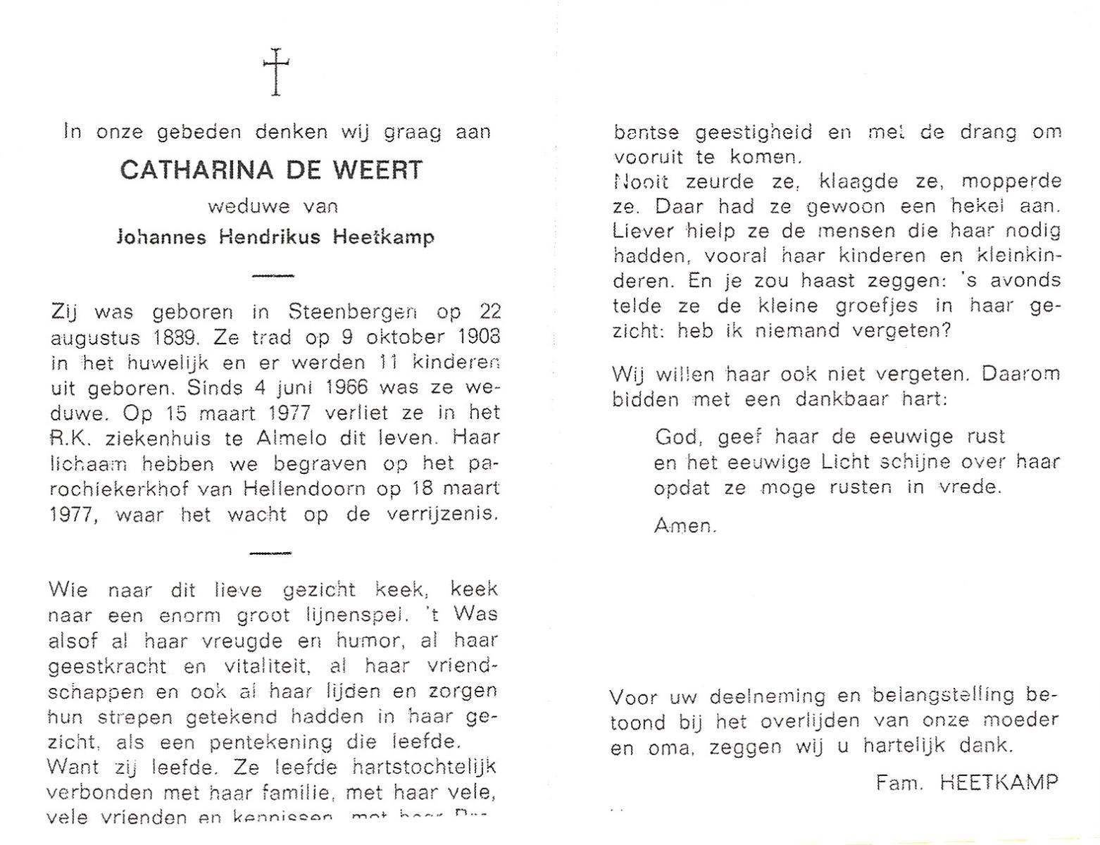 WACHT, de, Hilligje, geboren op 25-10-1909 te Aalten, overleden op 1-8-1977 te Oldenzaal op 67-jarige leeftijd, gecremeerd op 5-8-1977 te Usselo.