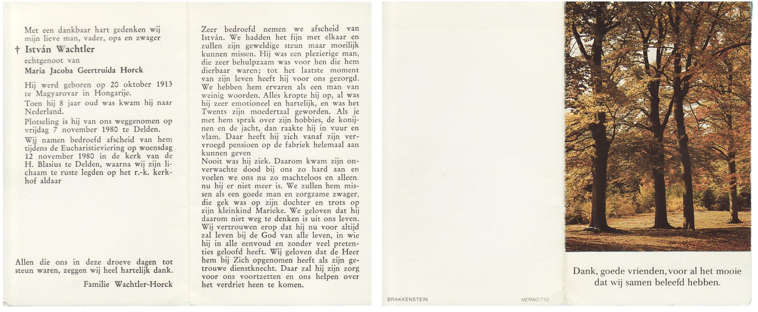WACHTLER, Istvan, geboren op 20-10-1913 te Magyarovar (Hon.), overleden op 7-11-1980 te Delden op 67-jarige leeftijd, begraven op 12-11-1980 te Delden.