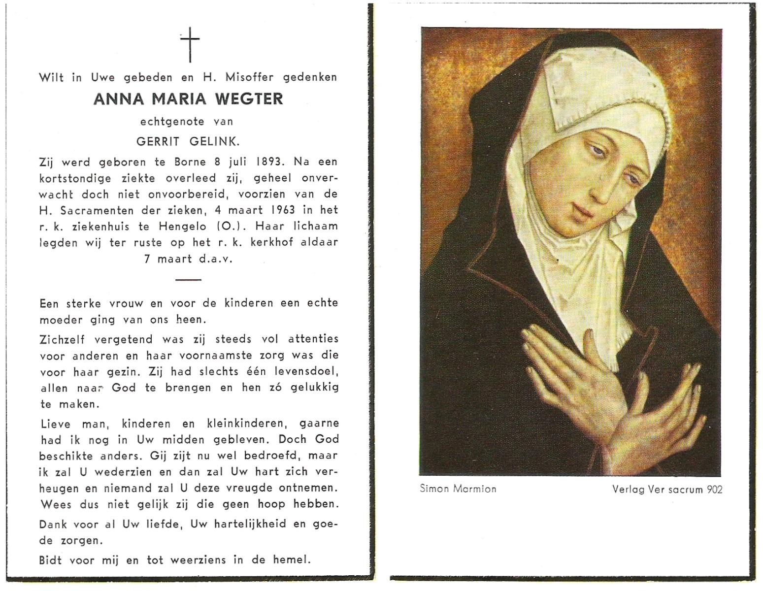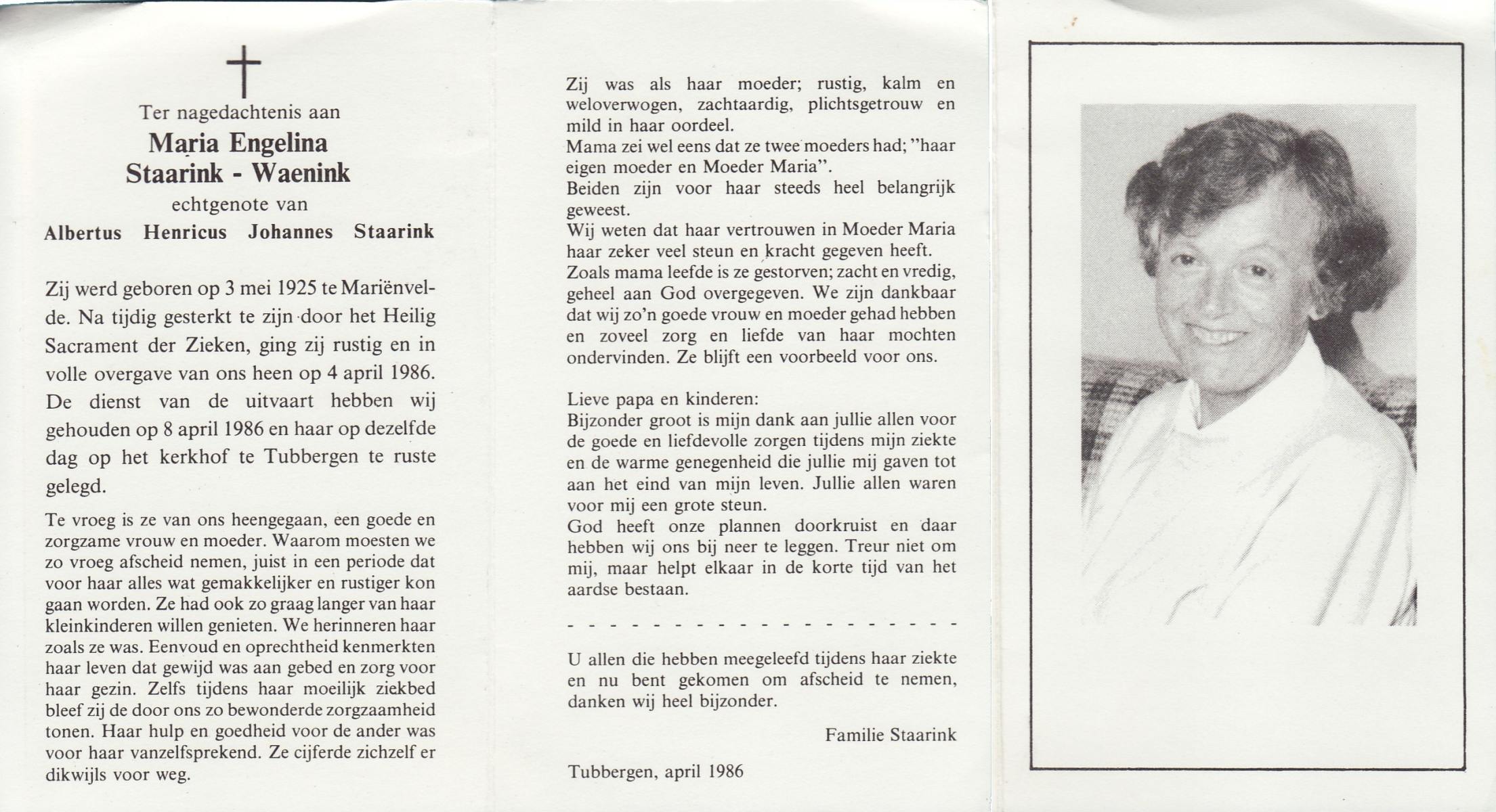 WAENINK, Maria Engelina, geboren op 3-5-1925 te Mariënvelde, overleden op 4-4-1986 op 60-jarige leeftijd, begraven op 8-4-1986 te Tubbergen.