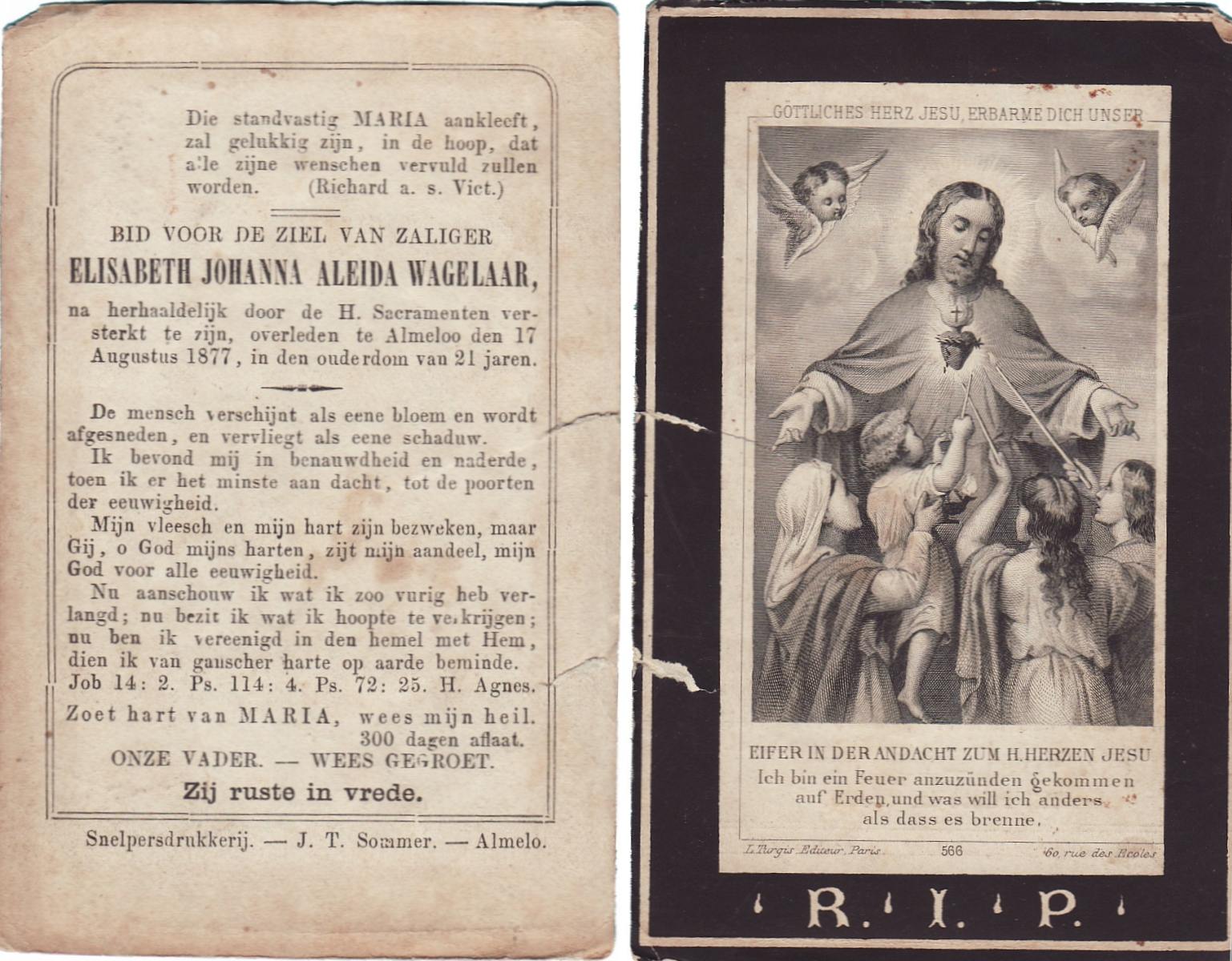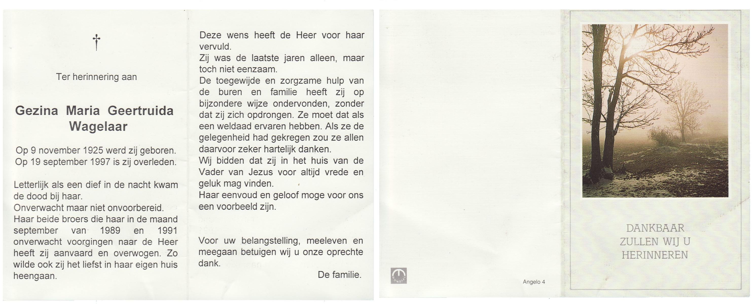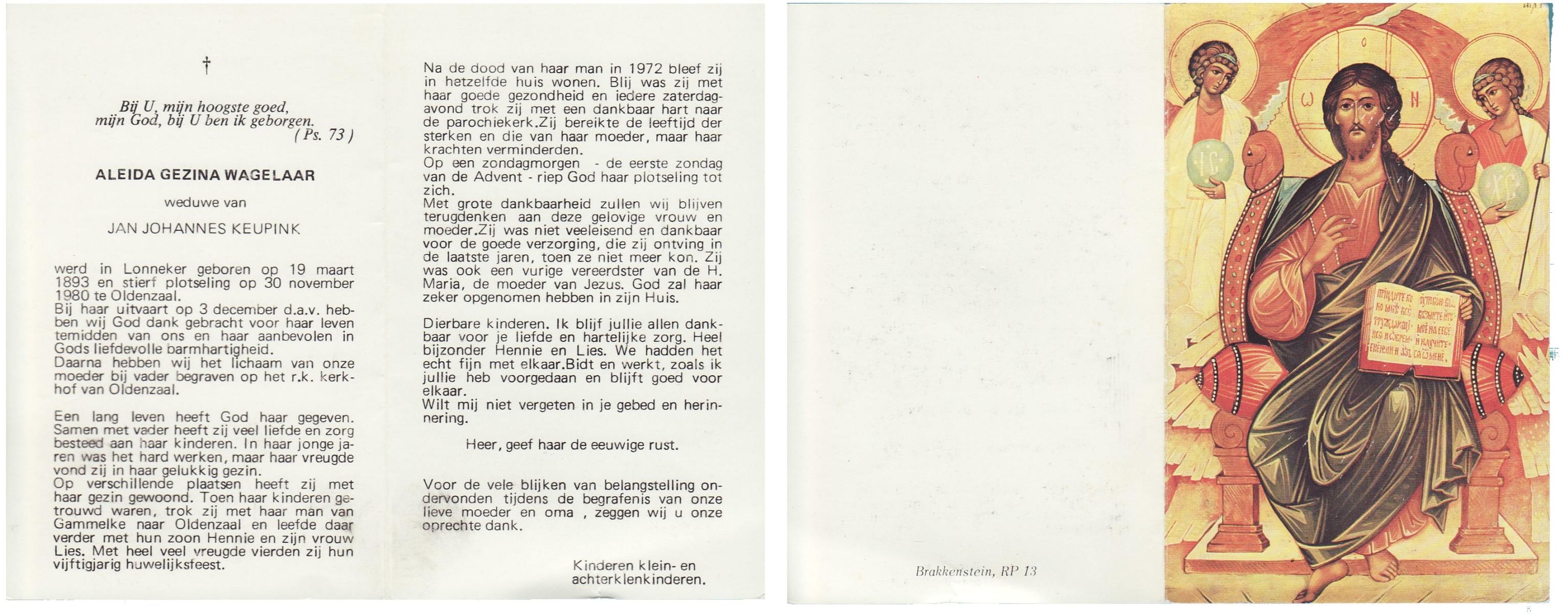 WAGELAAR, Aleida Gezina, geboren op 19-03-1893 te Lonneker, overleden op 30-11-1980 te Oldenzaal op 87-jarige leeftijd, begraven op 3-12-1980 te Oldenzaal.