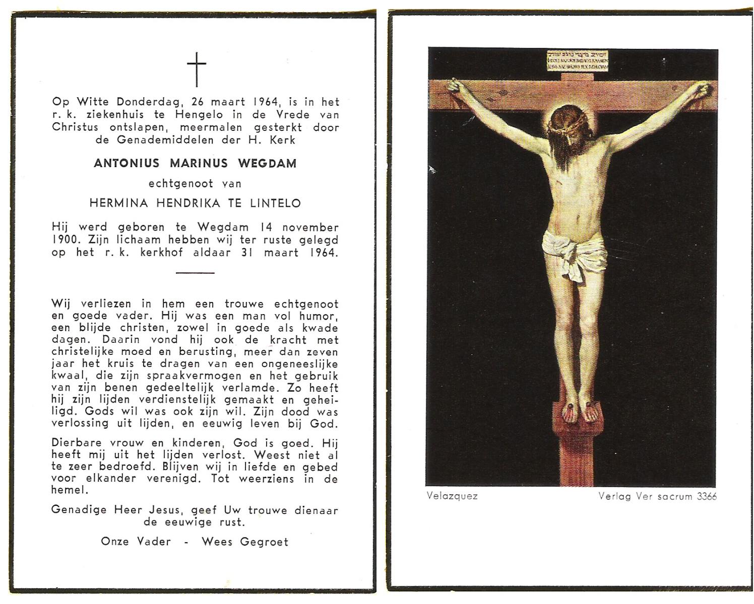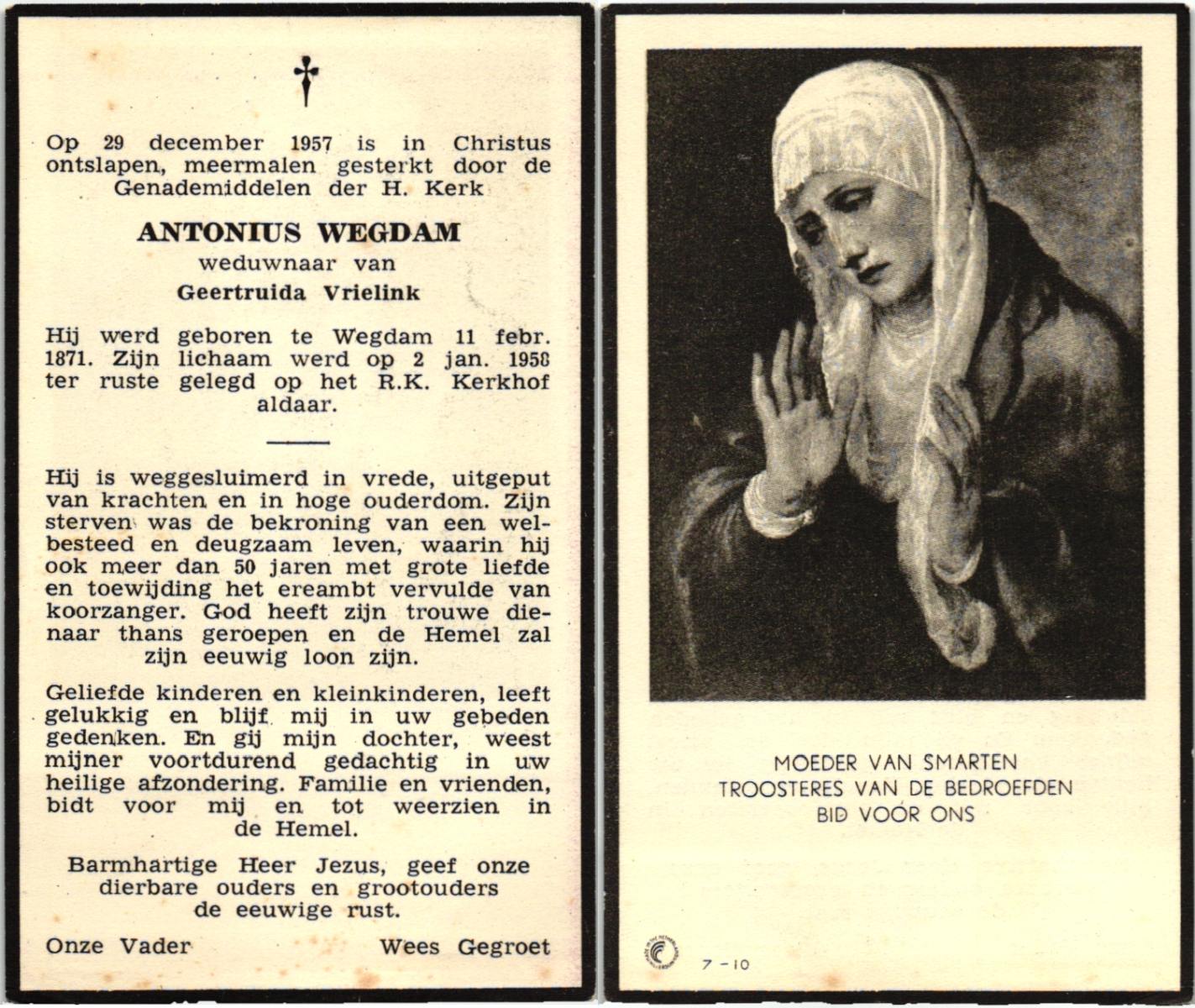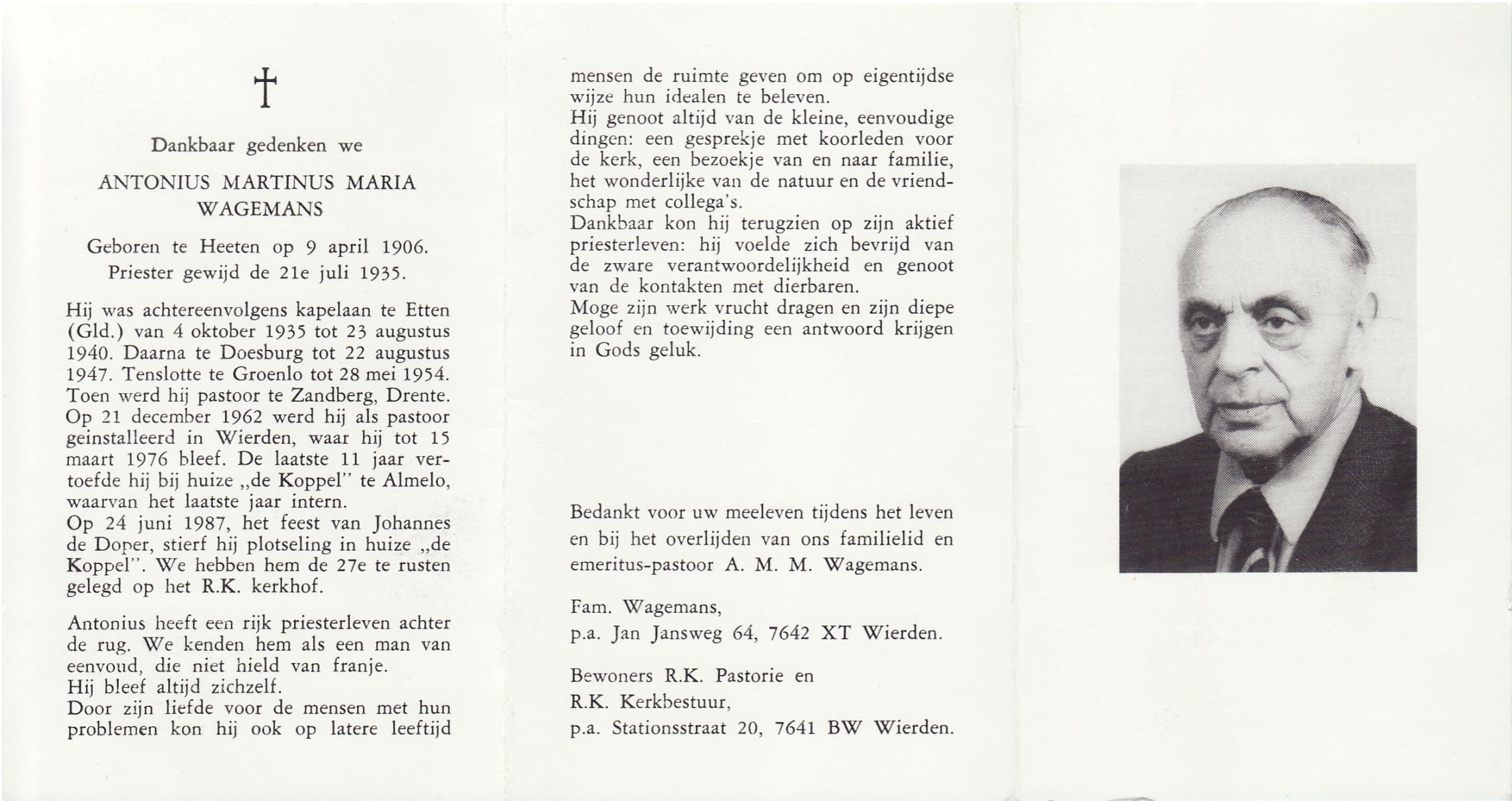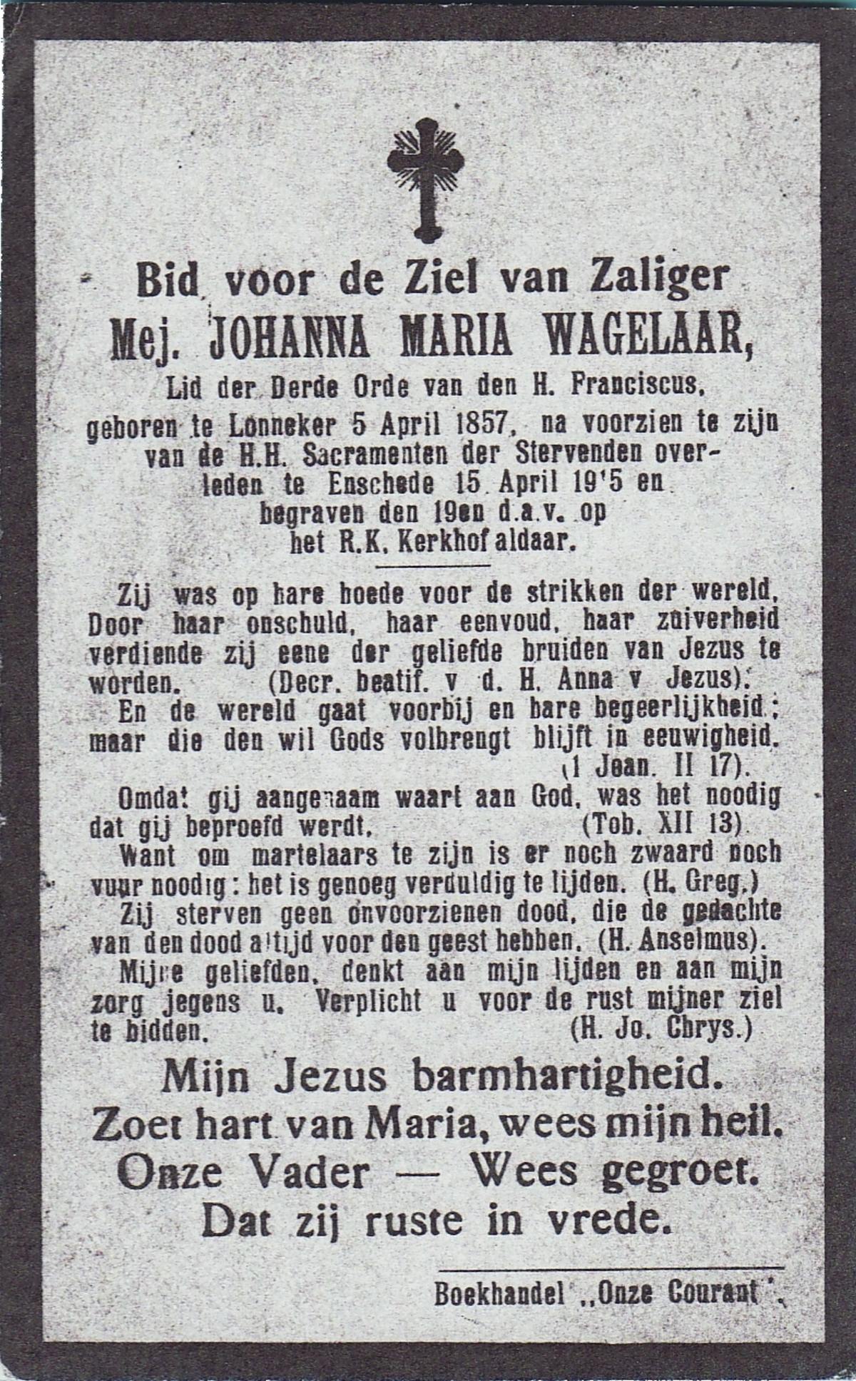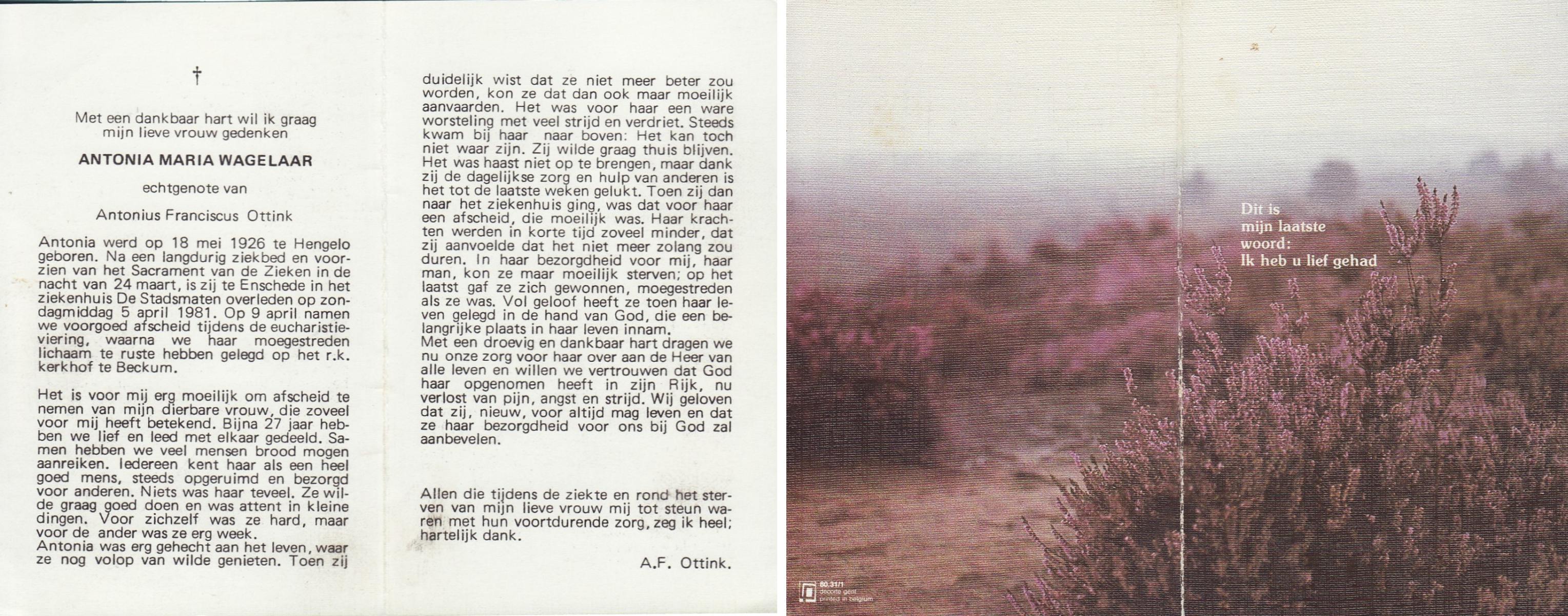 WAGELAAR, Antonia Maria, geboren op 18-5-1926 te Hengelo (O), overleden op 5-4-1981 te Enschede op 54-jarige leeftijd, begraven op 9-4-1981 te Beckum.