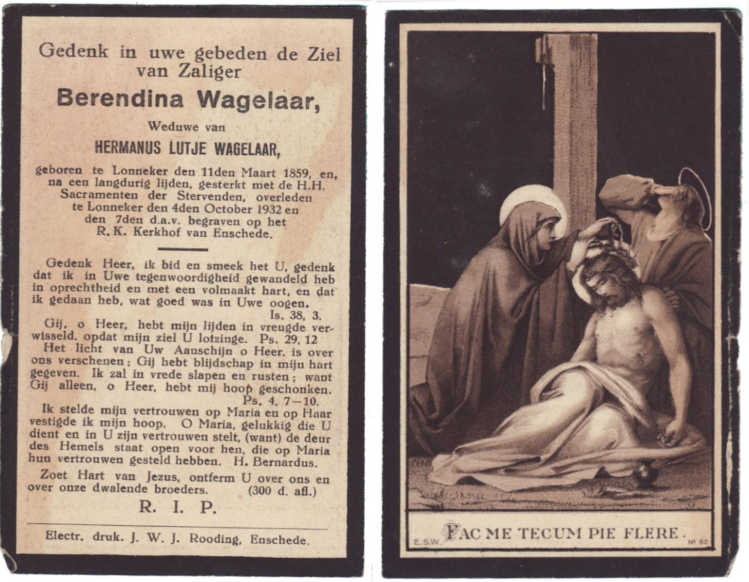WAGELAAR, Berendina, geboren op 11-03-1859 te Lonneker, overleden op 4-10-1932 te Lonneker op 73-jarige leeftijd, begraven op 7-10-1932 te Enschede.