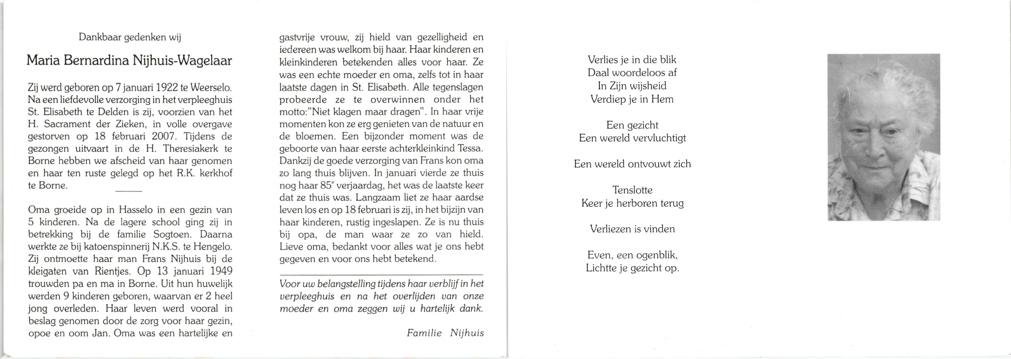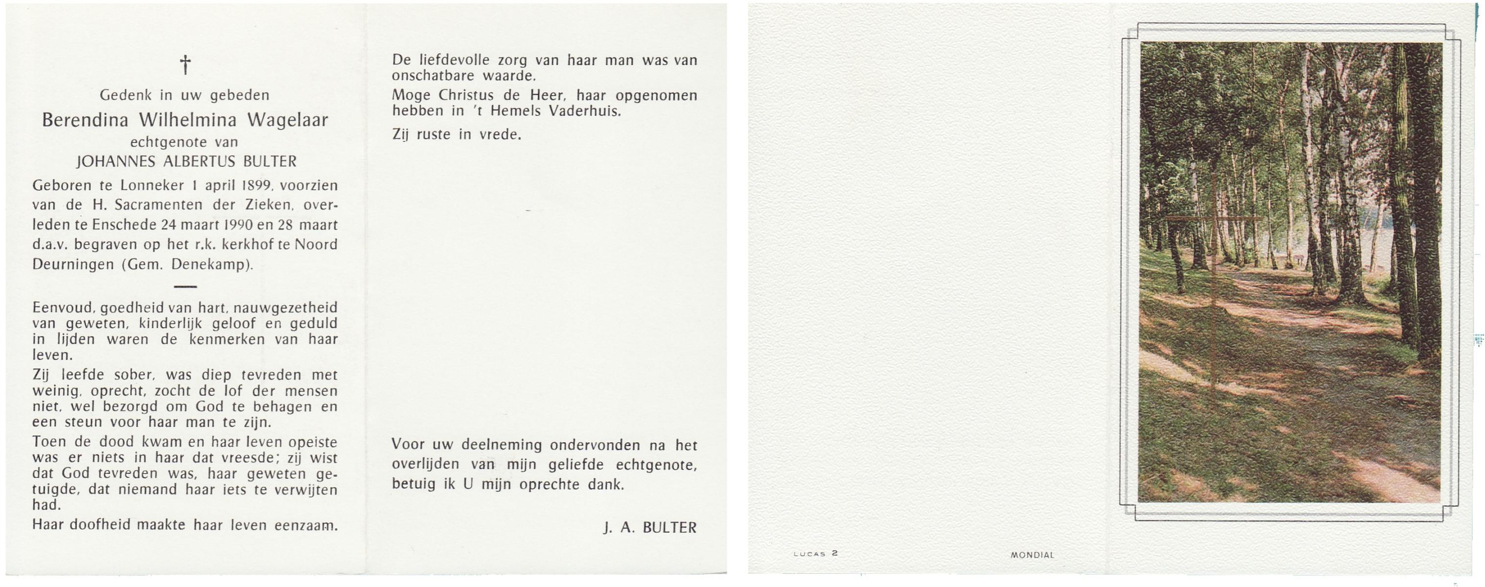 WAGELAAR, Berendina Wilhelmina, geboren op 01-04-1899 te Lonneker, overleden op 24-3-1990 te Enschede op 90-jarige leeftijd, begraven op 28-3-1990 te Noord Deurningen.