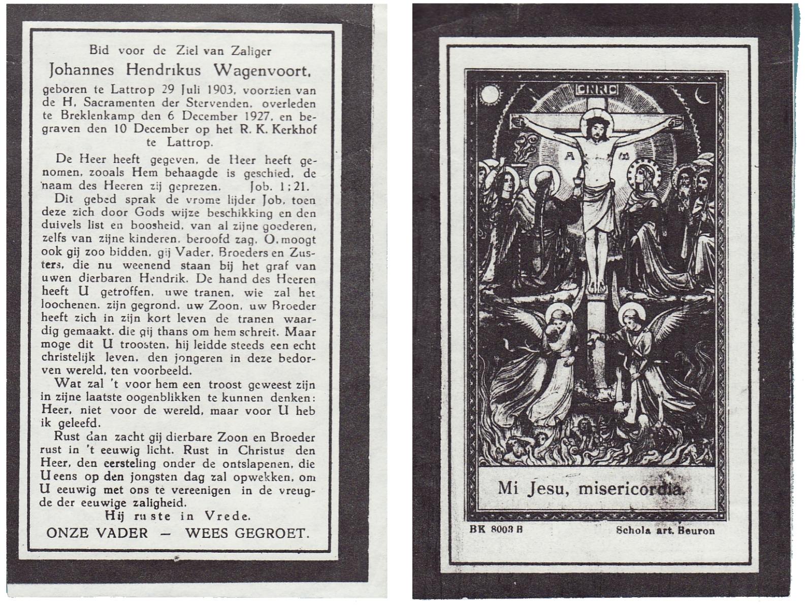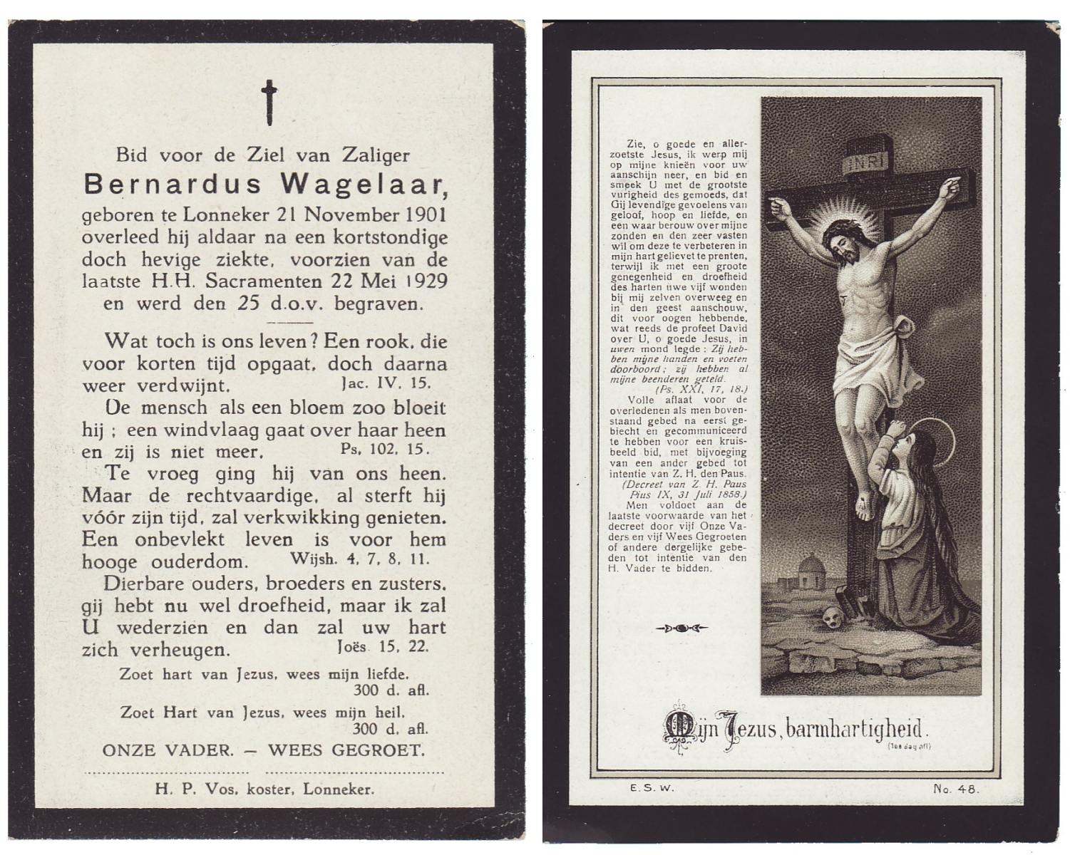 WAGELAAR, Bernardus, geboren op 21-11-1901 te Lonneker, overleden op 22-5-1929 te Lonneker op 27-jarige leeftijd, begraven op 25-5-1929 te Lonneker.