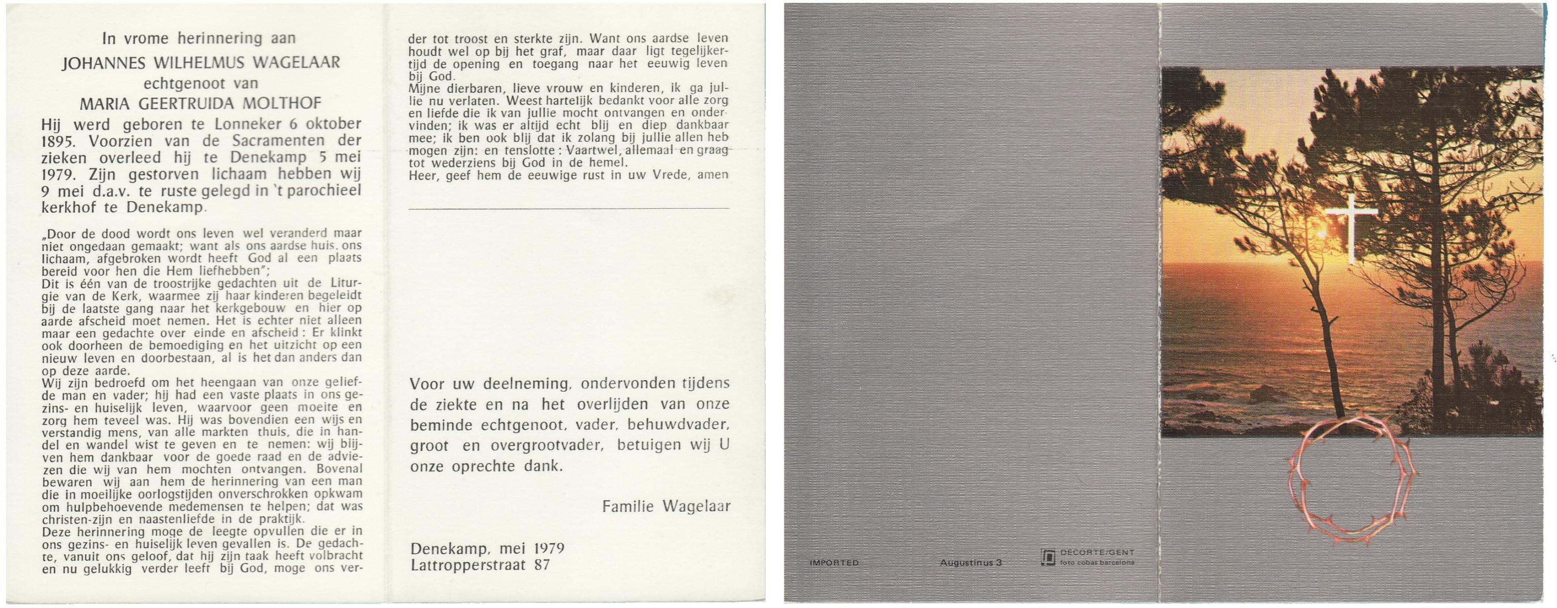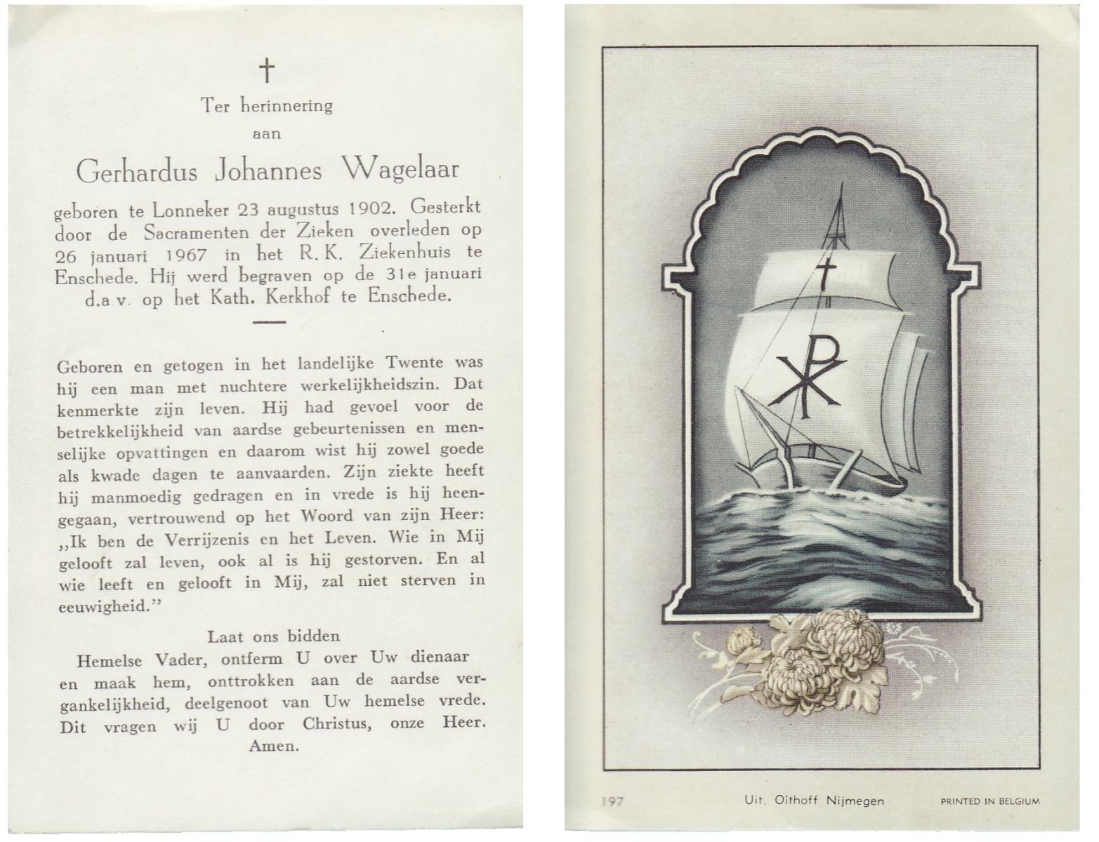 WAGELAAR, Gerhardus Johannes, geboren op 23-8-1902 te Lonneker, overleden op 26-1-1967 te Enschede op 64-jarige leeftijd, begraven op 31-1-1967 te Enschede.
