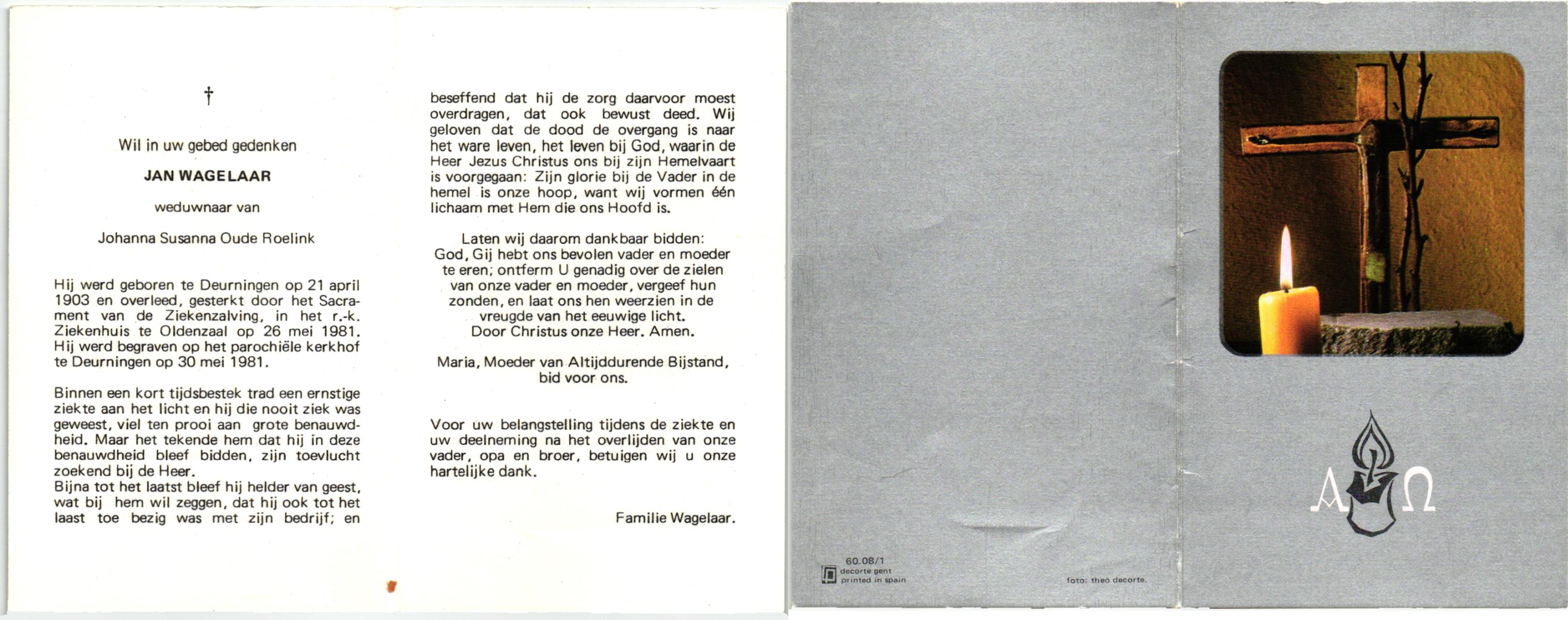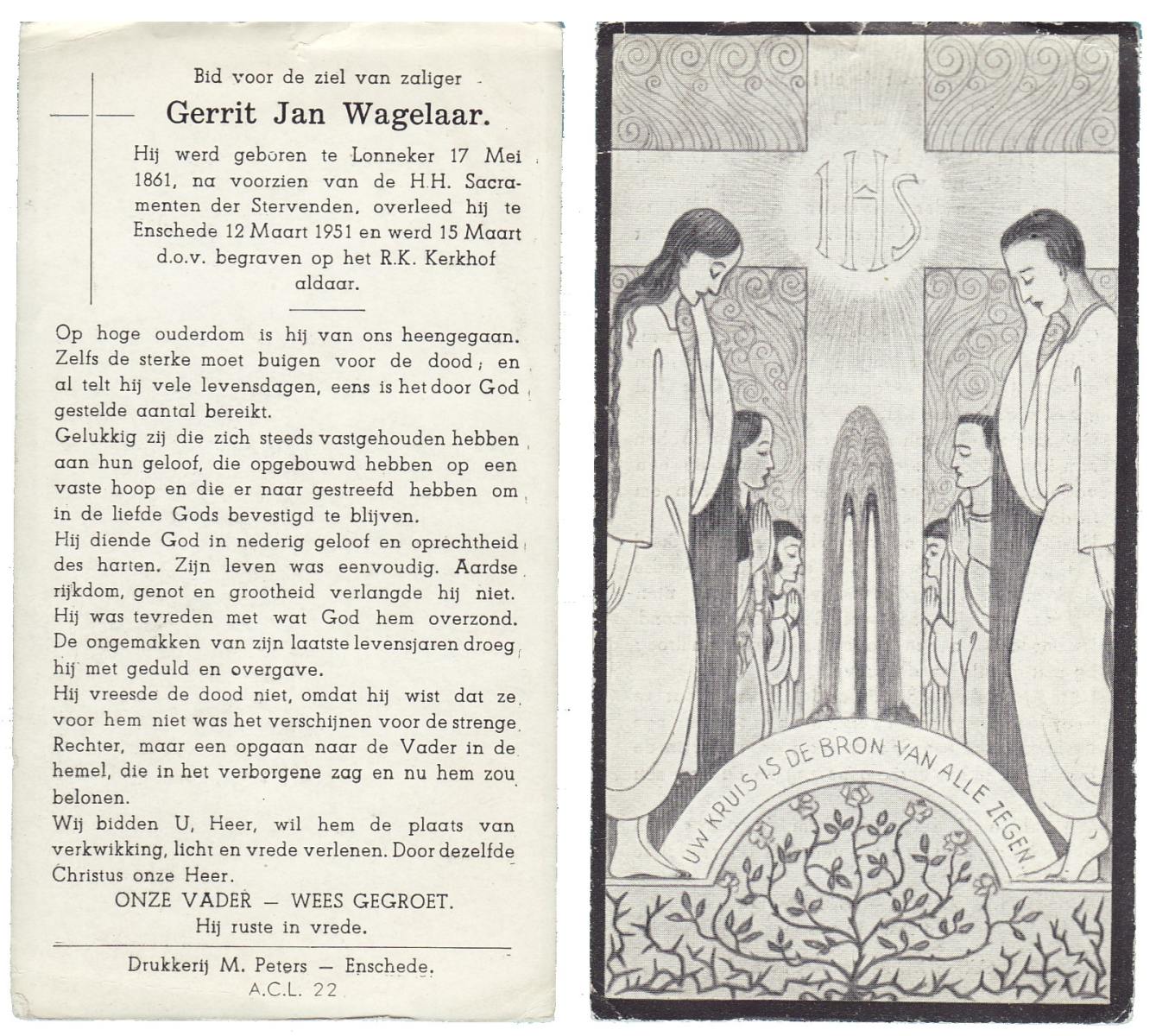 WAGELAAR, Gerrit Jan, geboren op 17-05-1861 te Lonneker, overleden op 12-3-1951 te Enschede op 89-jarige leeftijd, begraven op 15-3-1951 te Enschede.