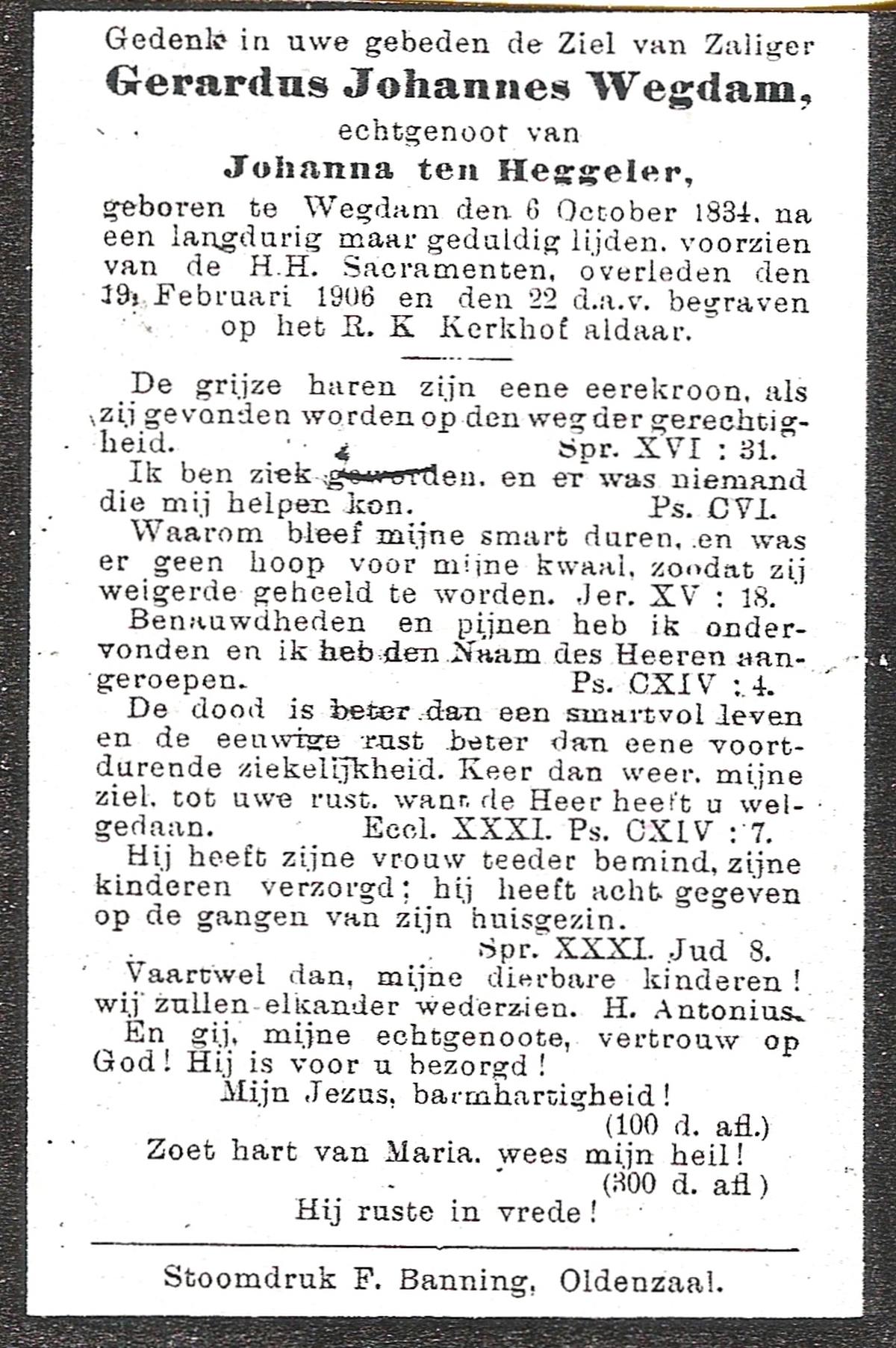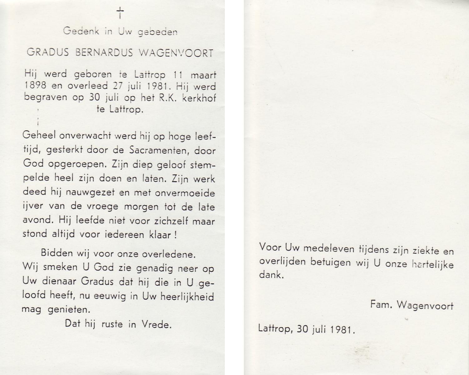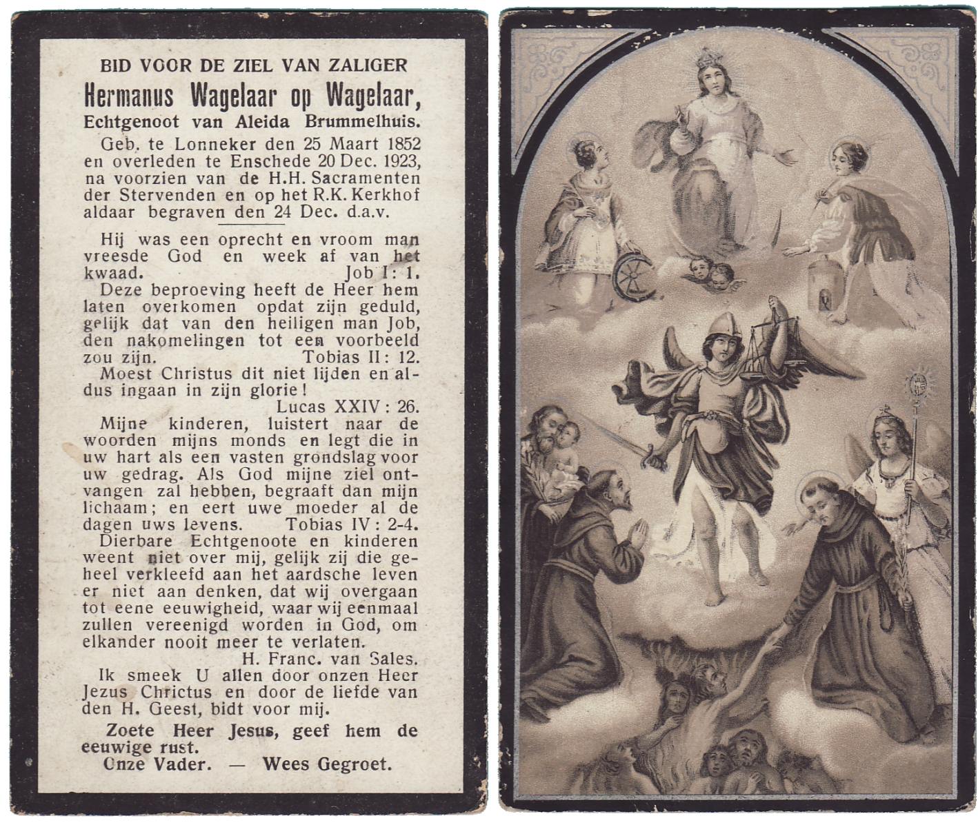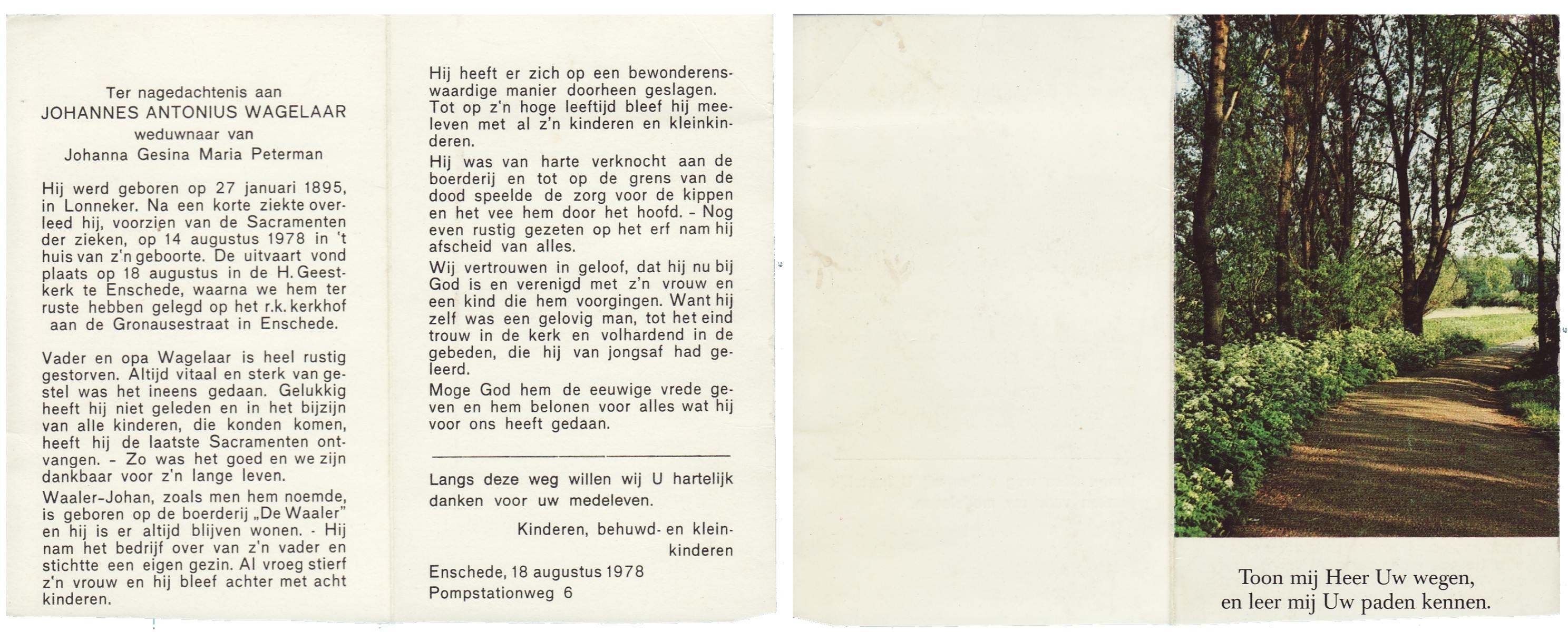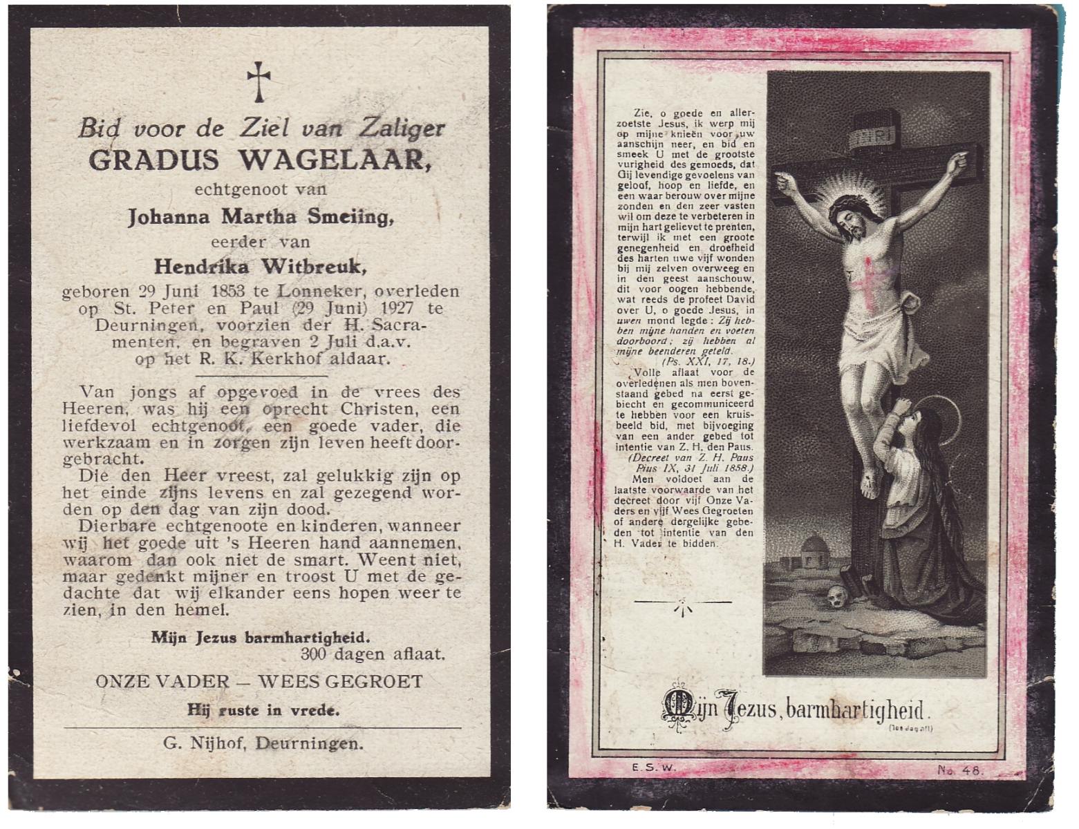 WAGELAAR, Gradus, geboren op 29-06-1853 te Lonneker, overleden op 29-6-1927 te Deurningen op 74-jarige leeftijd, begraven op 2-7-1927 te Deurningen.