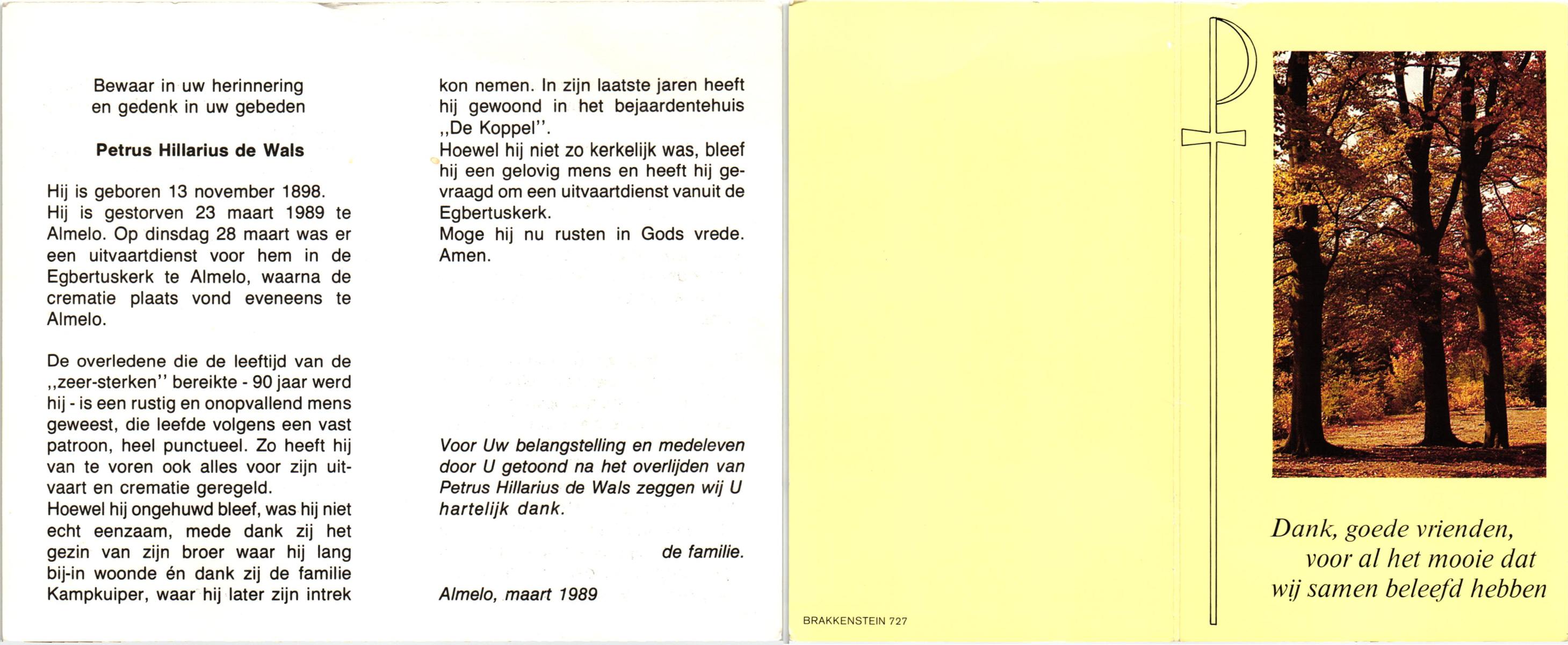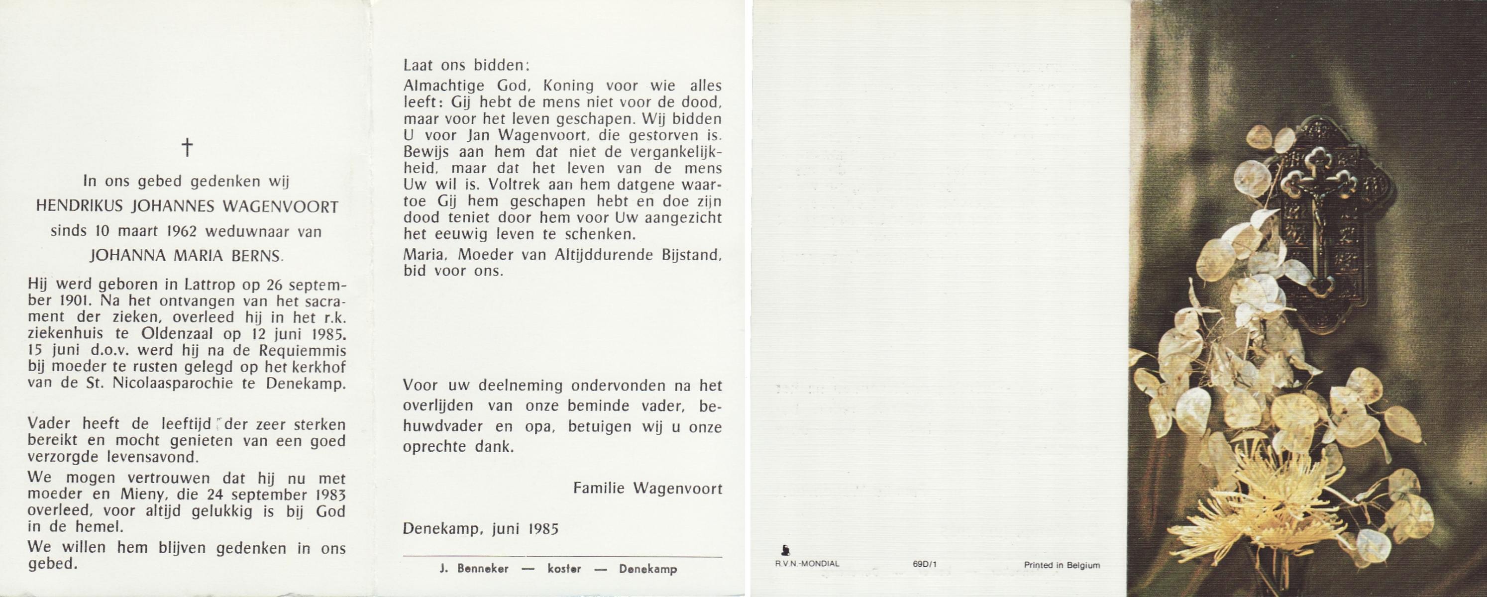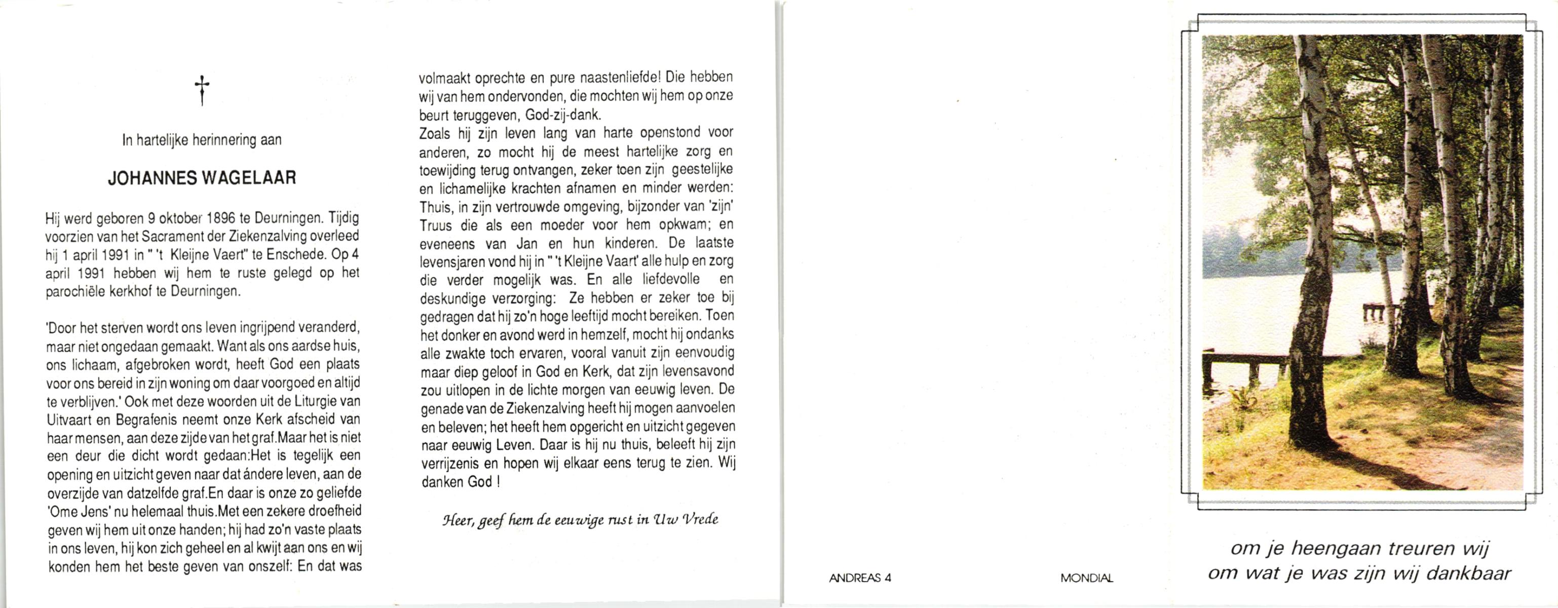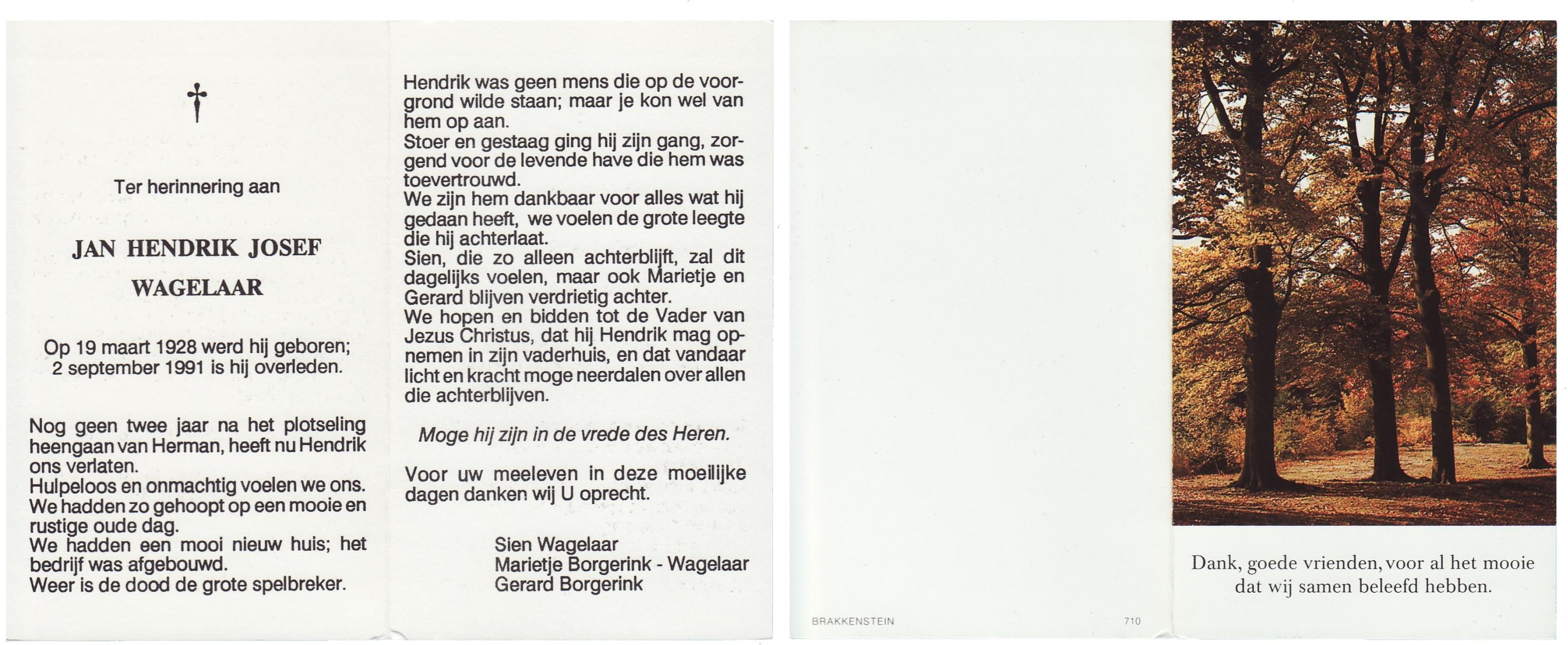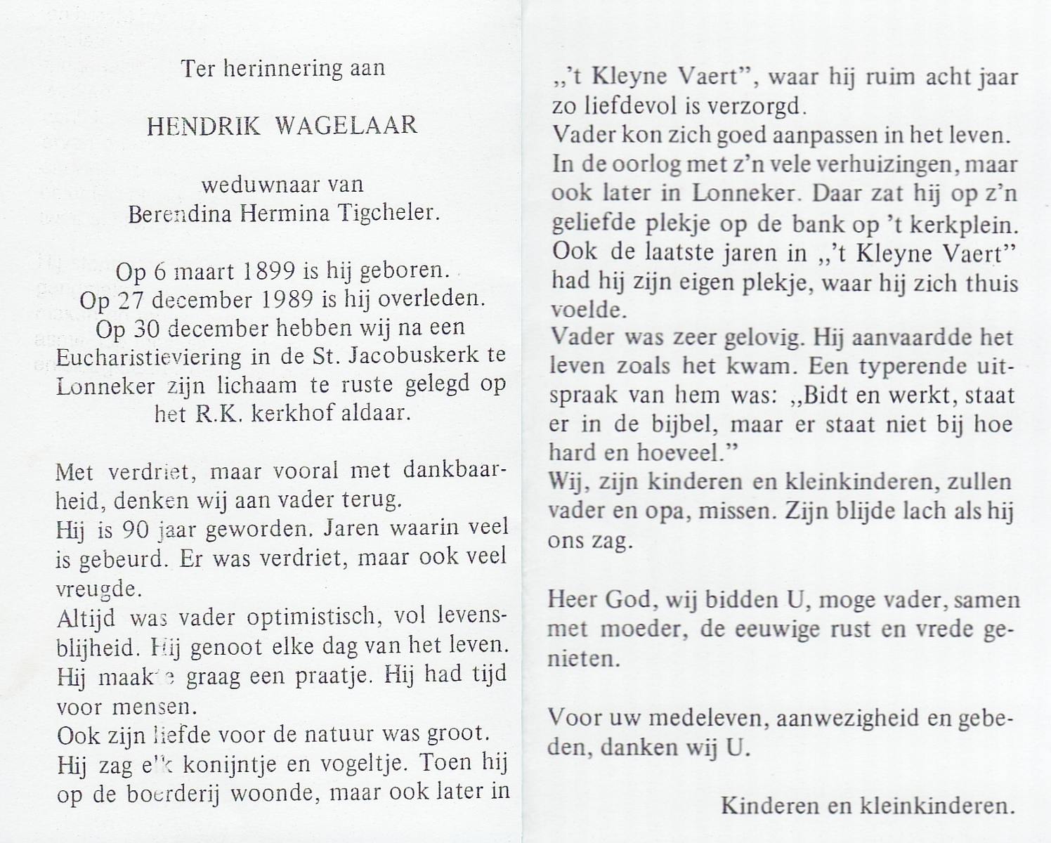 WAGELAAR, Hendrik, geboren op 06-03-1899, overleden op 27-12-1989 op 90-jarige leeftijd, begraven op 30-12-1989 te Lonneker.
