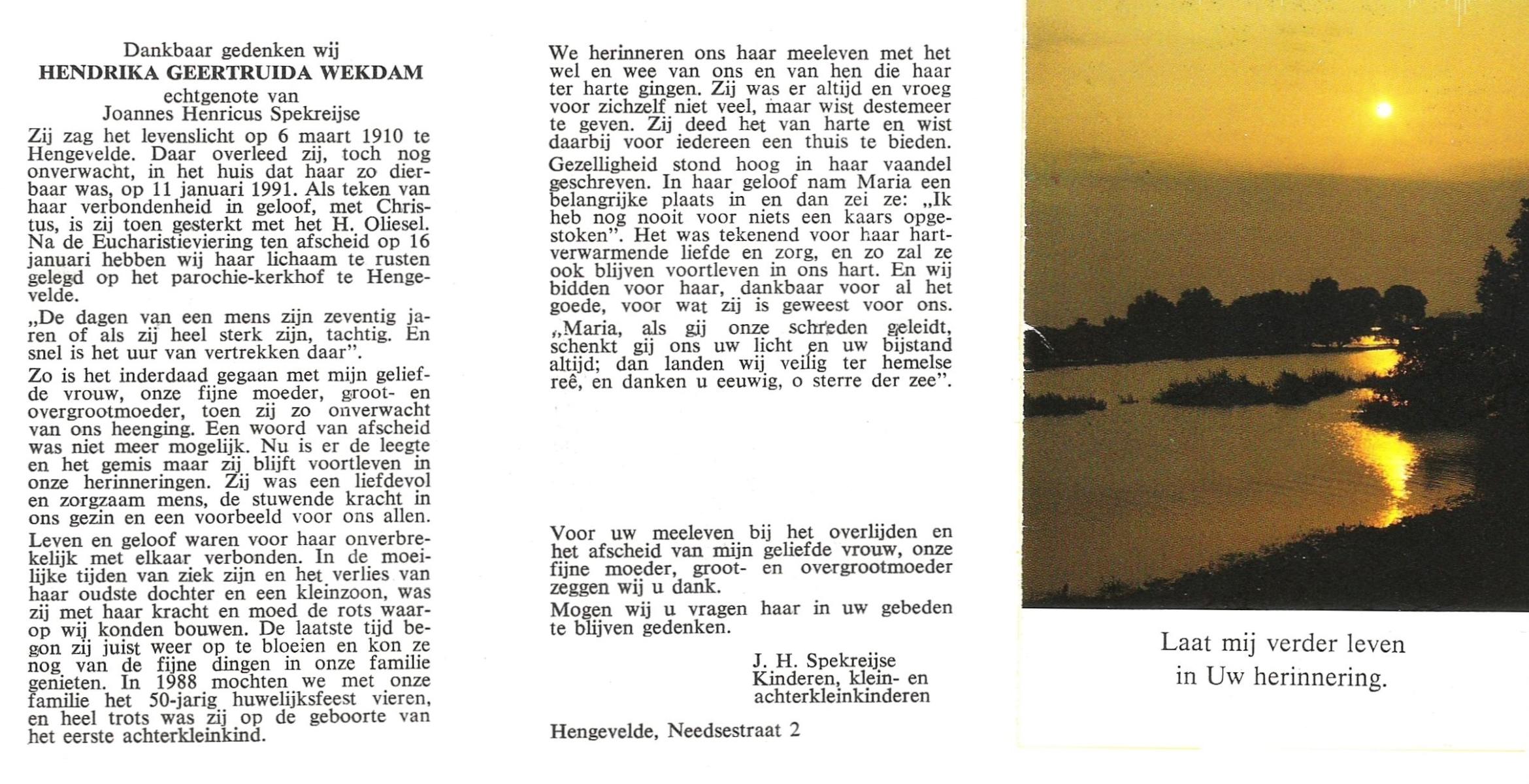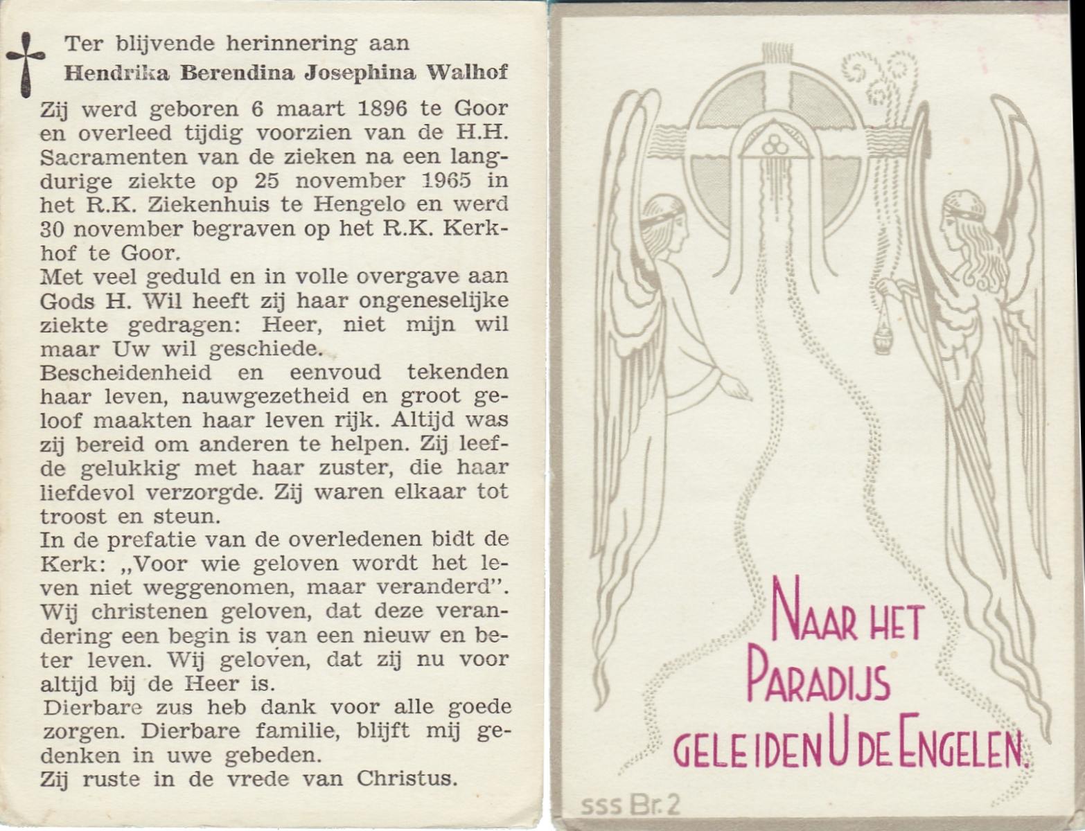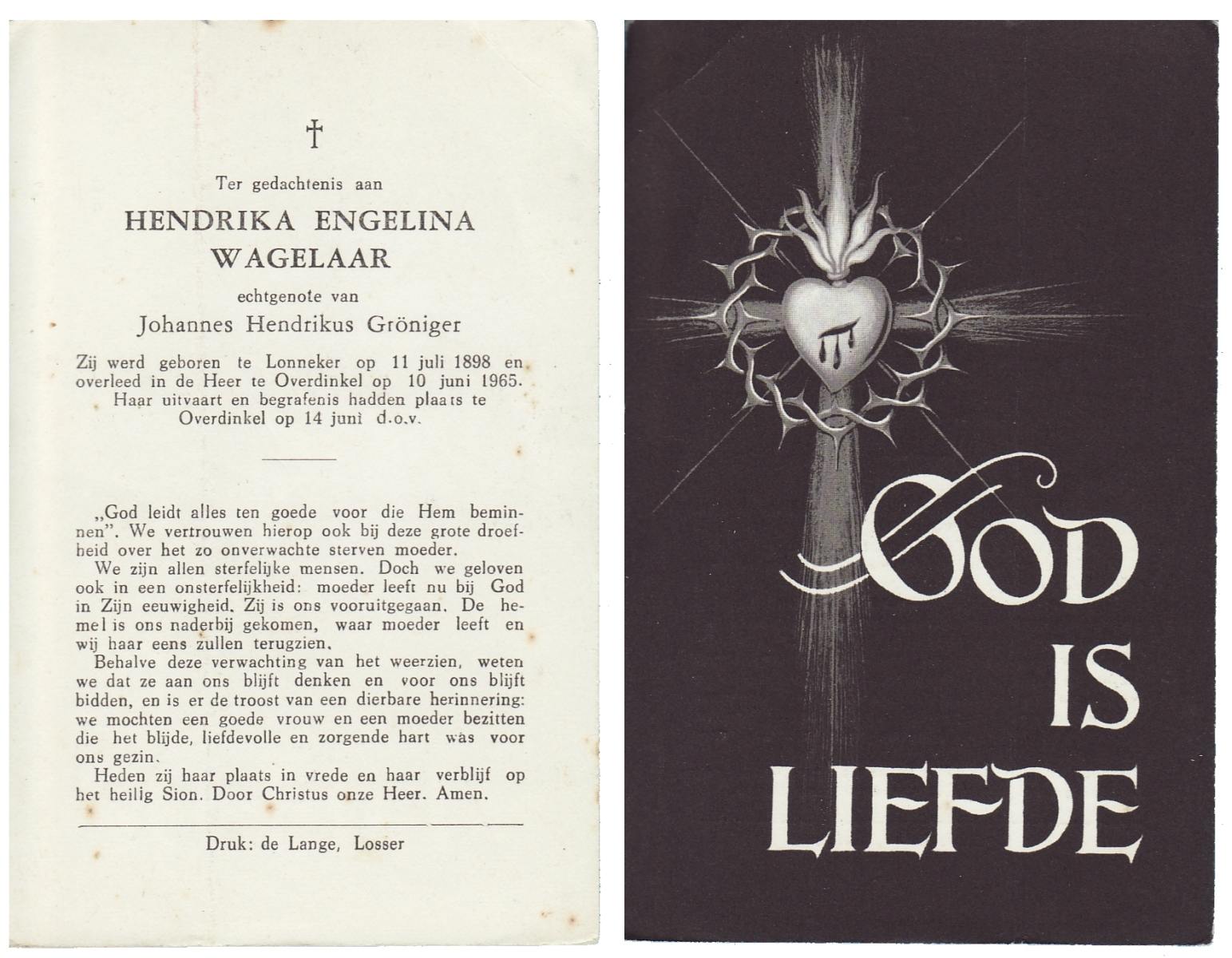 WAGELAAR, Hendrika Engelina, geboren op 11-07-1898 te Lonneker, overleden op 10-6-1965 te Overdinkel op 66-jarige leeftijd, begraven op 14-6-1965 te Overdinkel.