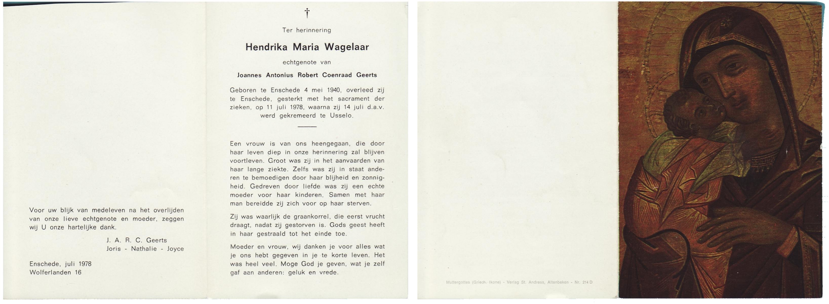WAGELAAR, Hendrika Maria, geboren op 4-5-1940 te Enschede, overleden op 11-7-1978 te Enschede op 38-jarige leeftijd, gecremeerd op 14-7-1978 te Usselo.