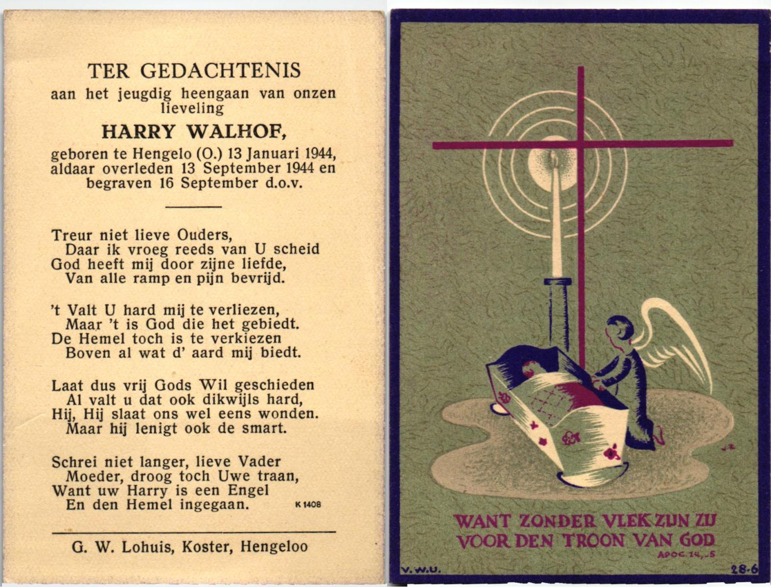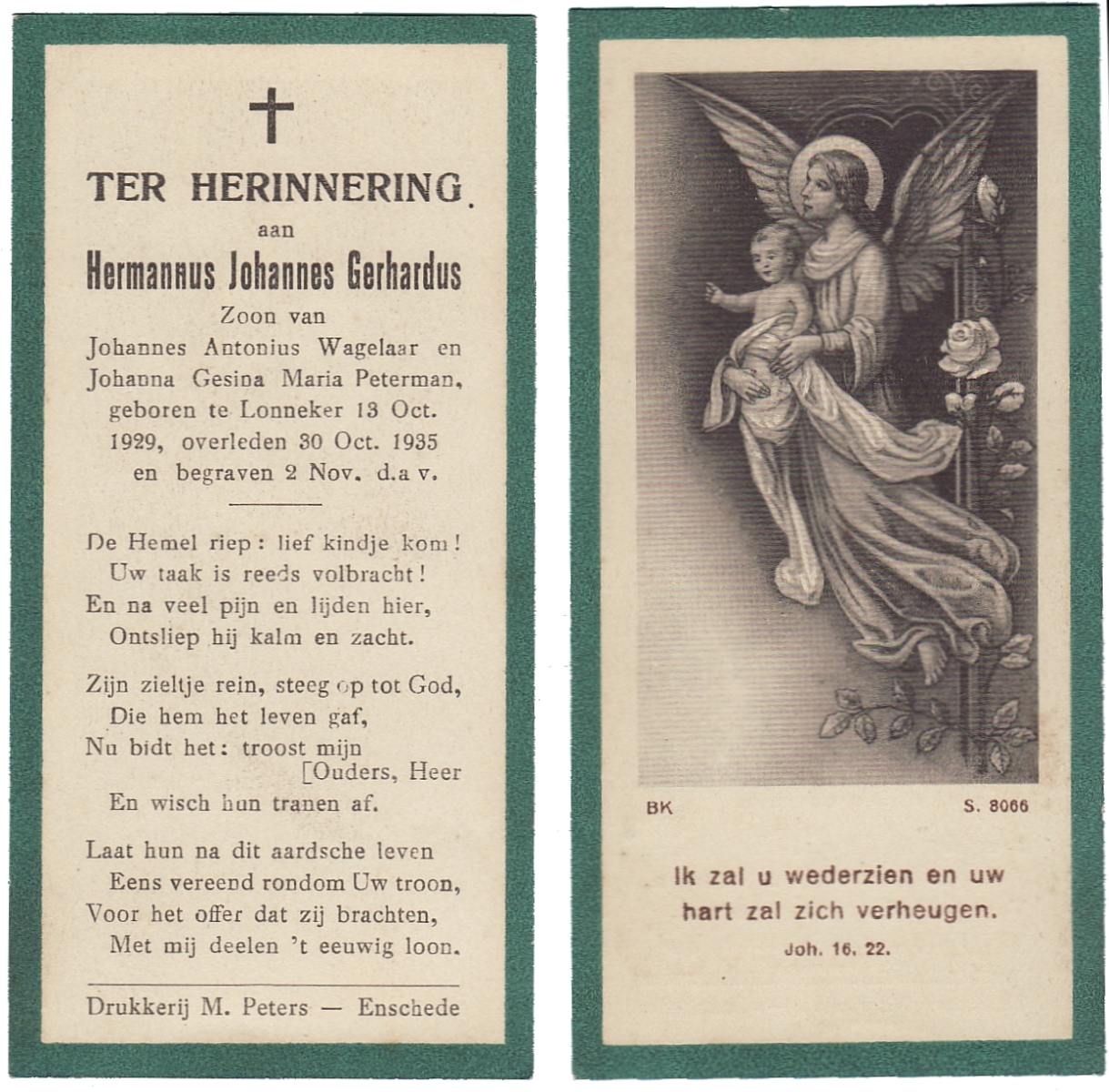 WAGELAAR, Hermannus Johannes, geboren op 13-10-1929 te Lonneker, overleden op 30-10-1935 te Lonneker op 6-jarige leeftijd, begraven op 2-11-1935 te Lonneker.