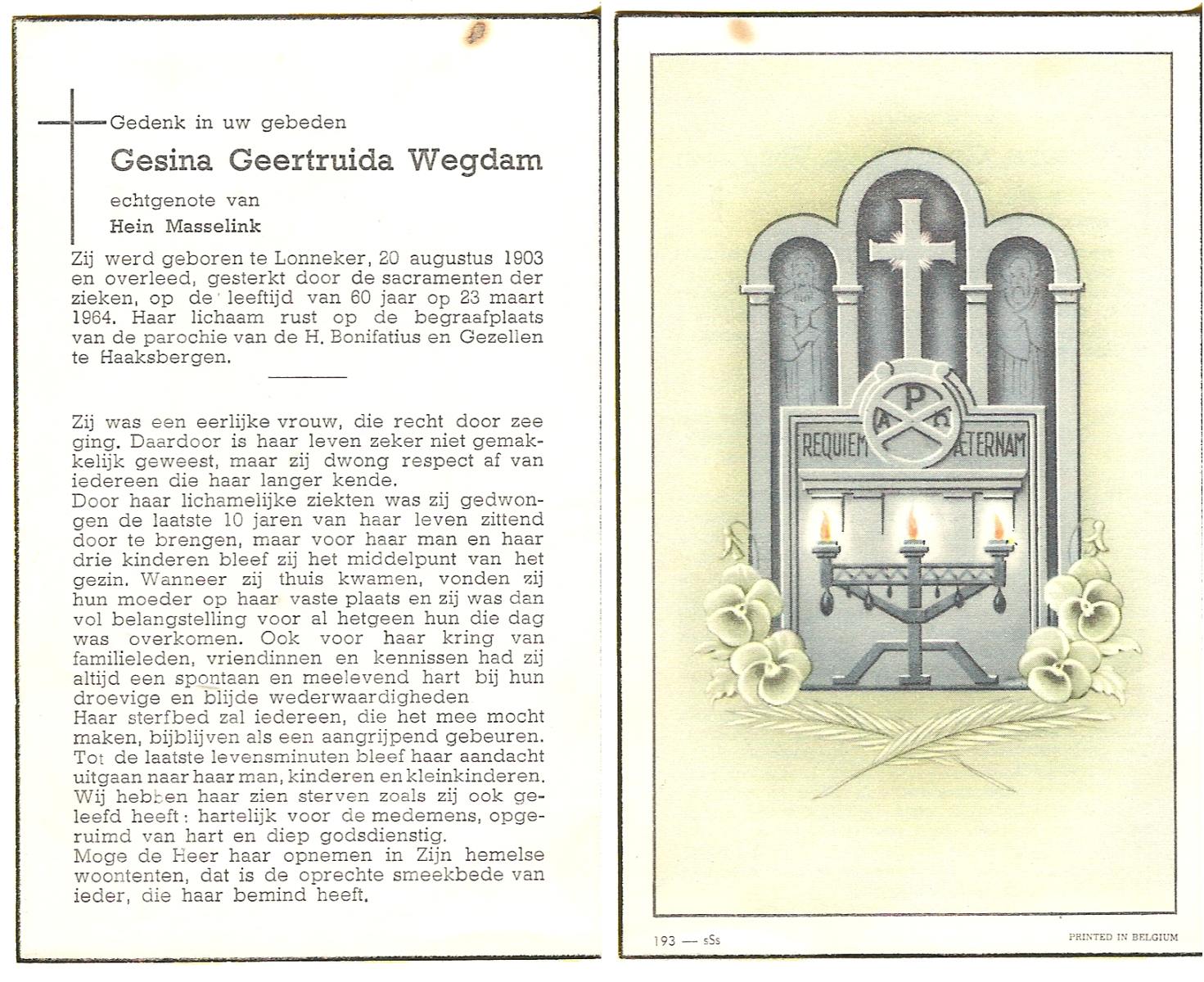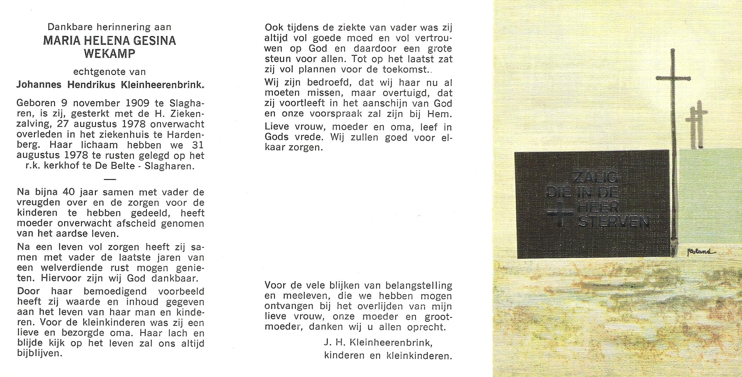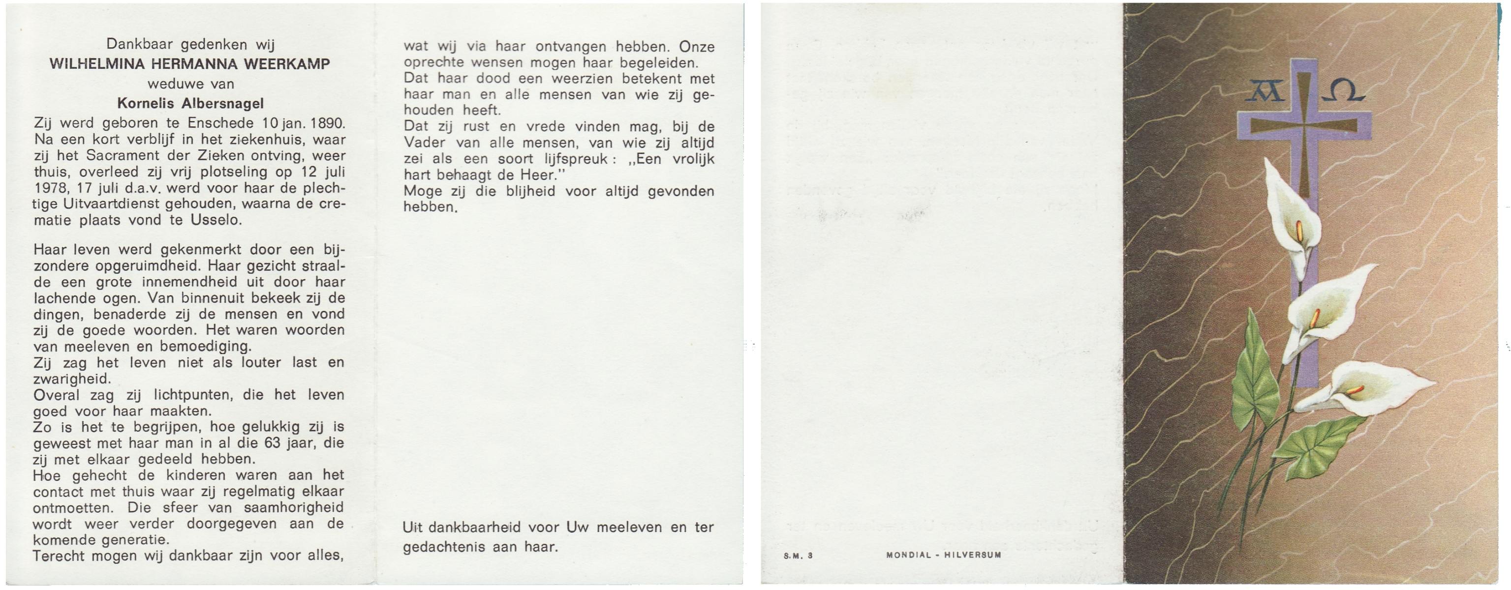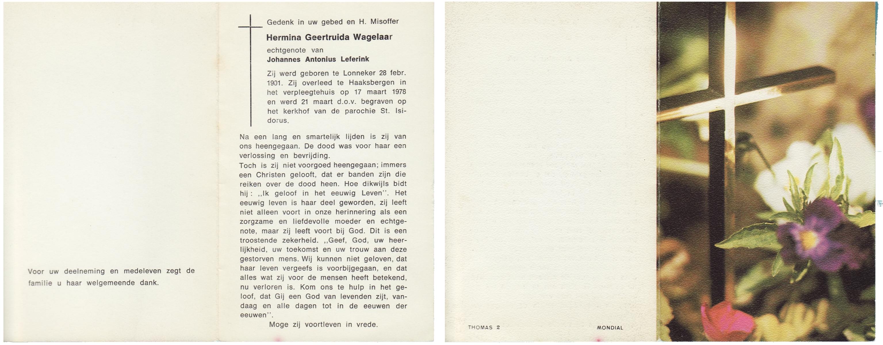 WAGELAAR, Hermina Geertruida, geboren op 28-2-1901 te Lonneker, overleden op 17-3-1978 te Haaksbergen op 77-jarige leeftijd, begraven op 21-3-1978 te St.Isidorushoeve.