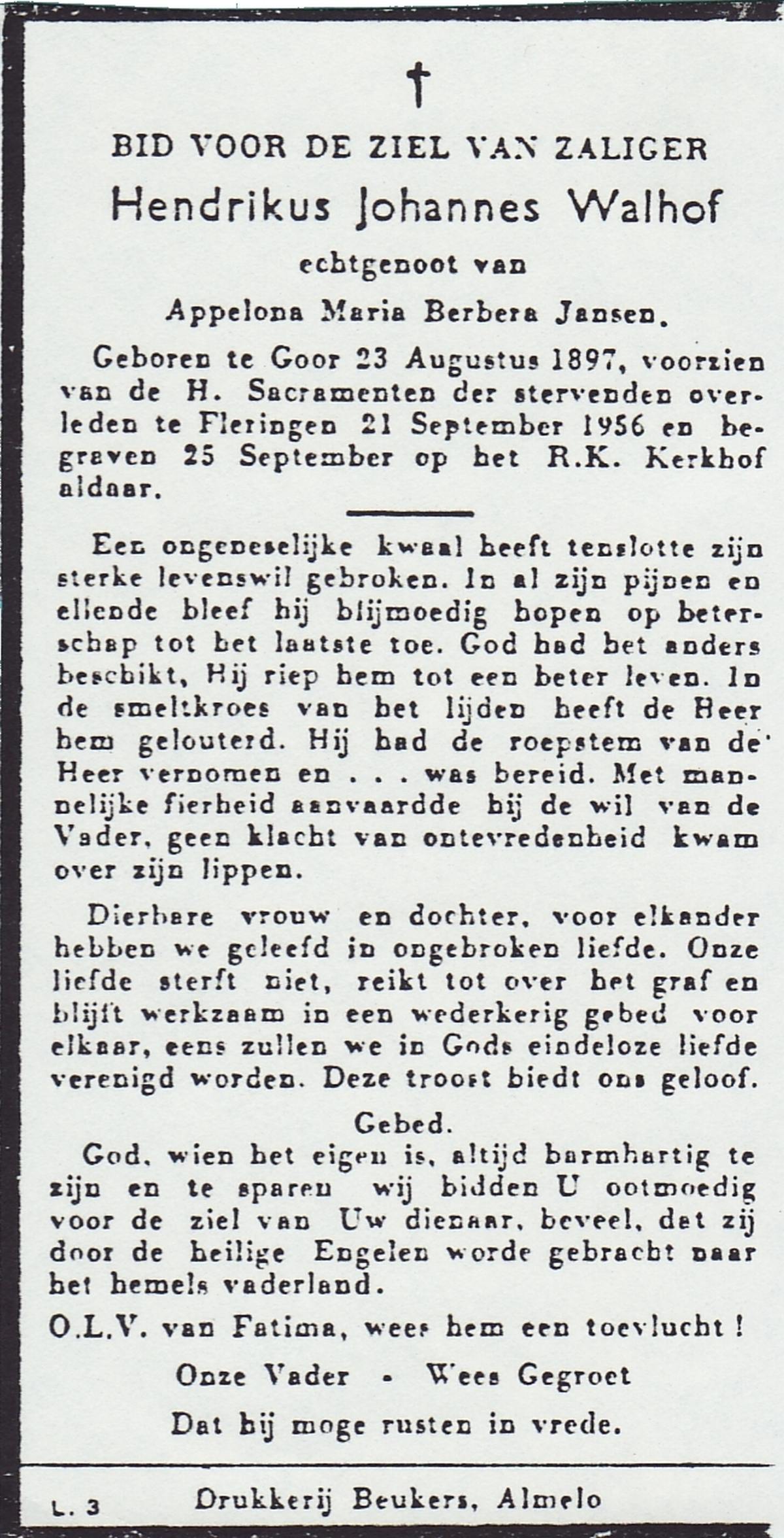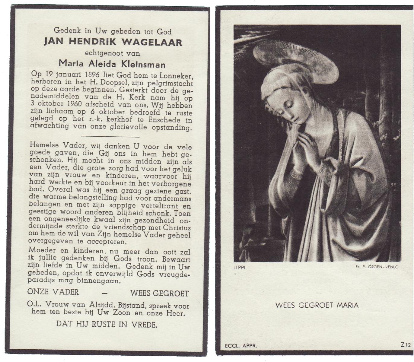 WAGELAAR, Jan Hendrik, geboren op 19-01-1896 te Lonneker, overleden op 3-10-1960 op 64-jarige leeftijd, begraven op 6-10-1960 te Enschede.
