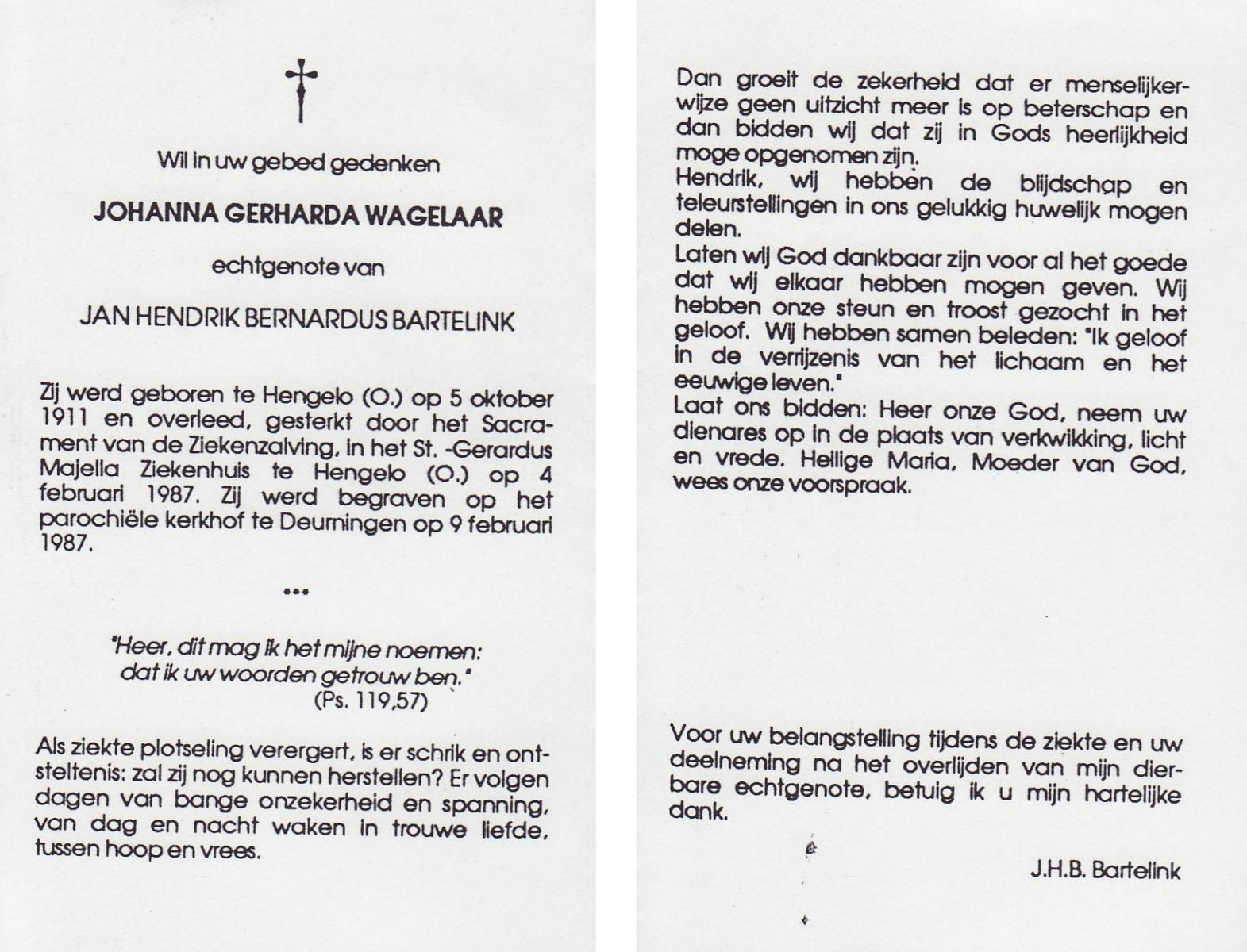 WAGELAAR, Johanna Gerharda, geboren op 5-10-1911 te Hengelo (O), overleden op 4-2-1987 te Hengelo (Ov.) op 75-jarige leeftijd, begraven op 9-2-1987 te Deurningen.