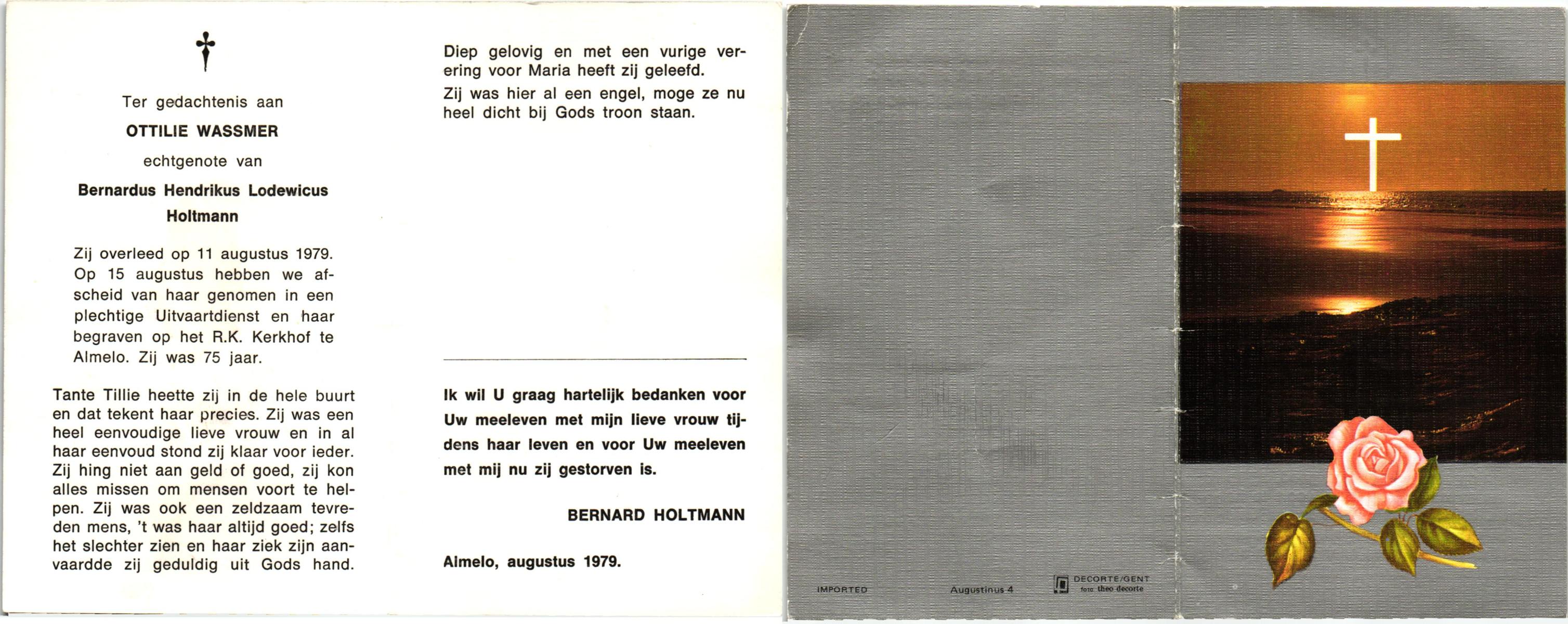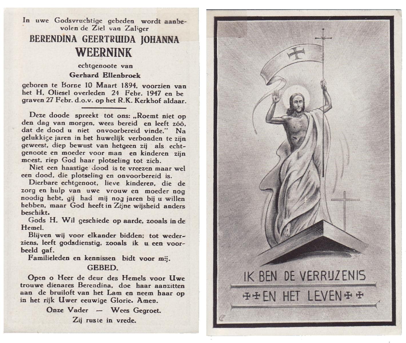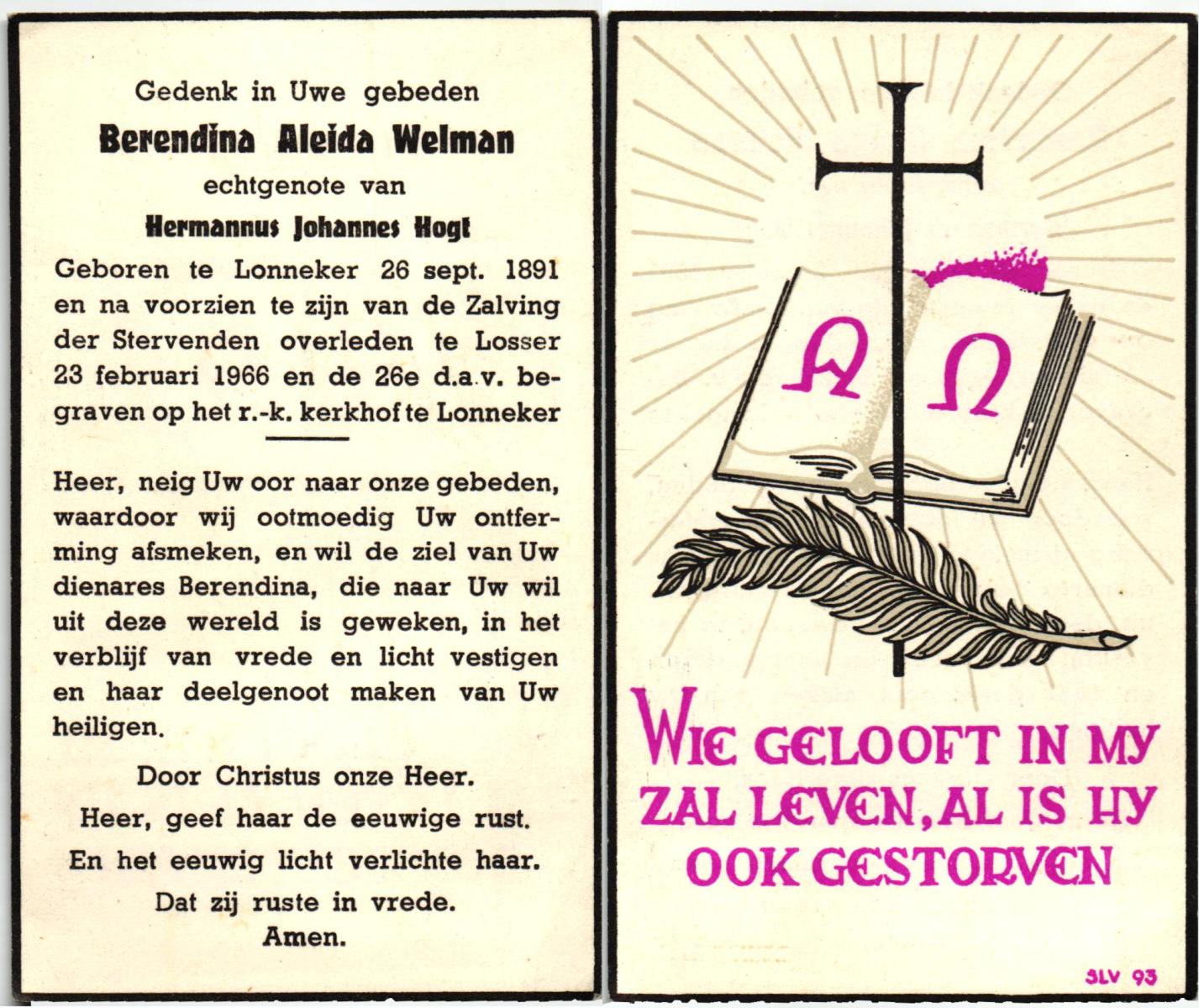 WELMAN, Berendina Aleida, geboren op 26-09-1891 te Lonneker, overleden op 23-2-1966 te Losser op 74-jarige leeftijd, begraven op 26-2-1966 te Lonneker.