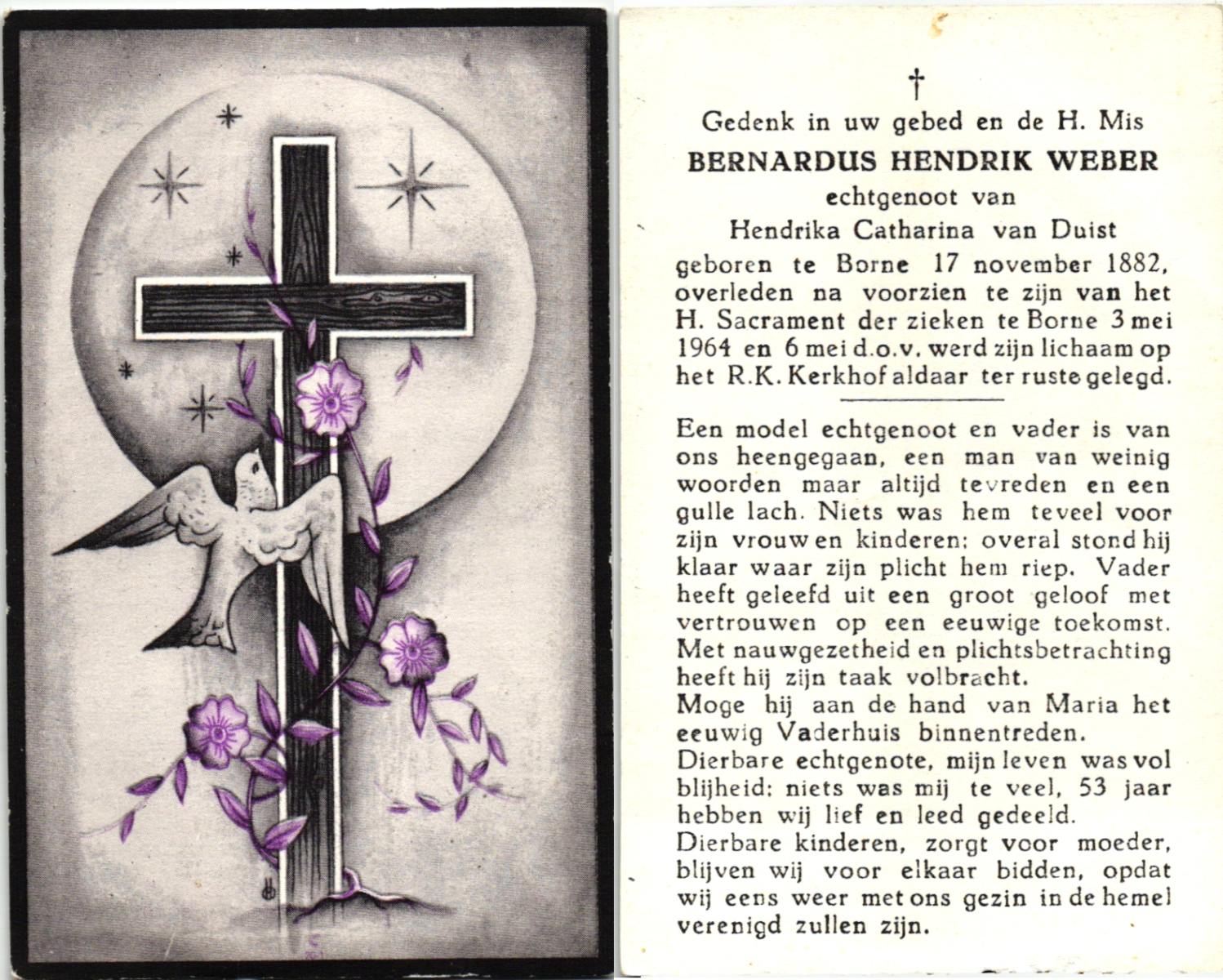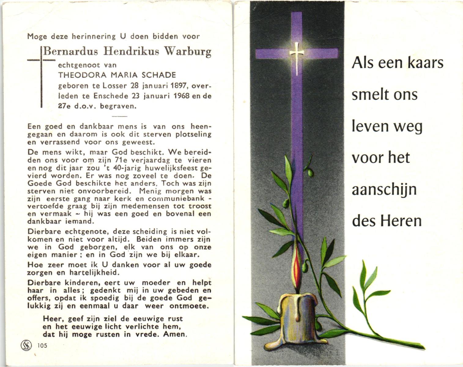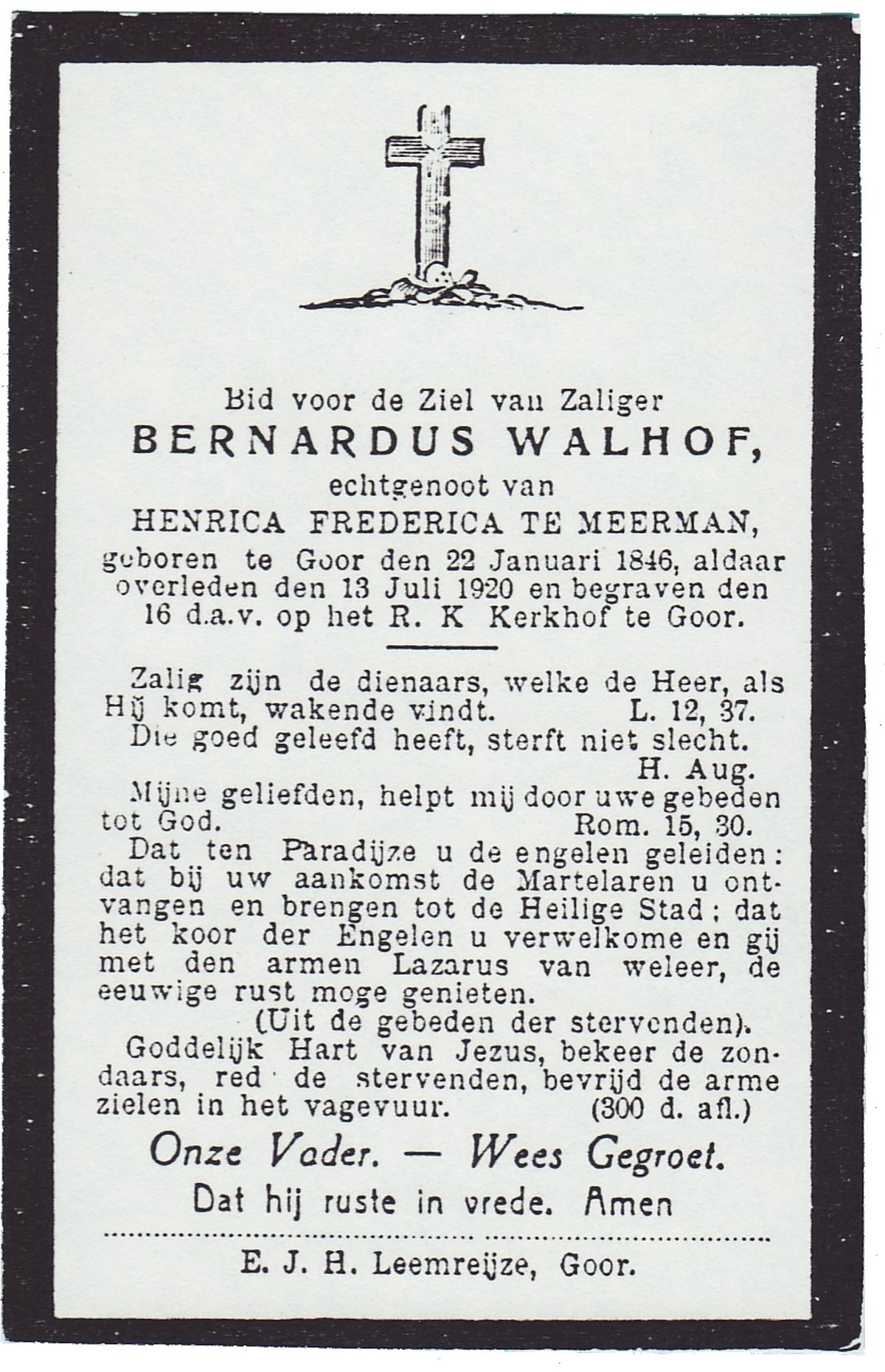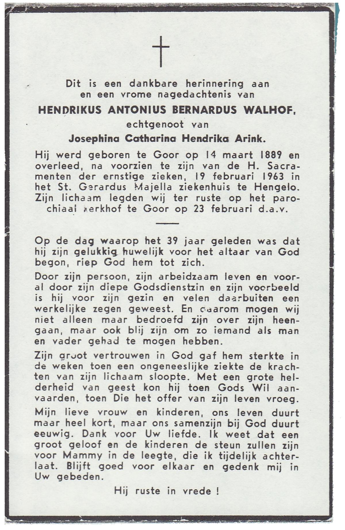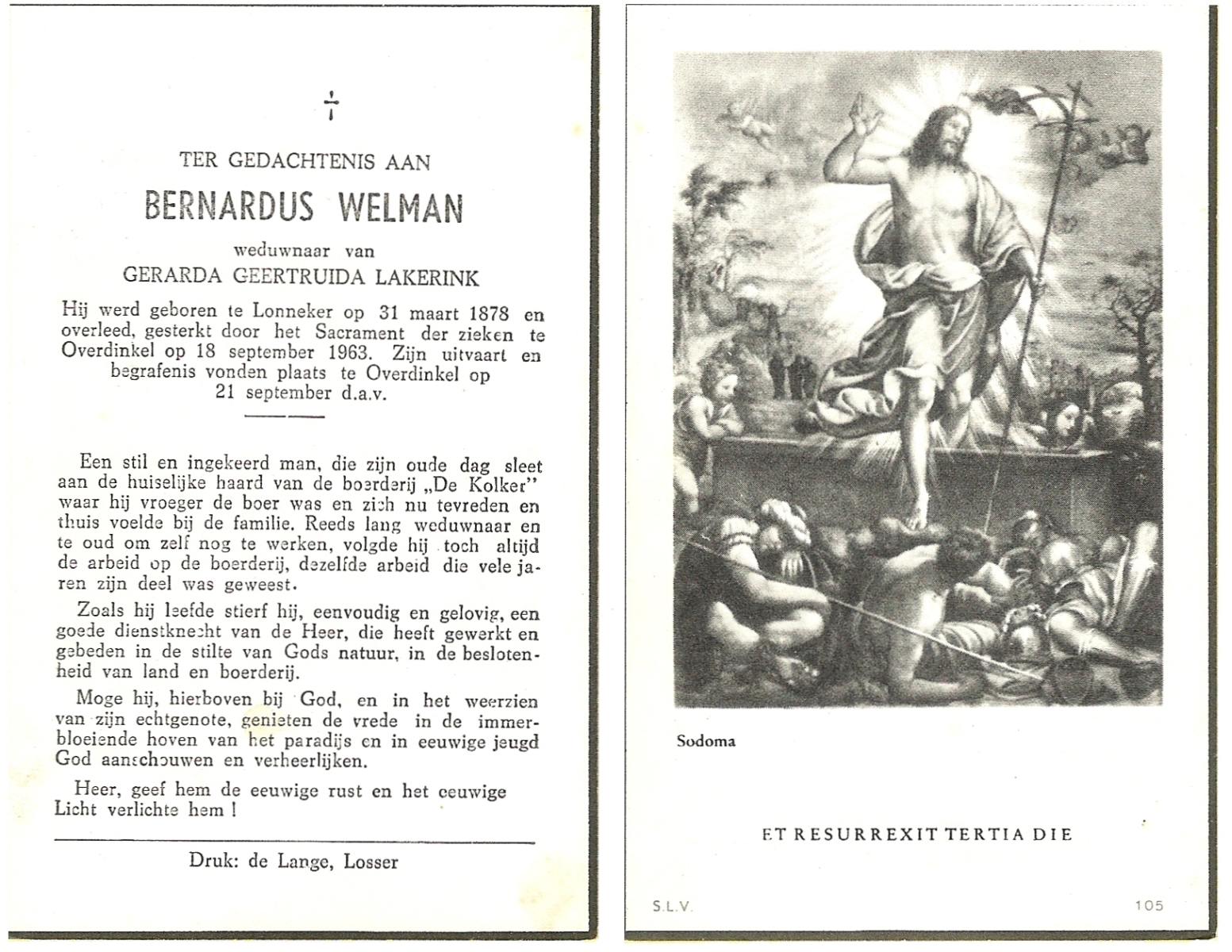 WELMAN, Bernardus, geboren op 31-03-1878 te Lonneker, overleden op 18-9-1963 te Overdinkel op 85-jarige leeftijd, begraven op 21-9-1963 te Overdinkel.