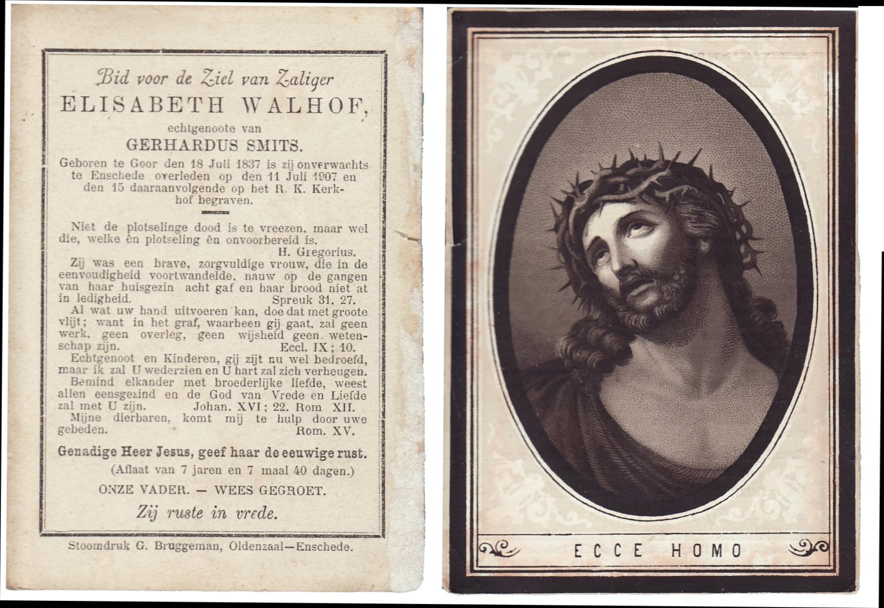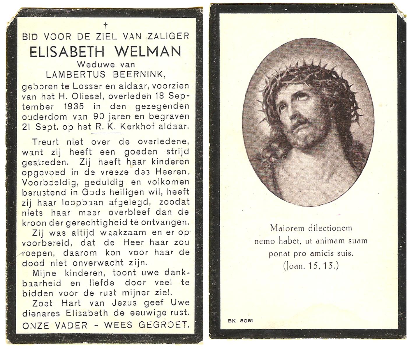 WELMAN, Elisabeth, geboren te Losser, overleden op 18-9-1935 te Losser op 90-jarige leeftijd, begraven op 21-9-1935 te Losser.