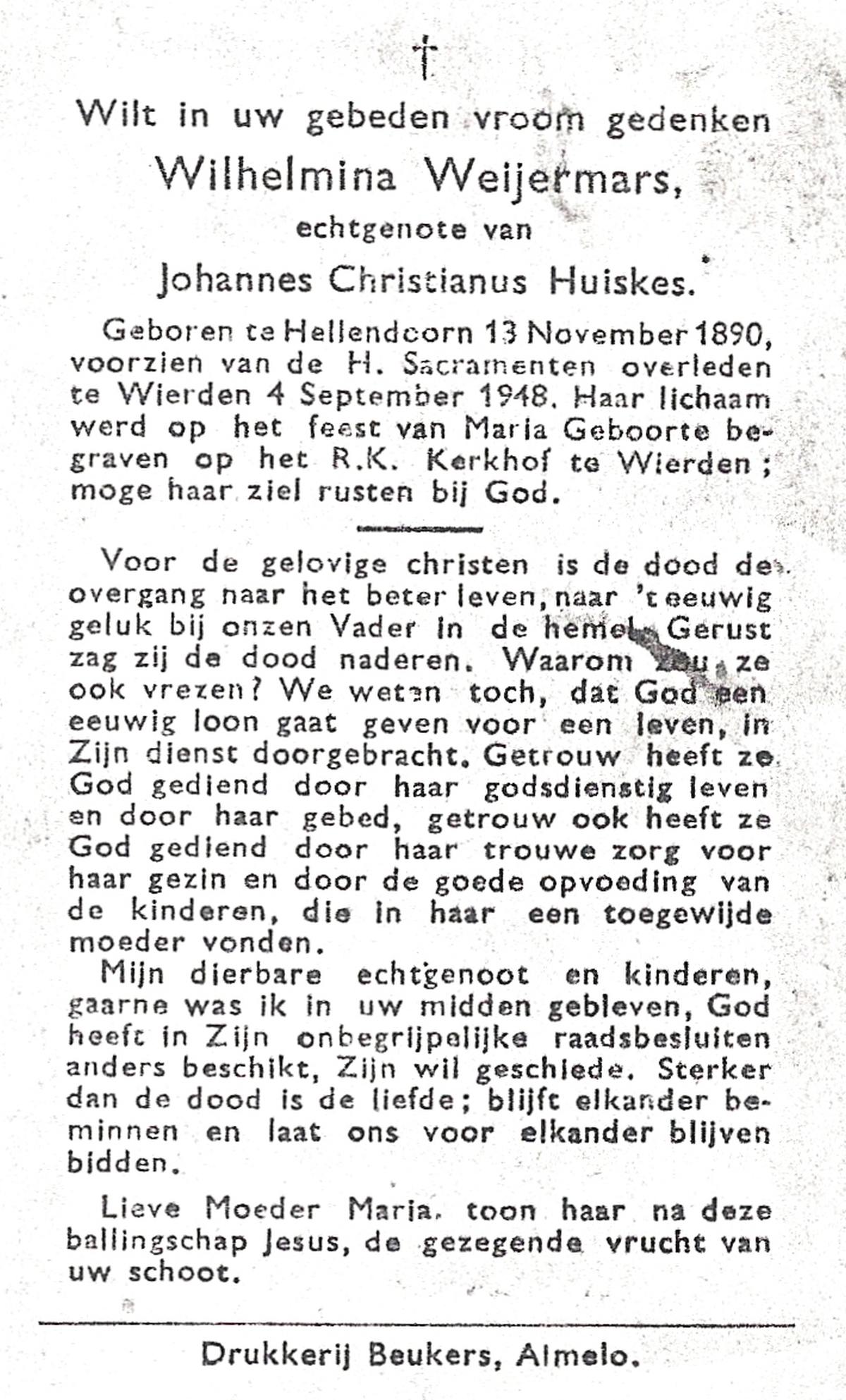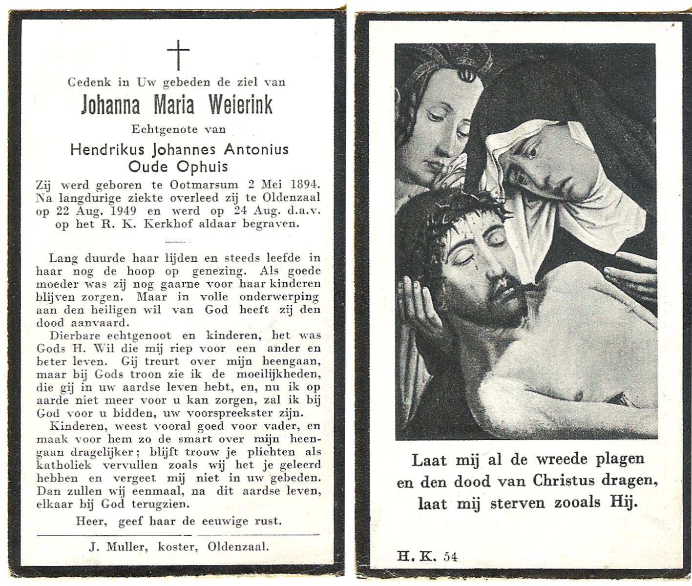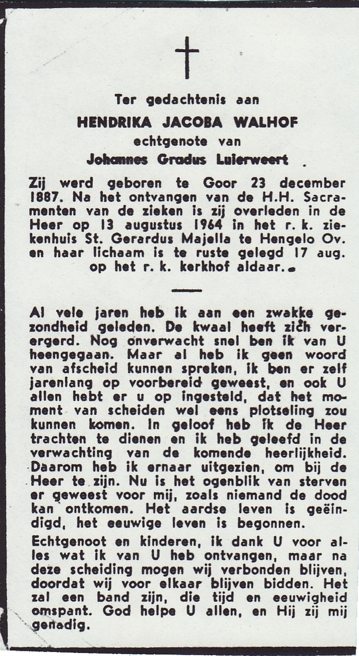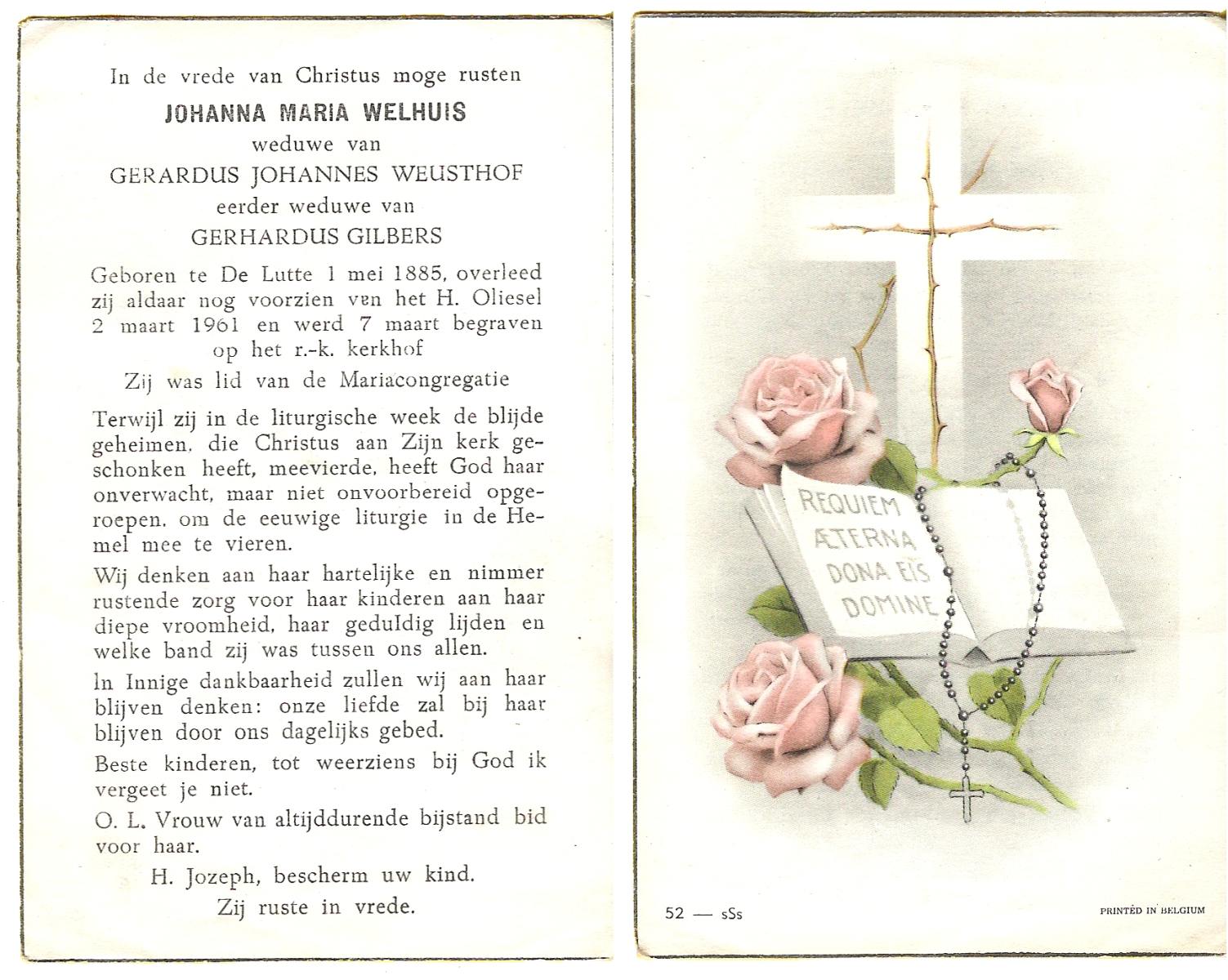WELHUIS, Johanna Maria, geboren op 01-05-1885 te De Lutte, overleden op 2-3-1961 te De Lutte op 75-jarige leeftijd, begraven op 7-3-1961 te De Lutte.
