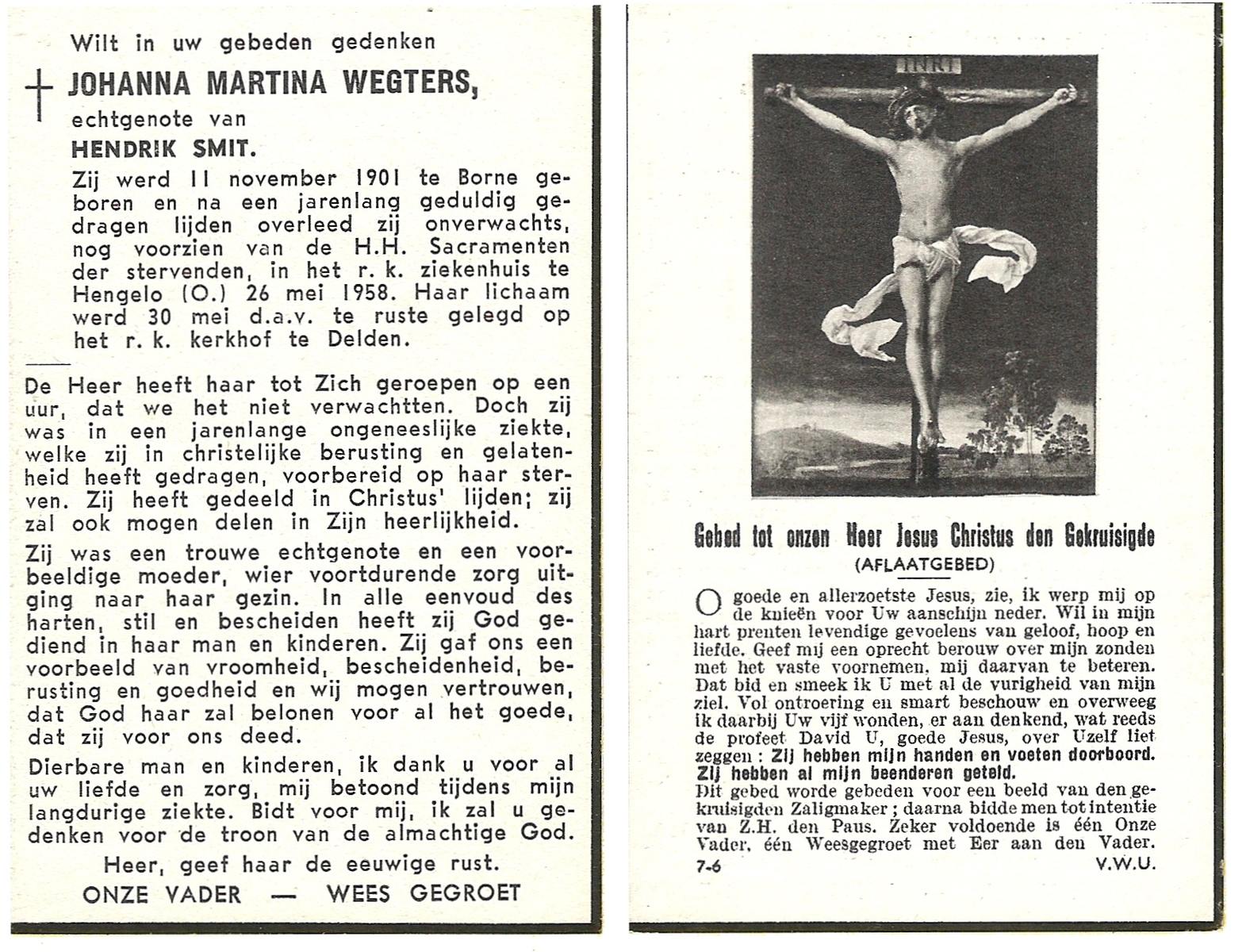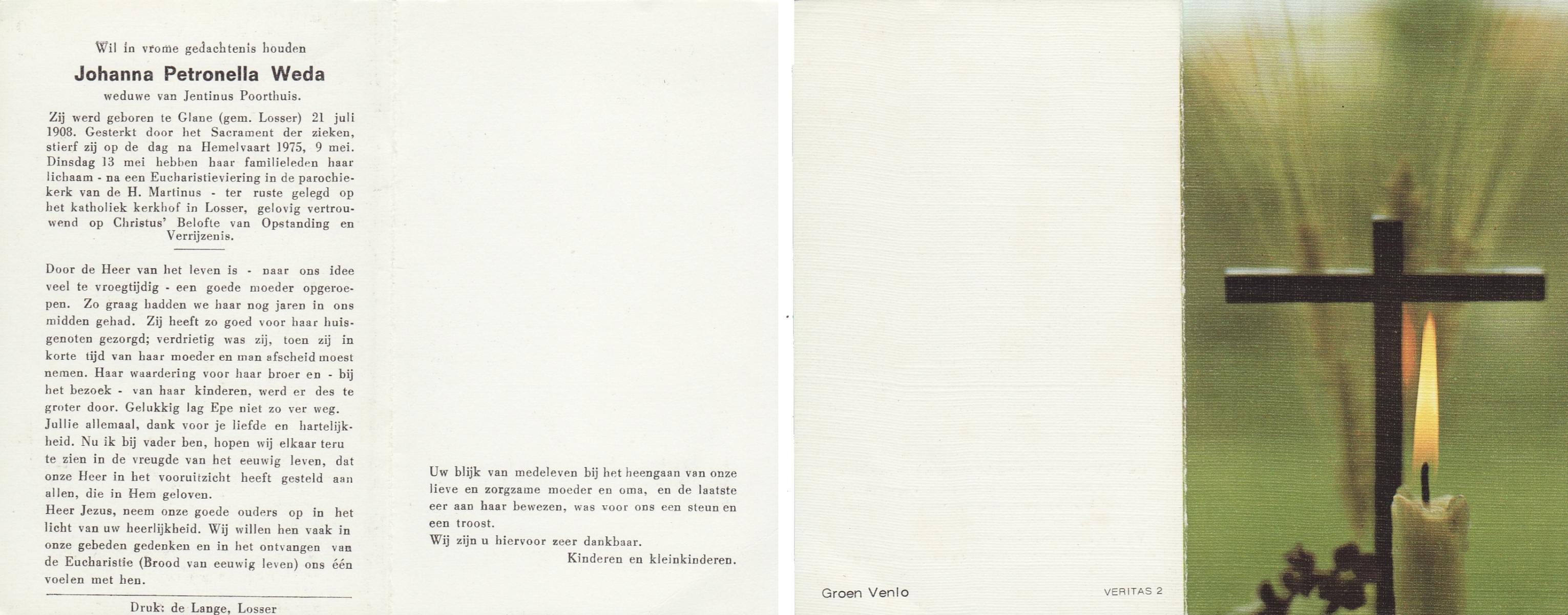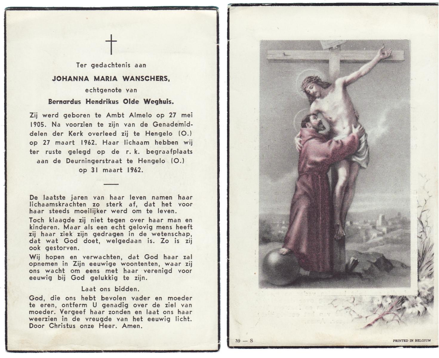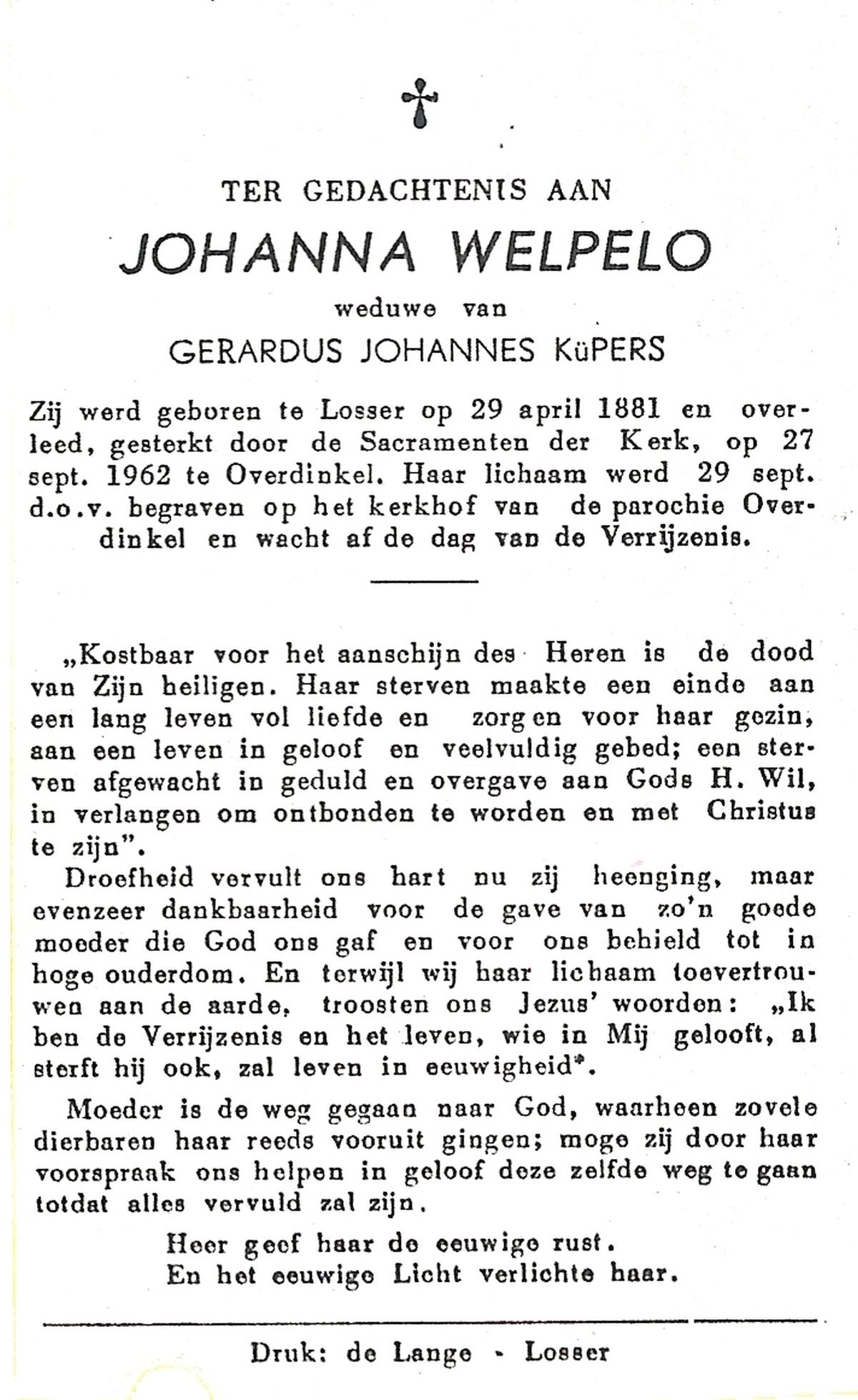 WELPELO, Johanna, geboren op 29-04-1881 te Losser, overleden op 27-9-1962 te Overdinkel op 81-jarige leeftijd, begraven op 29-9-1962 te Overdinkel.