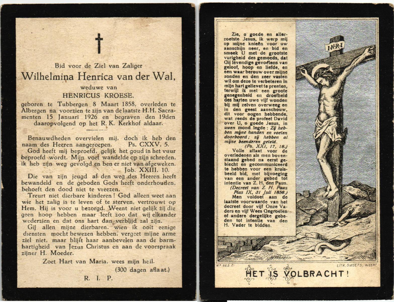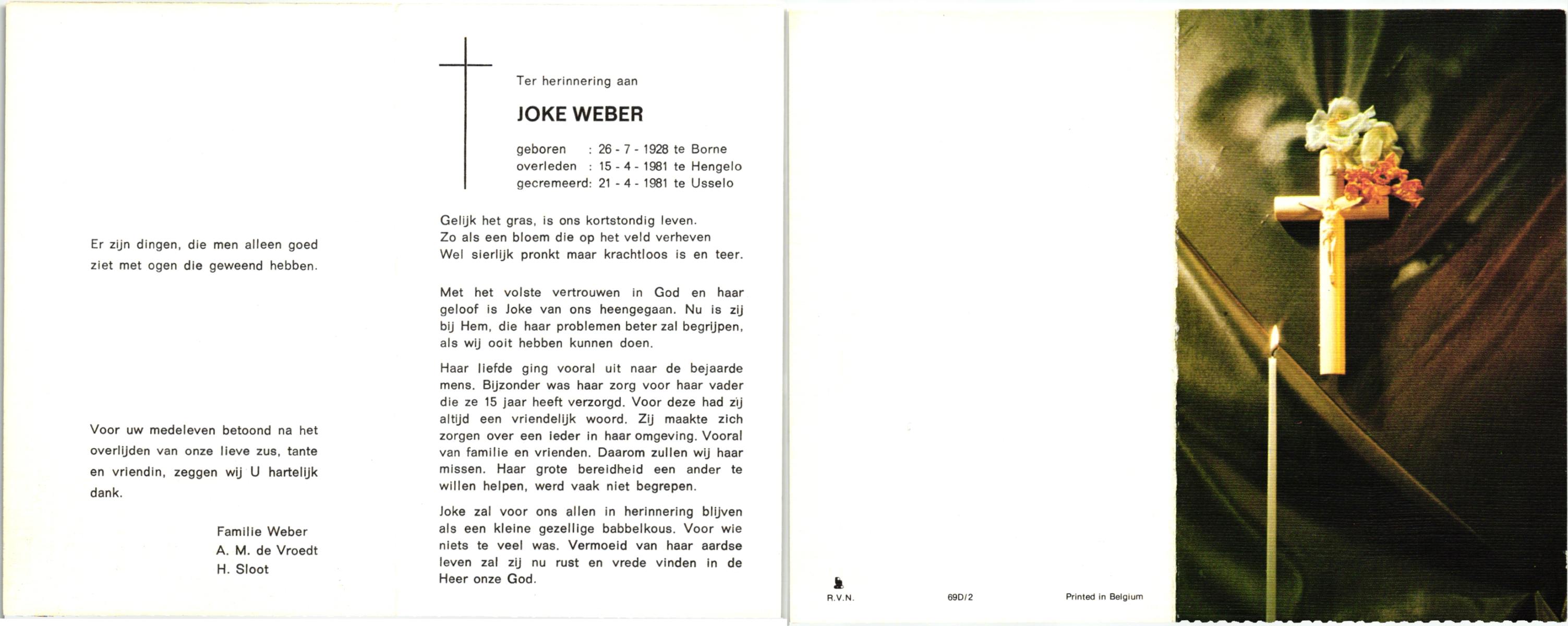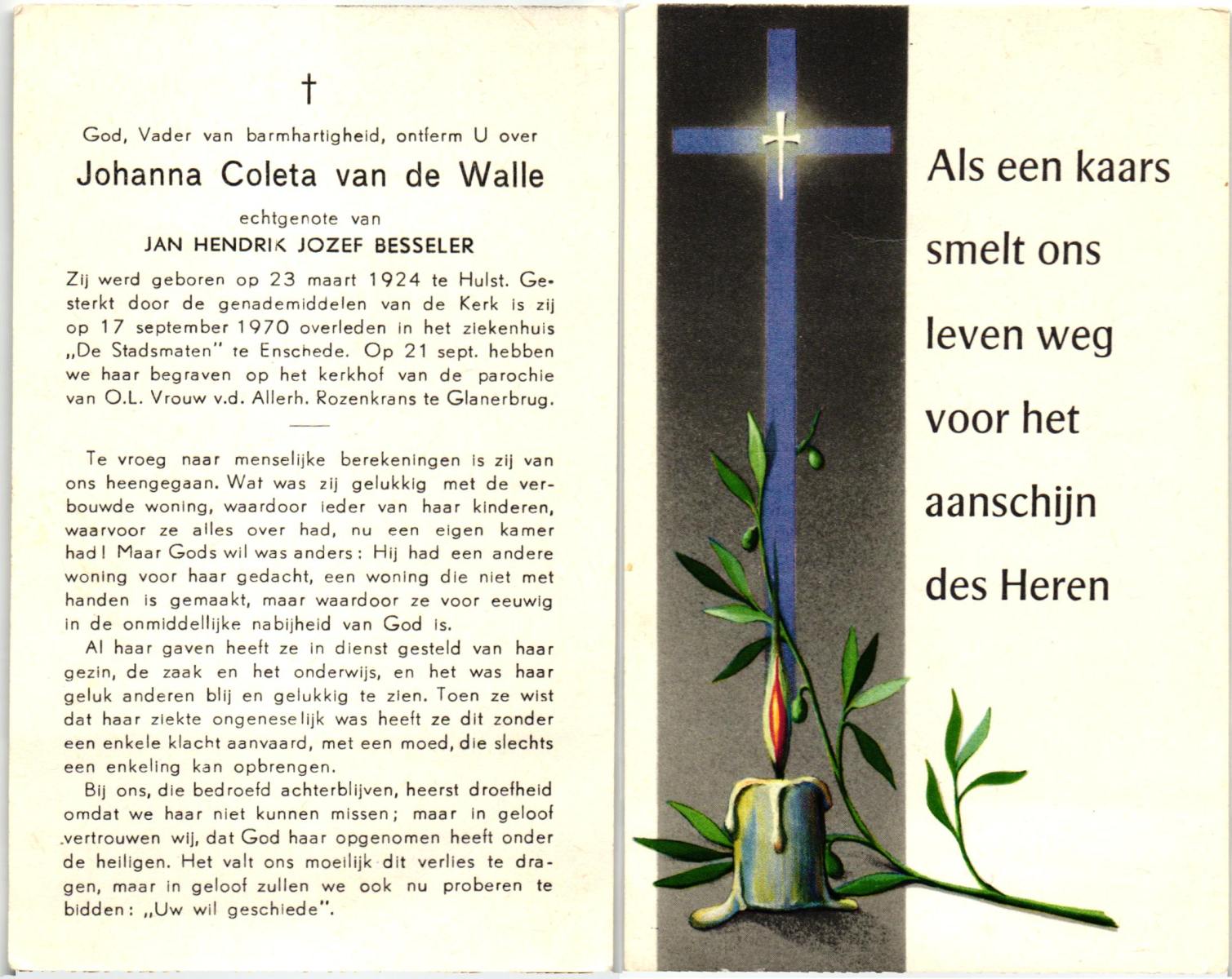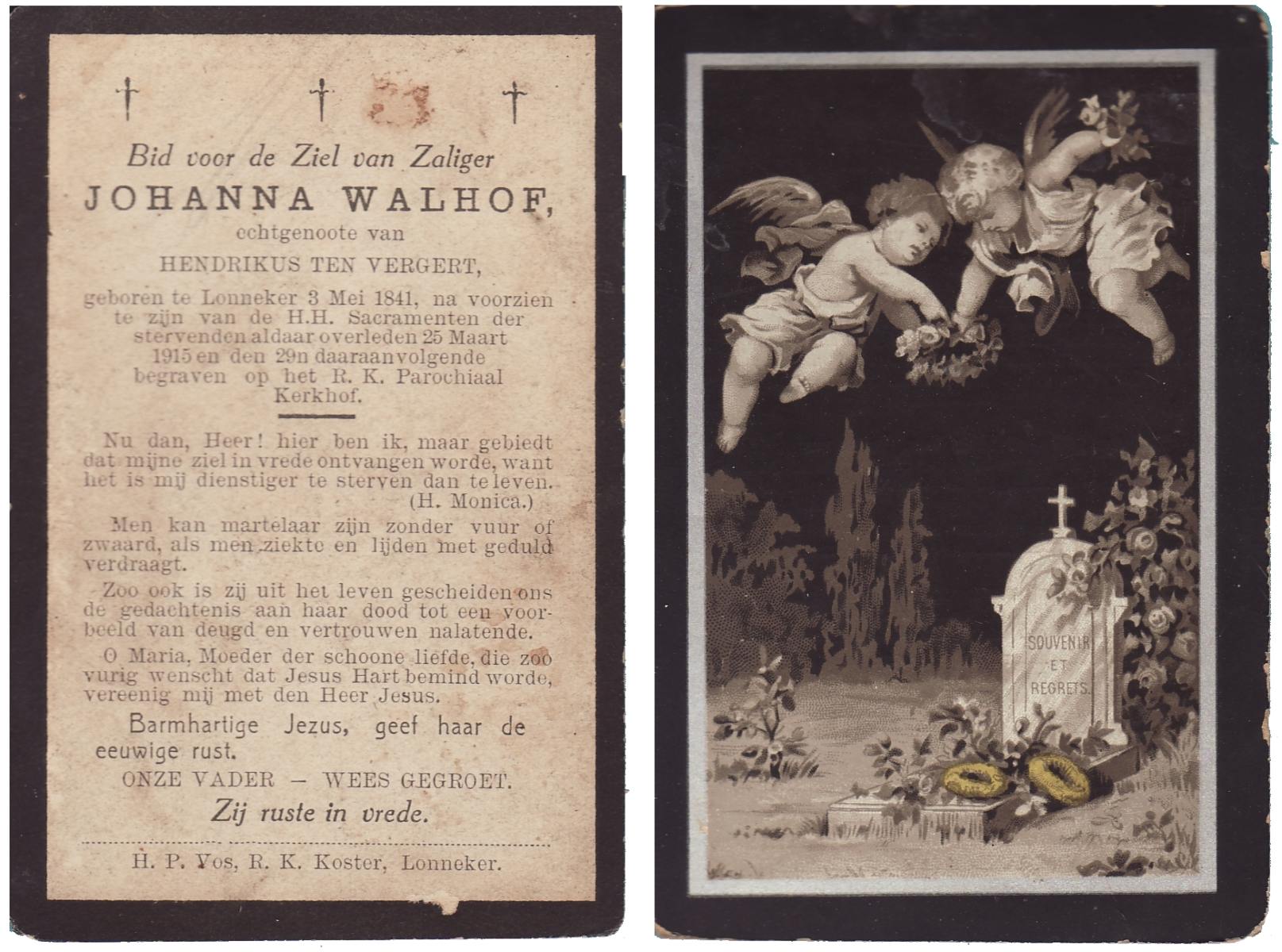 WELPELO, Johanna, geboren op 29-04-1881 te Losser, overleden op 27-9-1962 te Overdinkel op 81-jarige leeftijd, begraven op 29-9-1962 te Overdinkel.