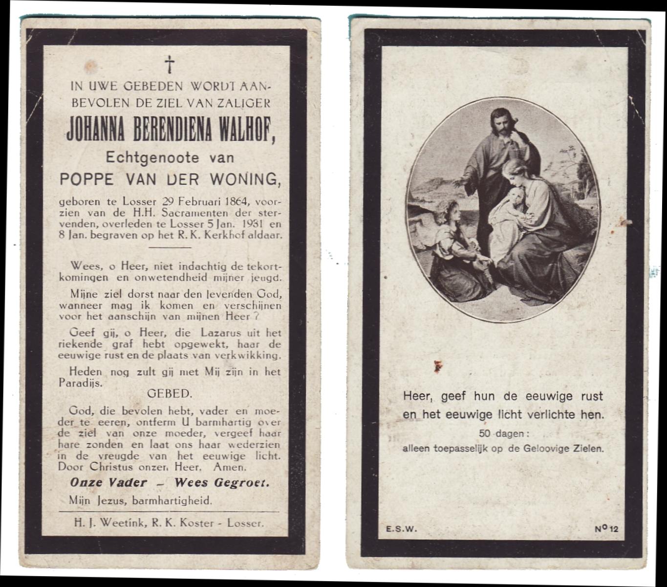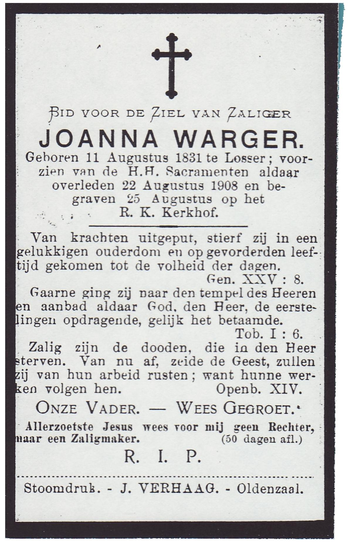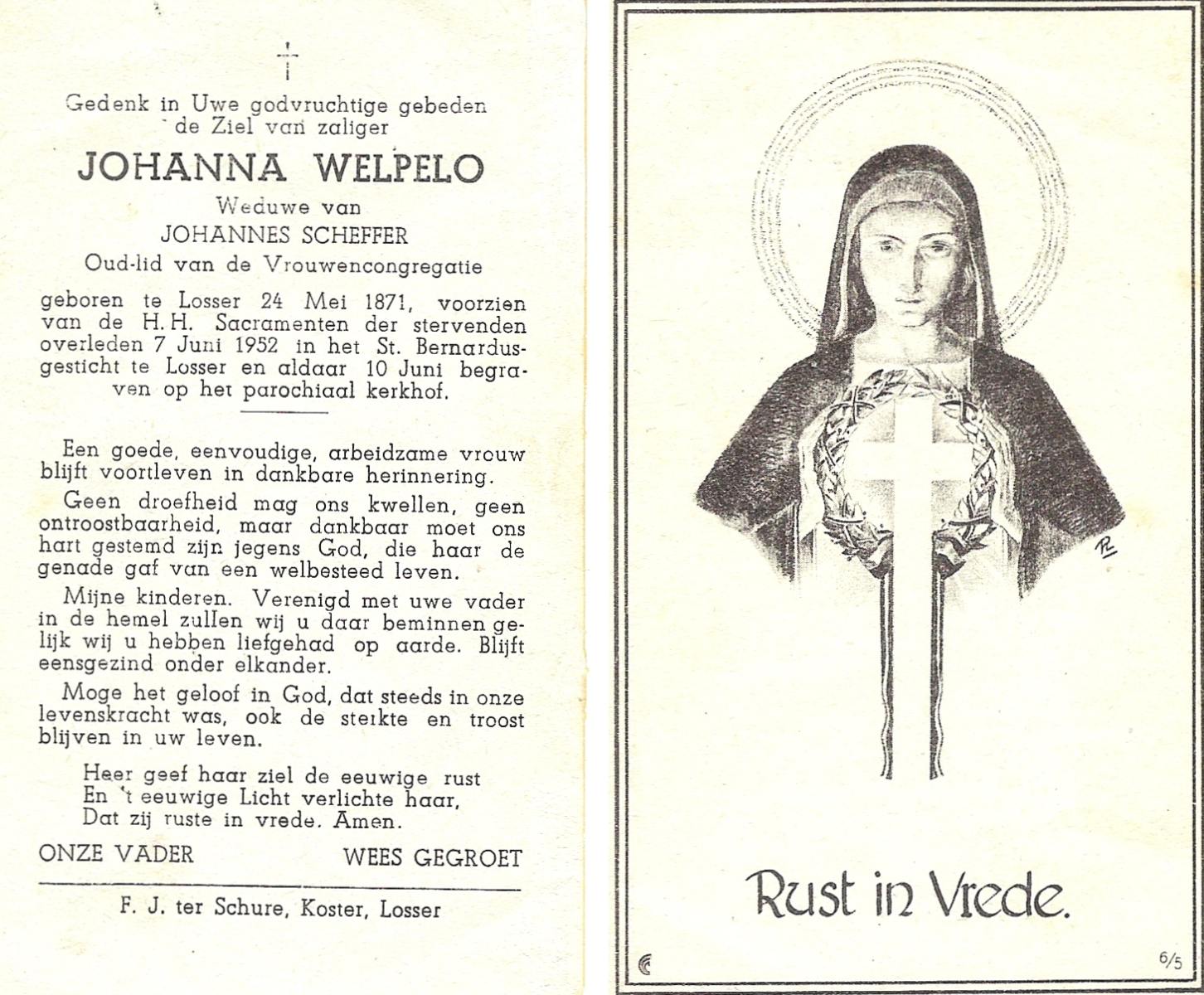 WELPELO, Johanna, geboren op 24-05-1871 te Losser, overleden op 7-6-1952 te Losser op 81-jarige leeftijd, begraven op 10-6-1952 te Losser.