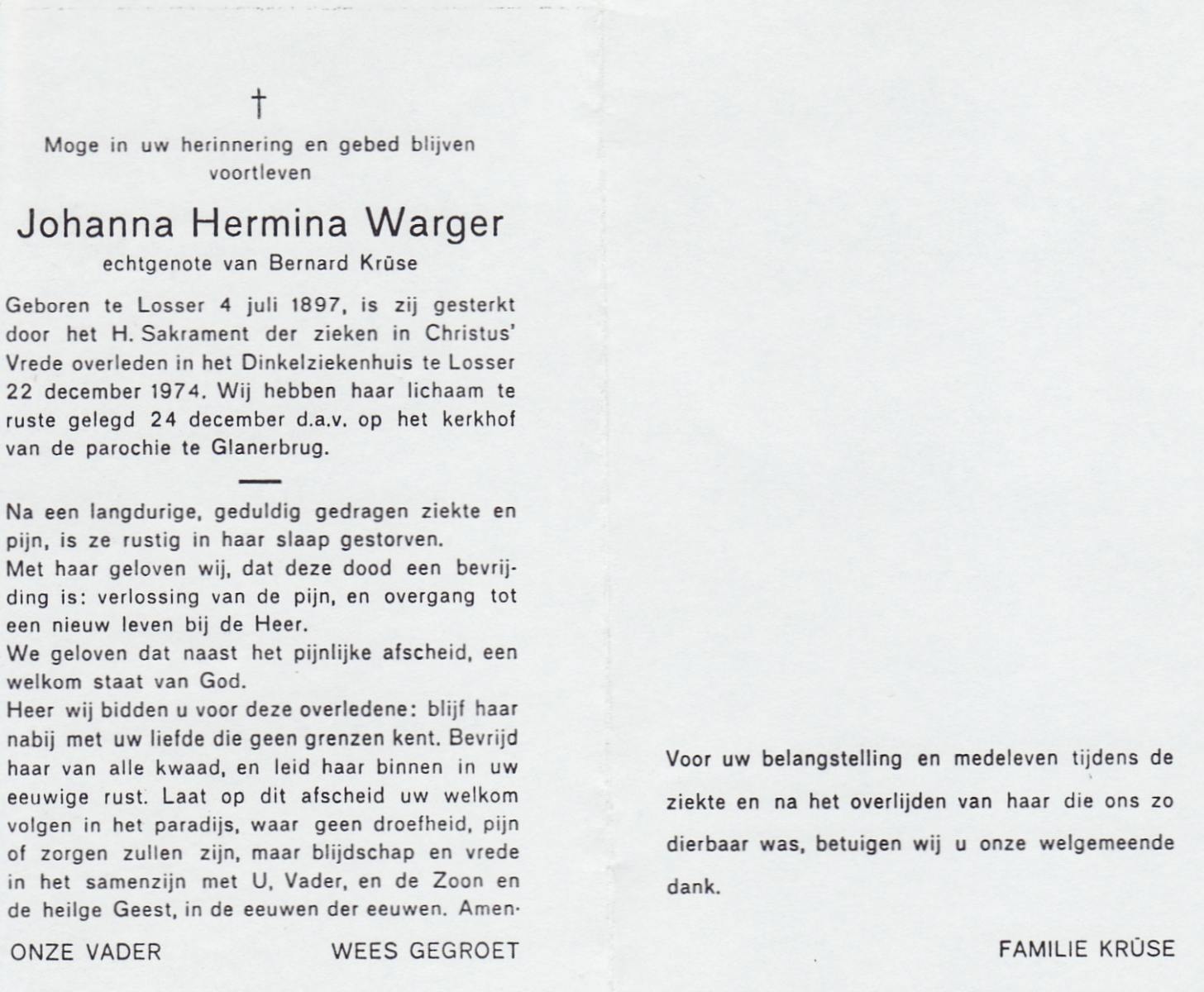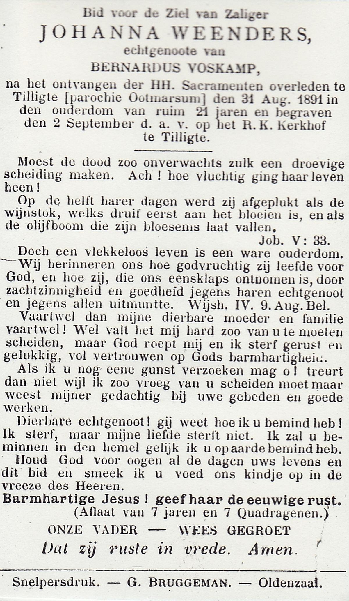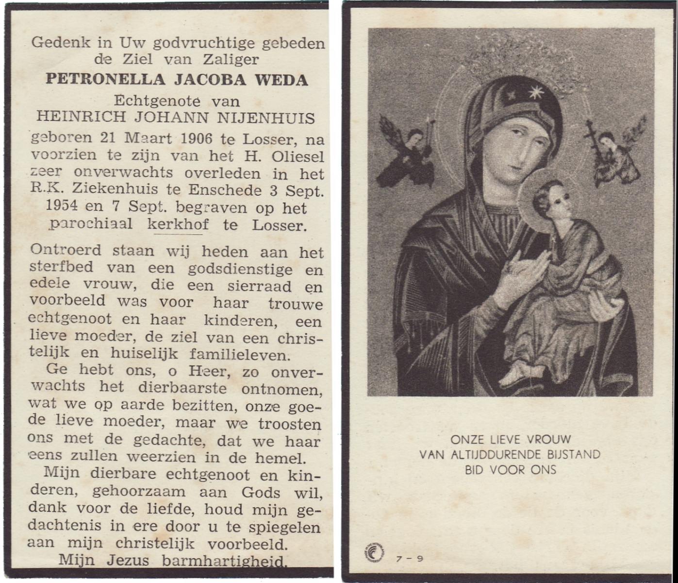 WELPELO, Johanna, geboren op 24-05-1871 te Losser, overleden op 7-6-1952 te Losser op 81-jarige leeftijd, begraven op 10-6-1952 te Losser.