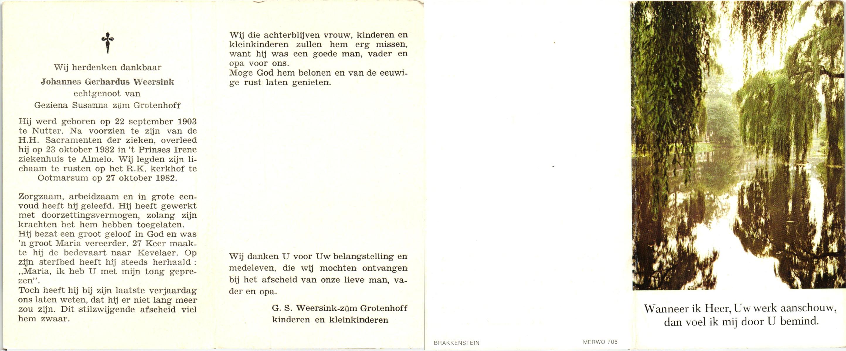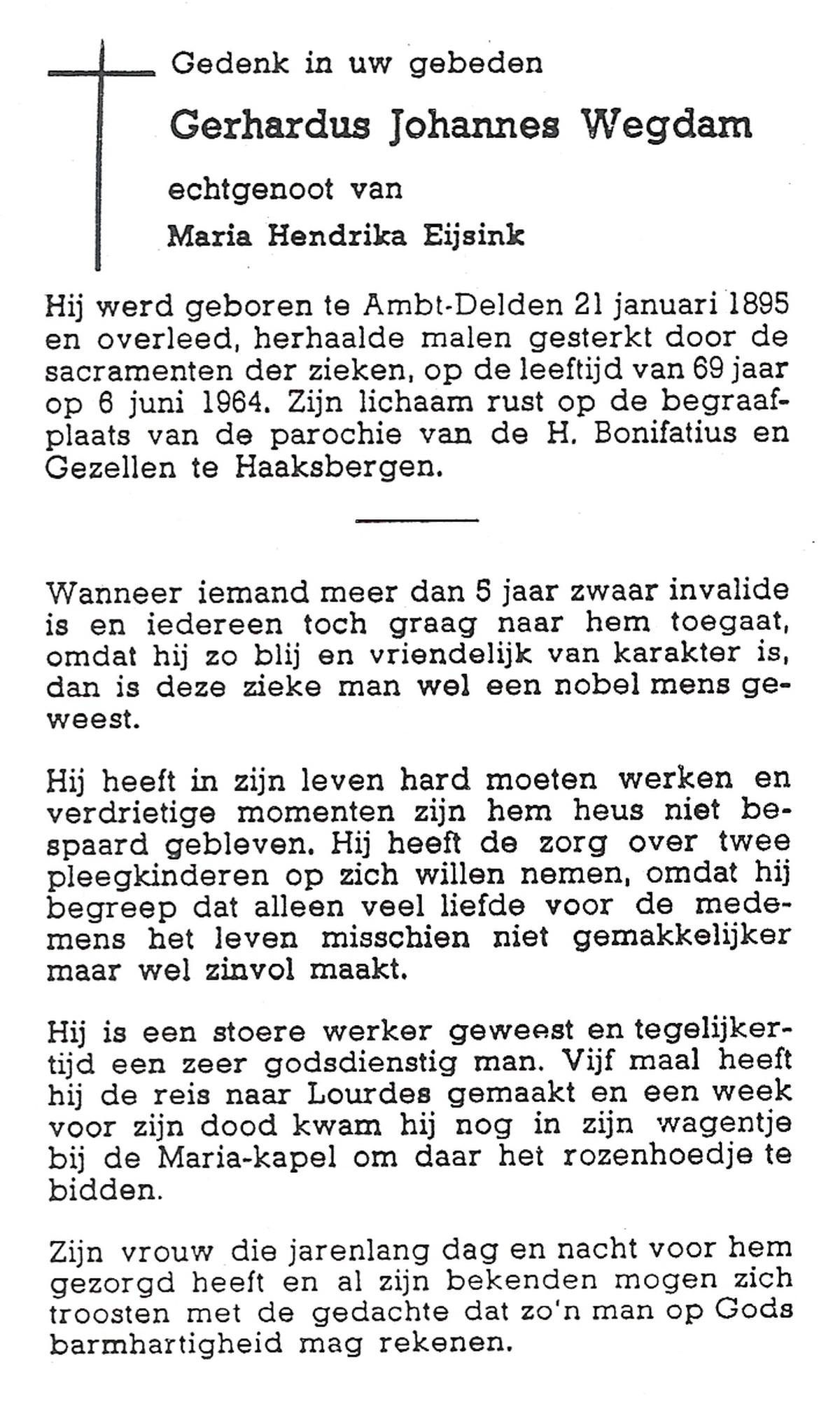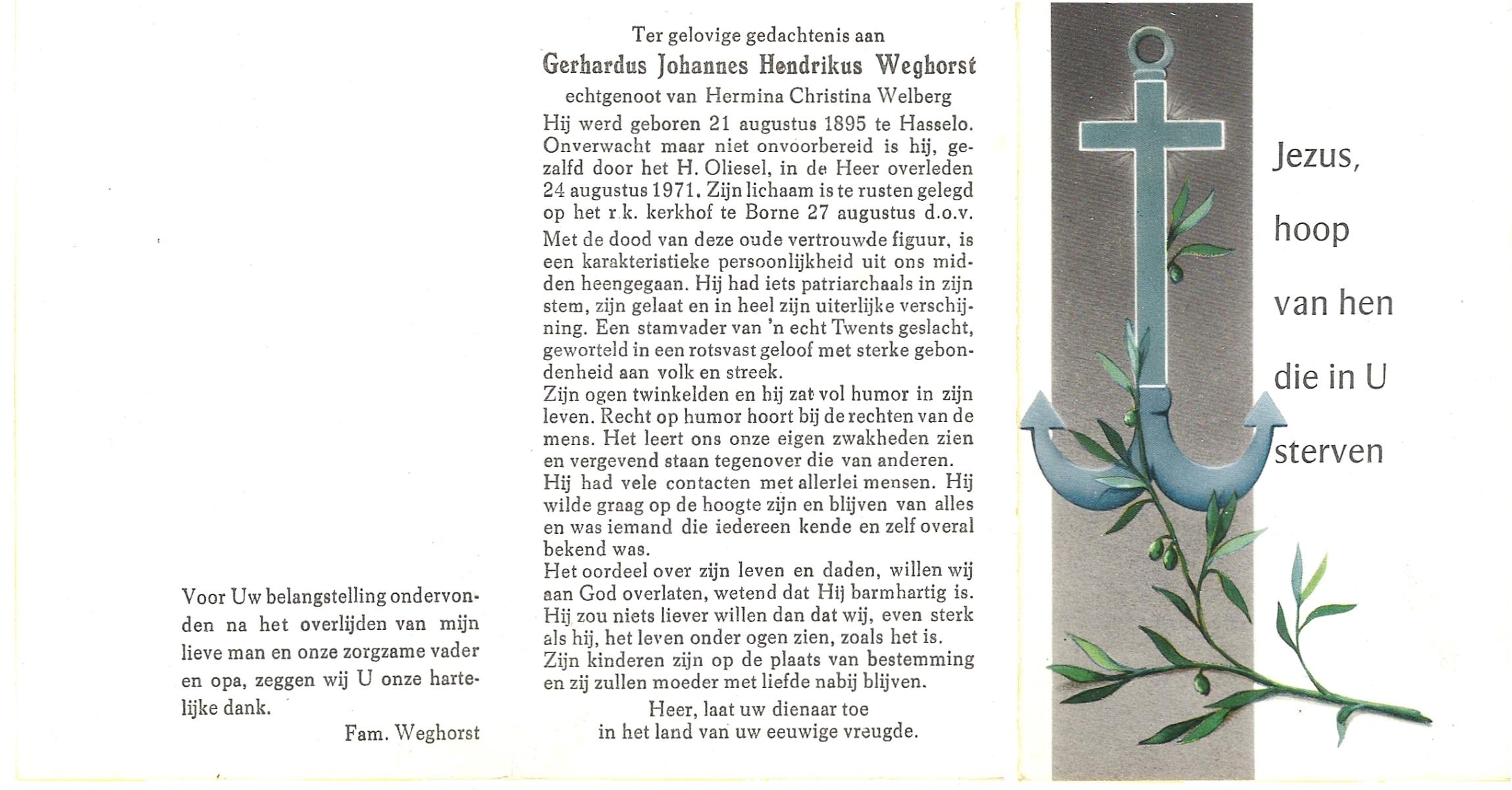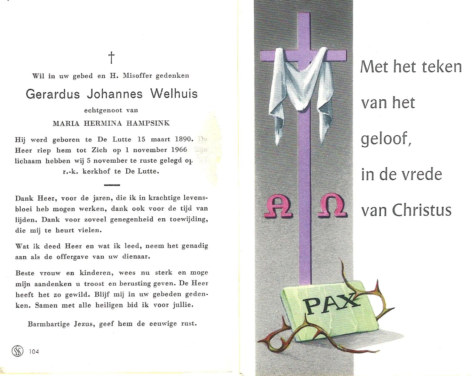 WELHUIS, Gerardus Johannes, geboren op 15-03-1890 te De Lutte, overleden op 1-11-1966 op 76-jarige leeftijd, begraven op 5-11-1966 te De Lutte.