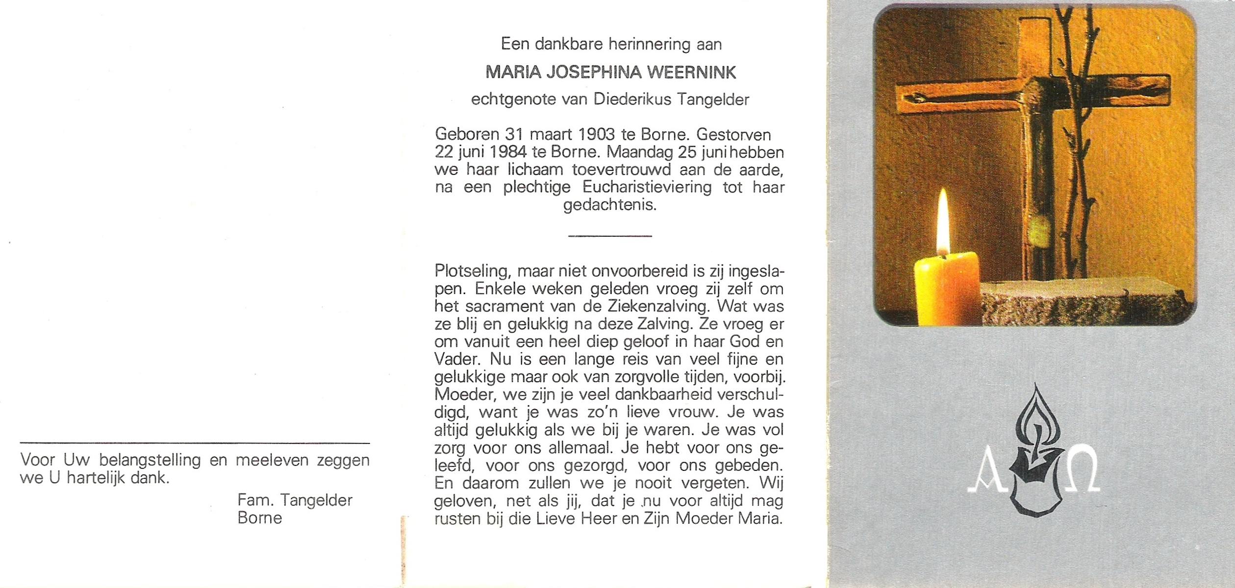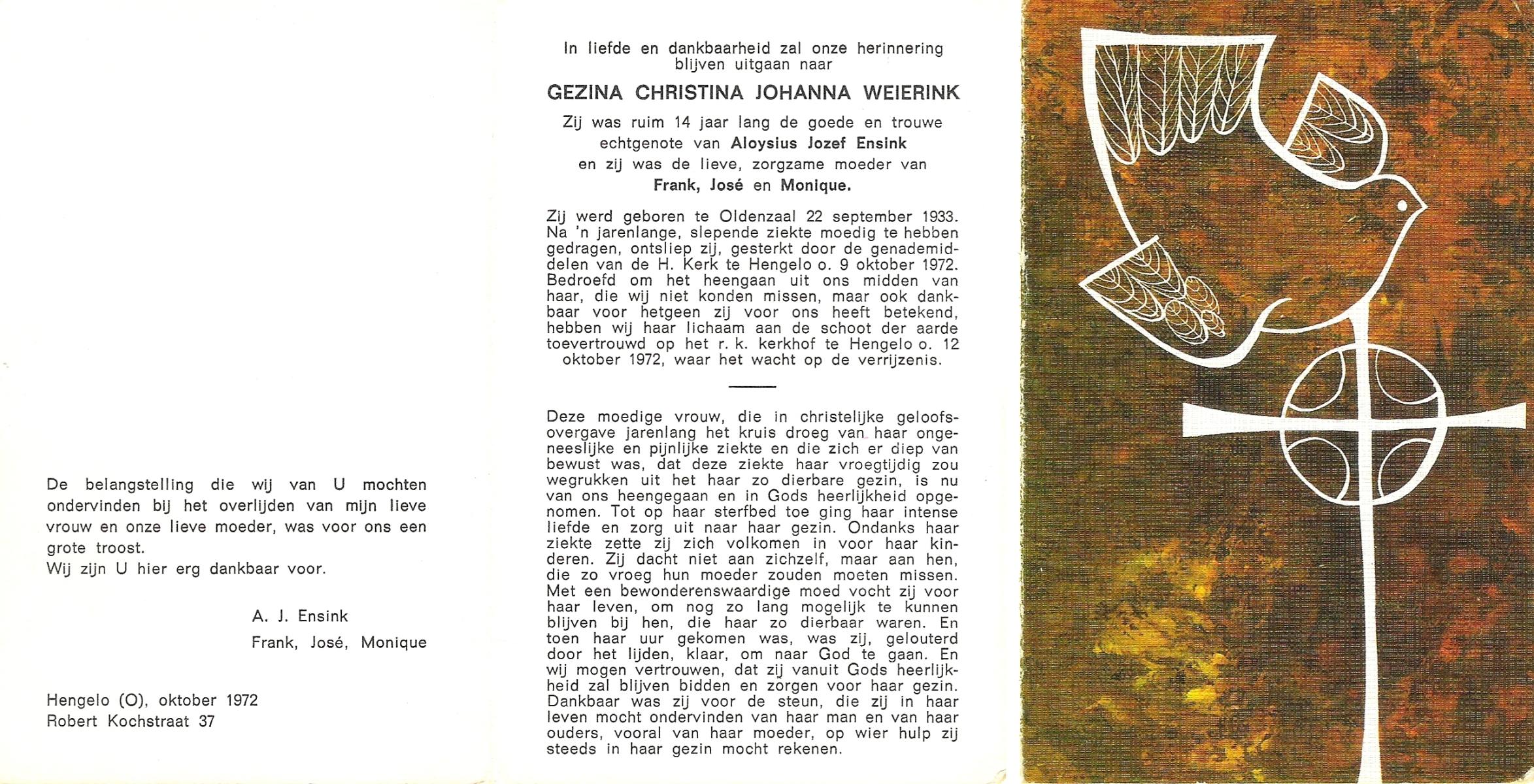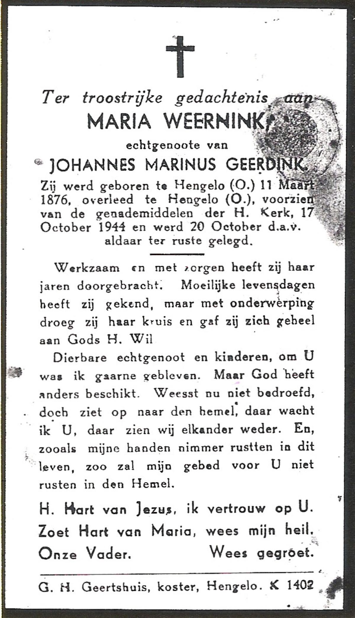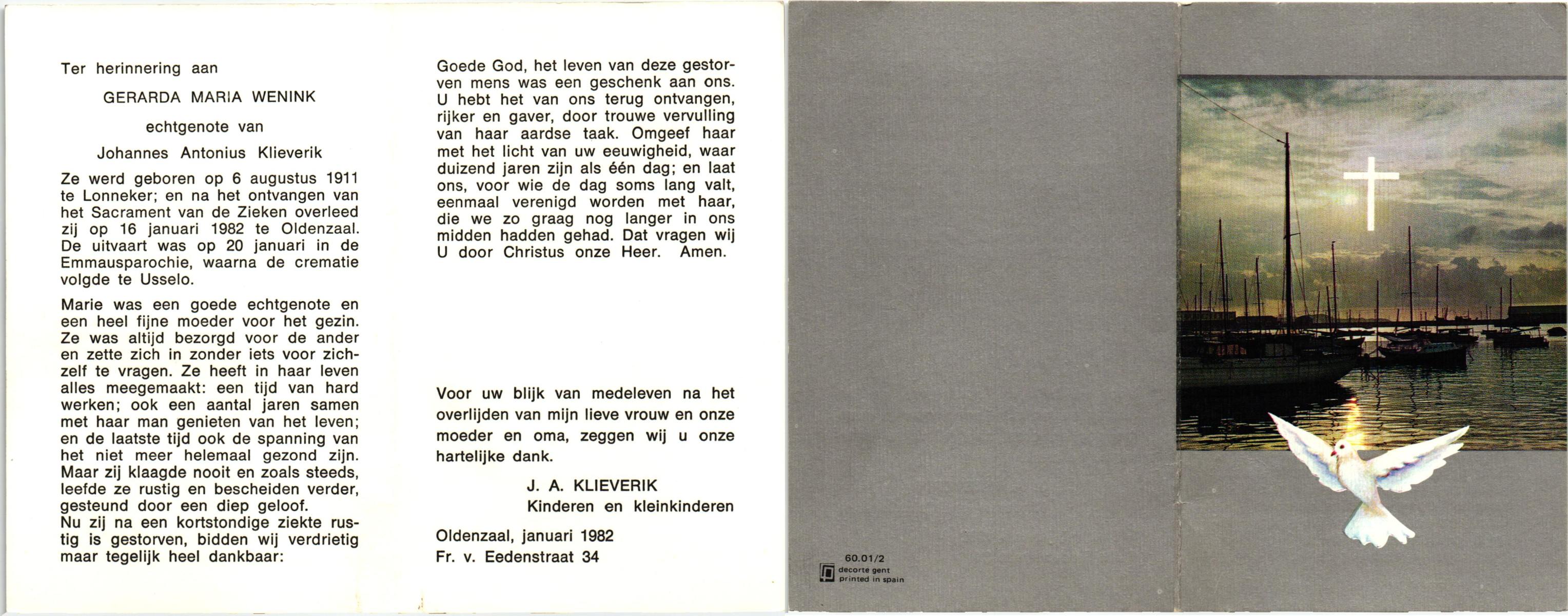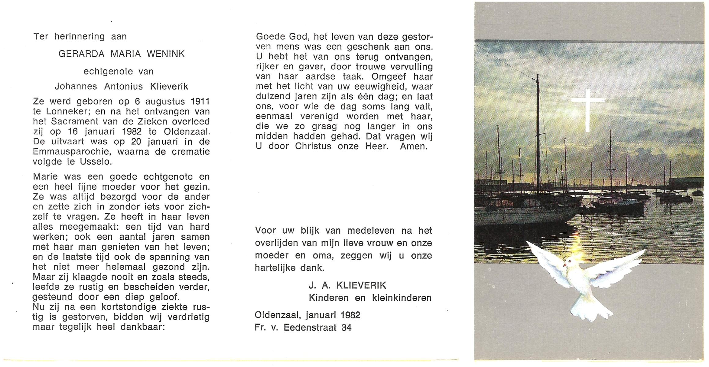 WENINK, Gerarda Maria, geboren op 6-8-1911 te Lonneker, overleden op 16-1-1982 te Oldenzaal op 70-jarige leeftijd, gecremeerd op 20-1-1982 te Usselo.