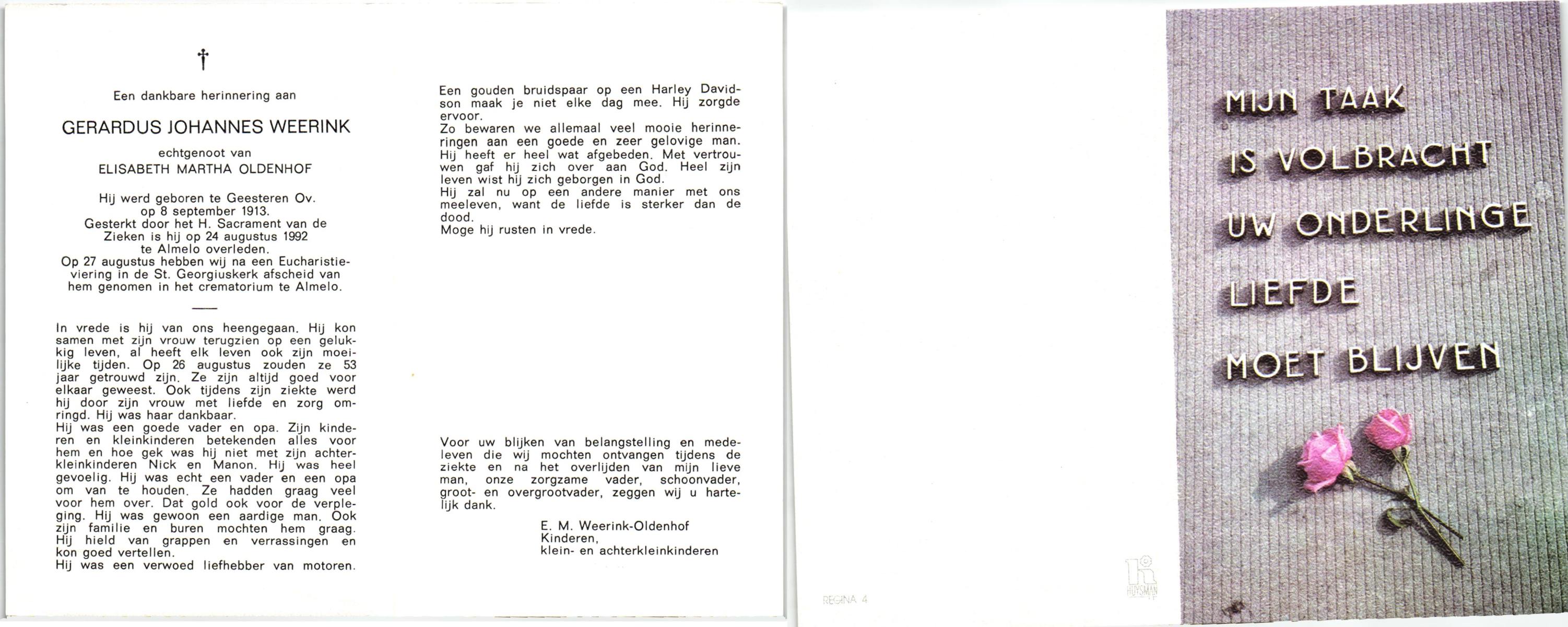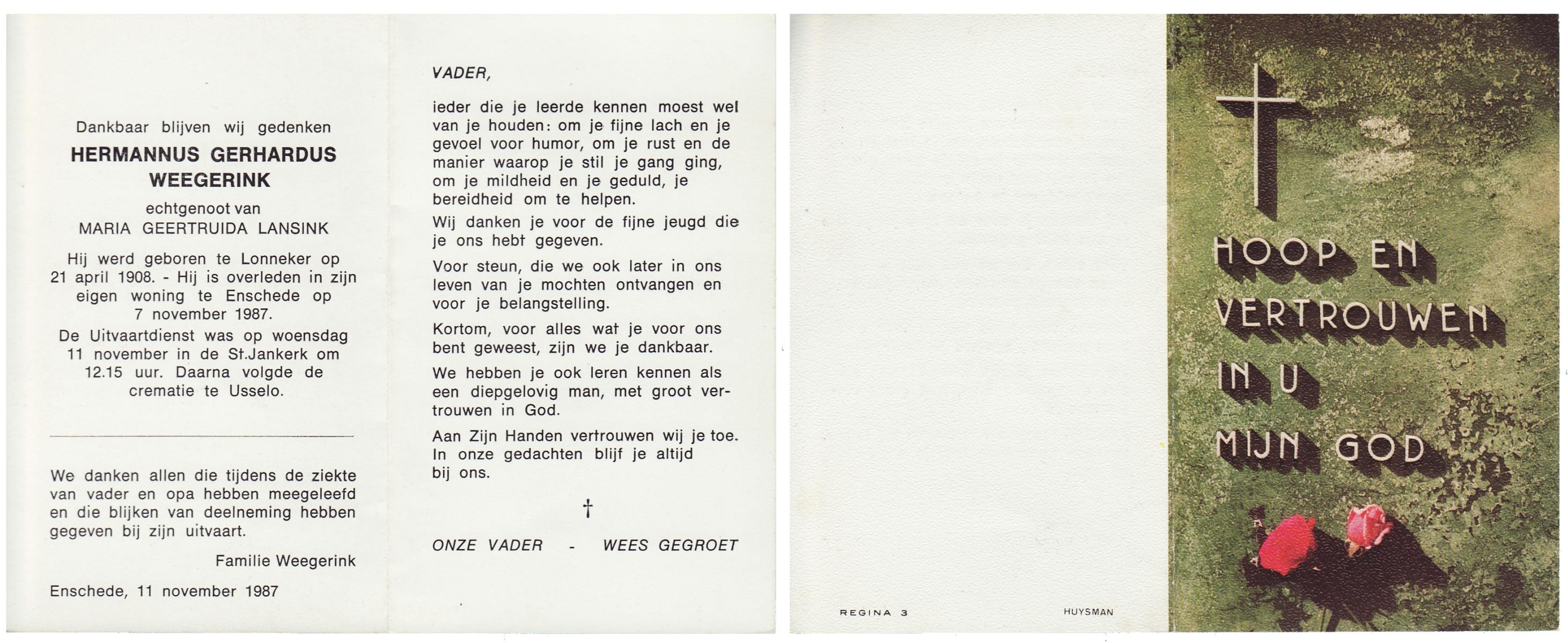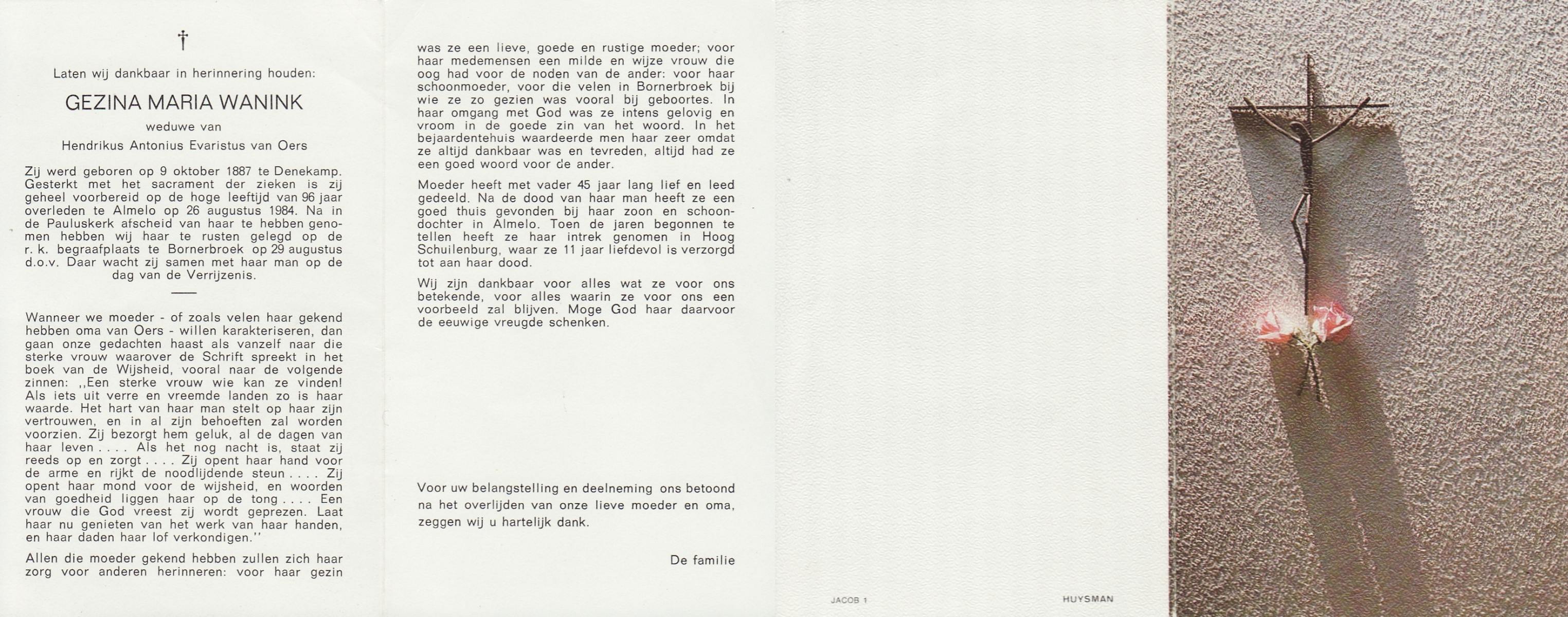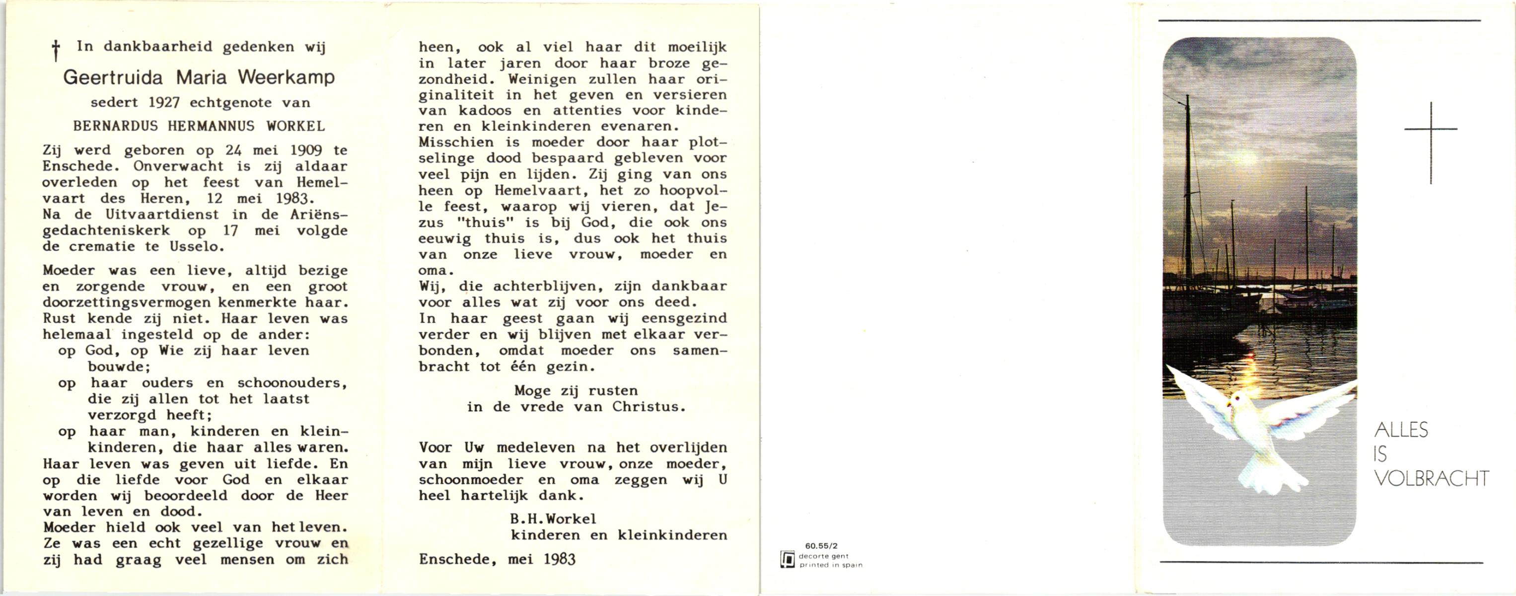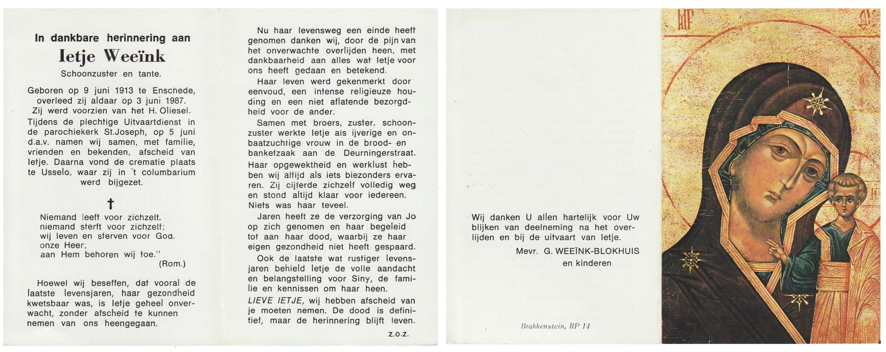 WENINK, Gerarda Maria, geboren op 6-8-1911 te Lonneker, overleden op 16-1-1982 te Oldenzaal op 70-jarige leeftijd, gecremeerd op 20-1-1982 te Usselo.