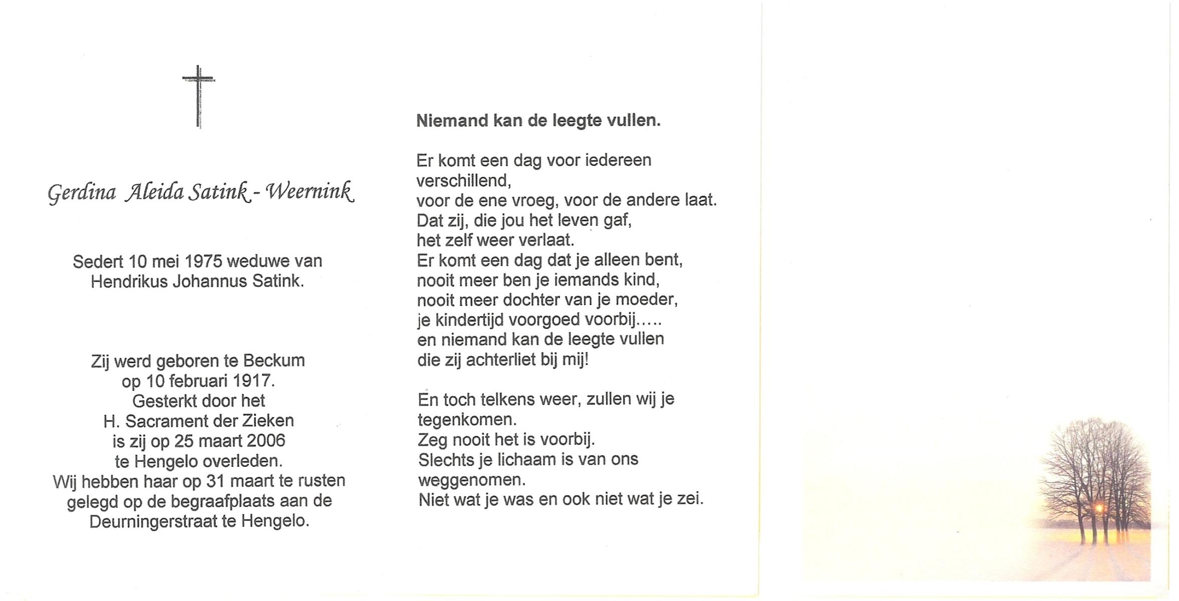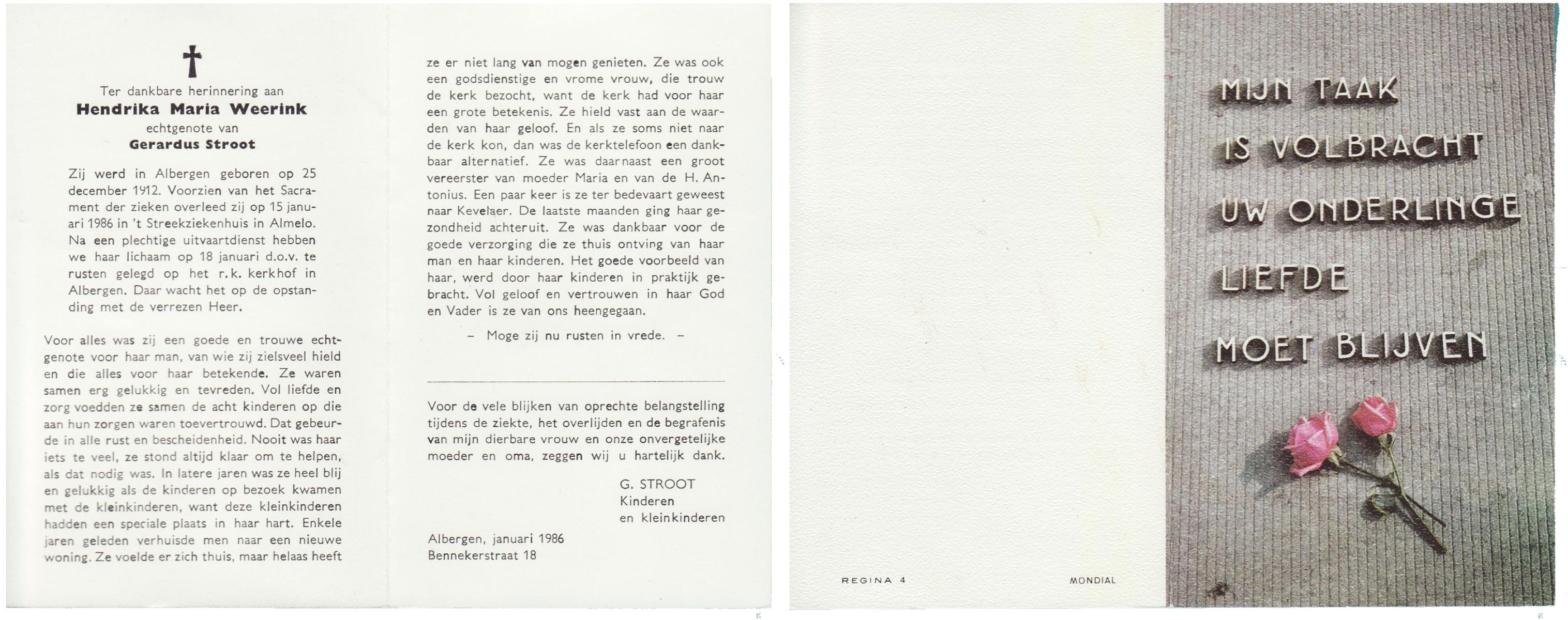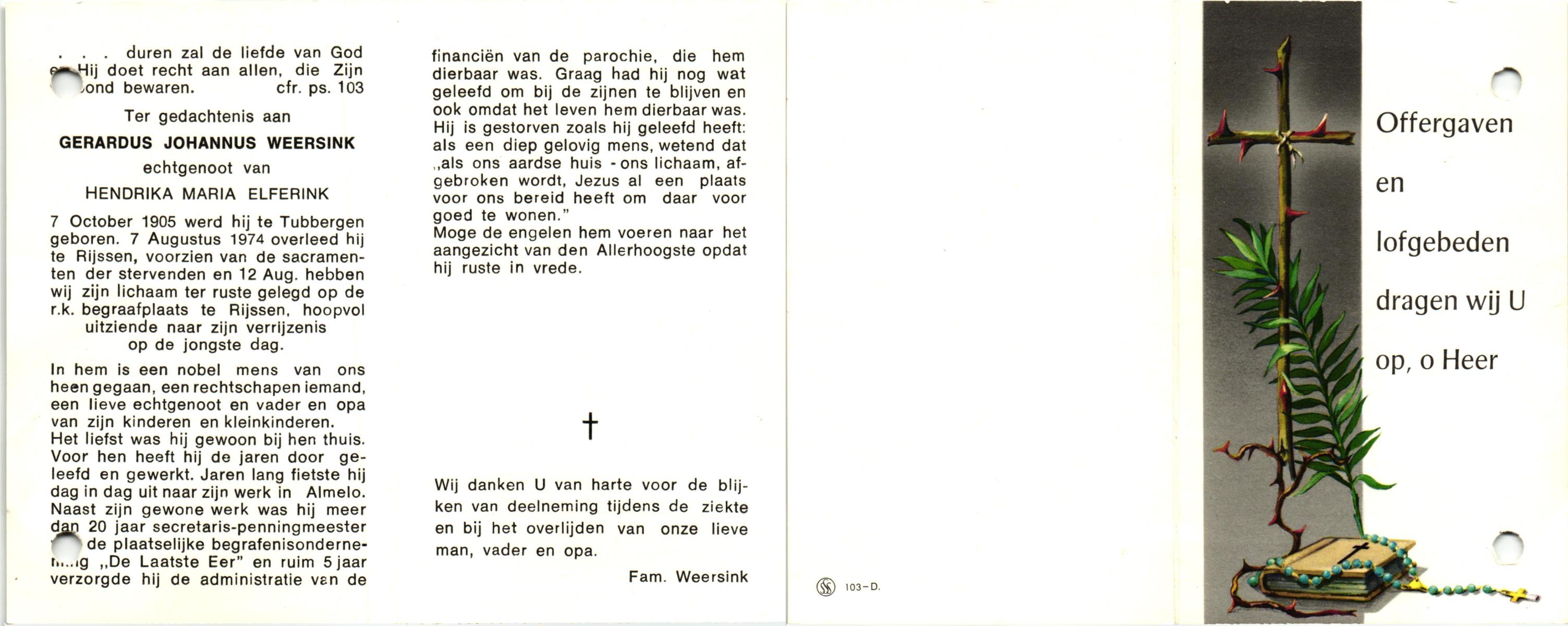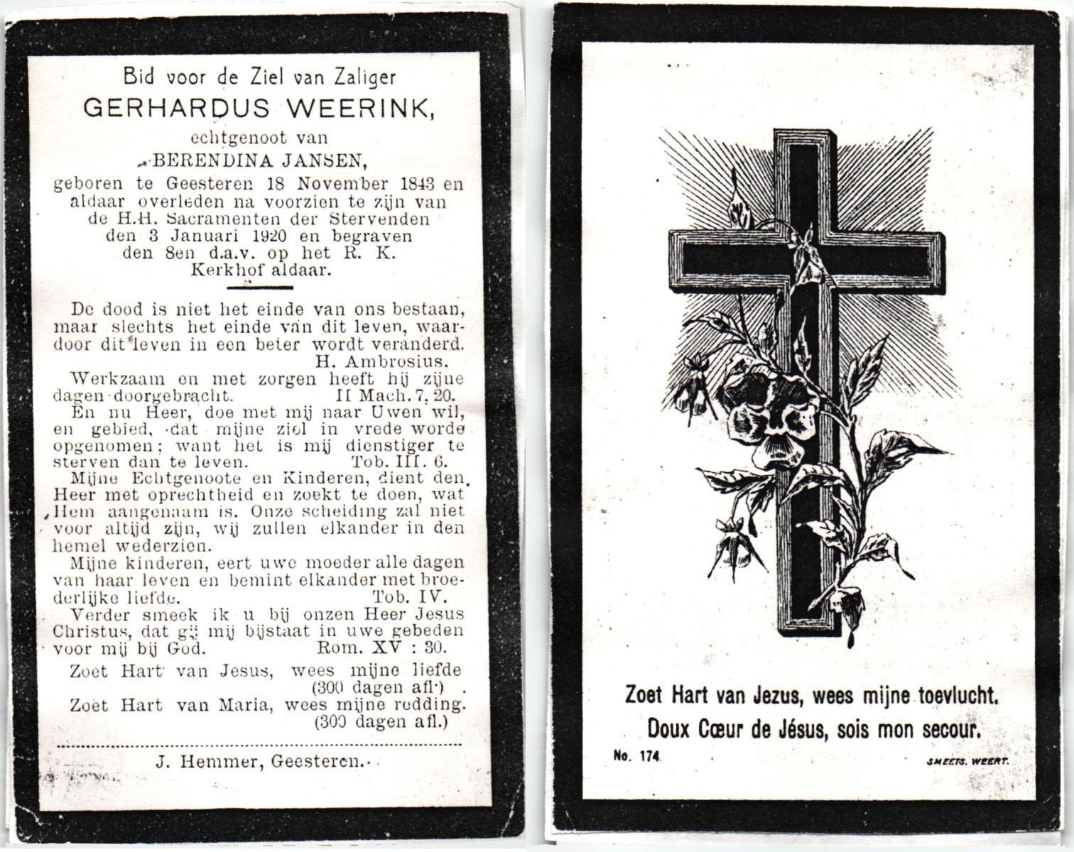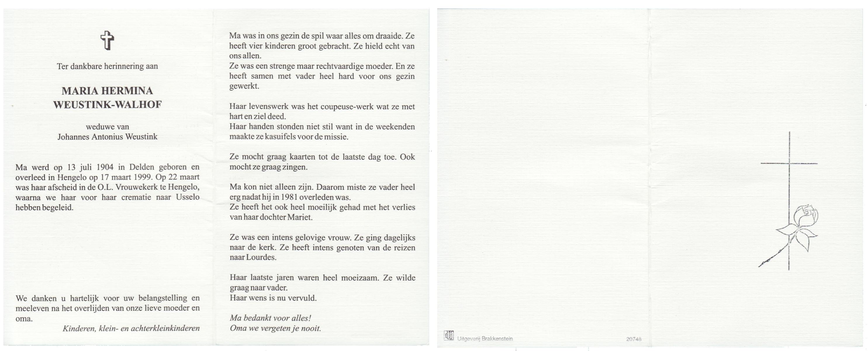 WENINK, Gerarda Maria, geboren op 6-8-1911 te Lonneker, overleden op 16-1-1982 te Oldenzaal op 70-jarige leeftijd, gecremeerd op 20-1-1982 te Usselo.