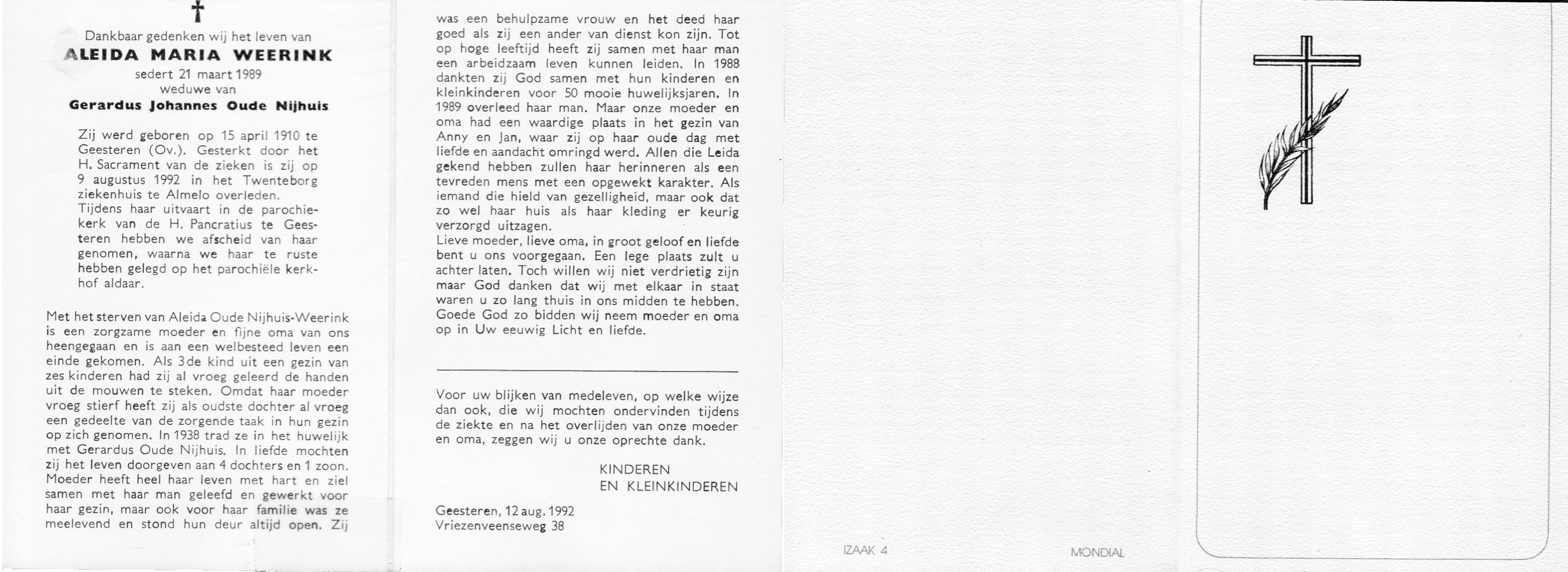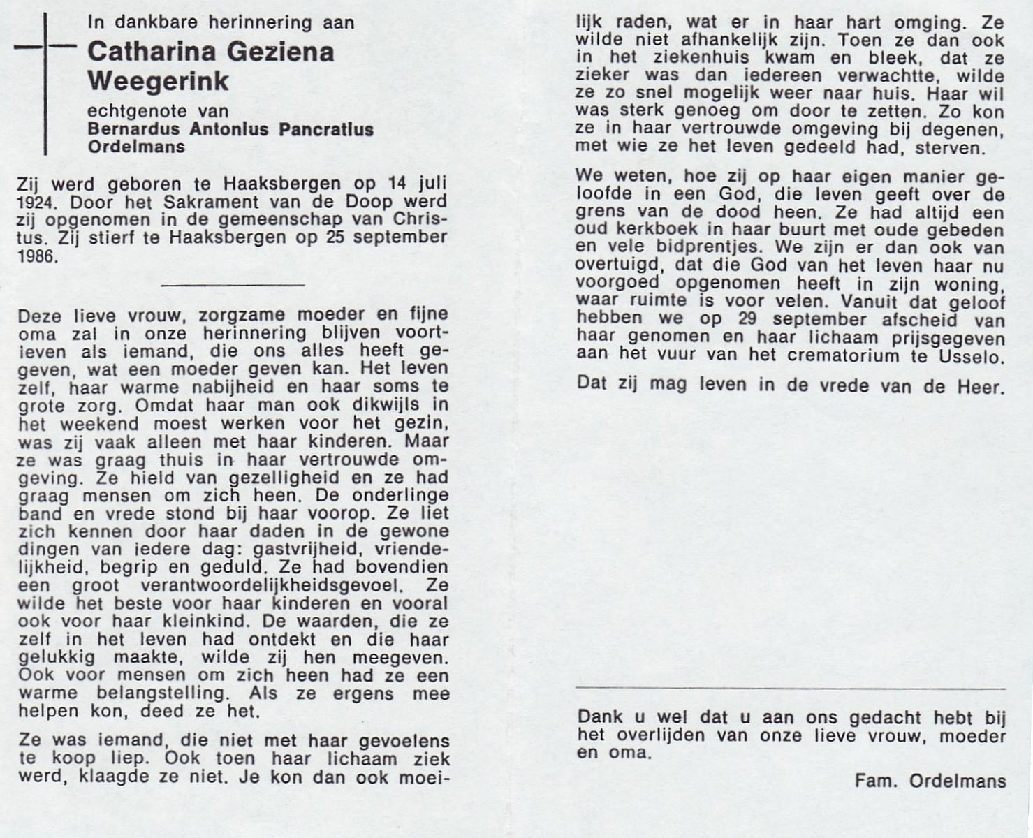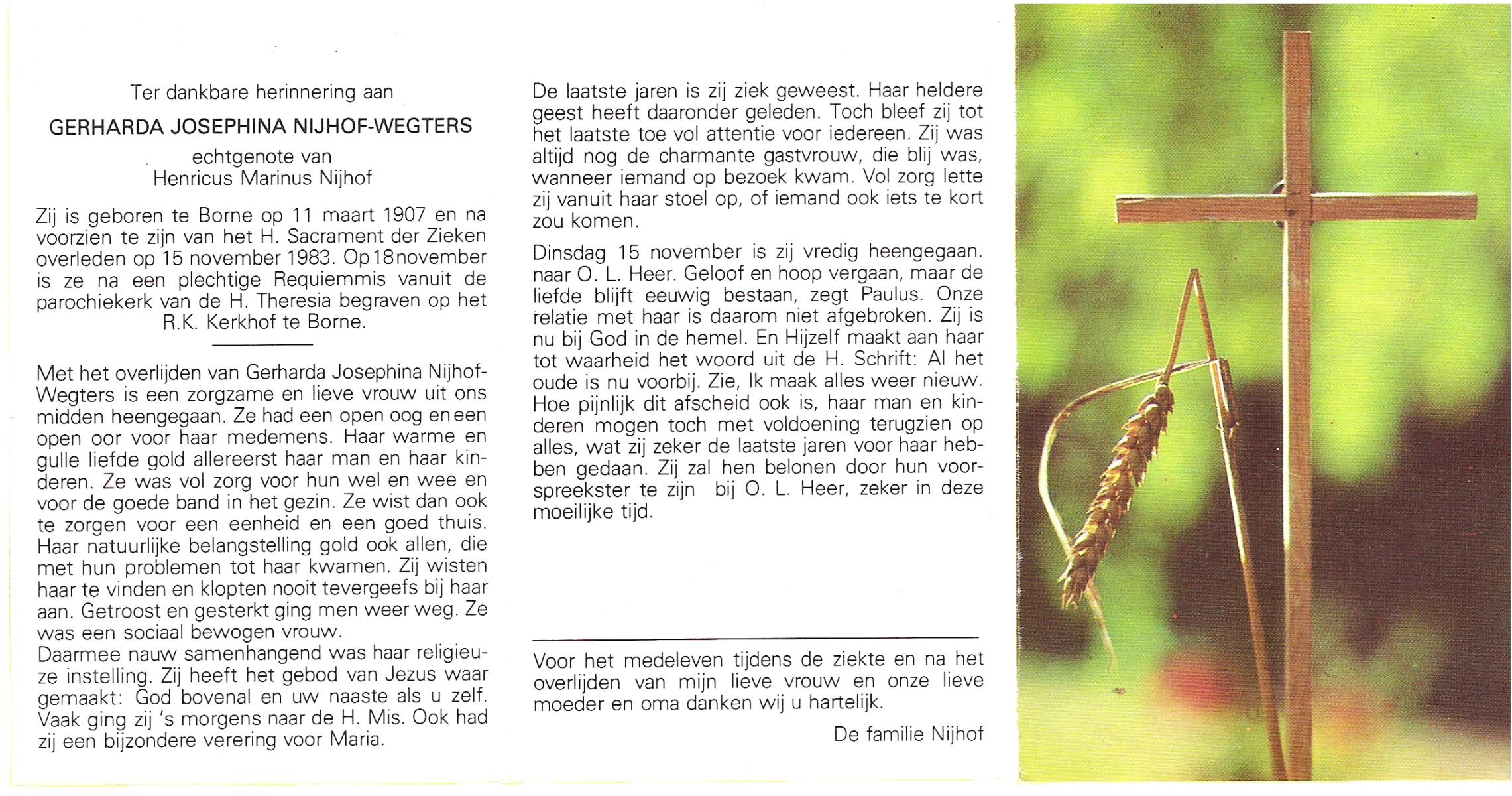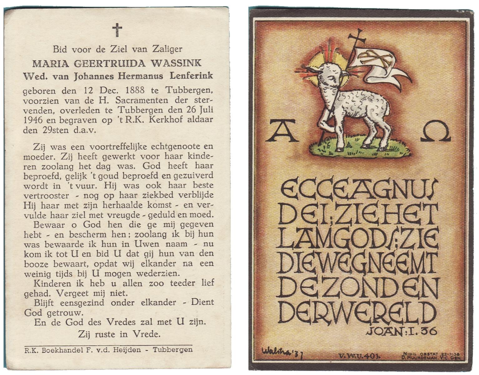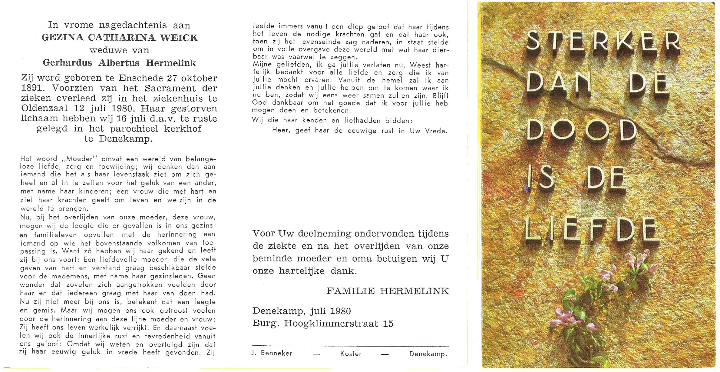 WENINK, Gerarda Maria, geboren op 6-8-1911 te Lonneker, overleden op 16-1-1982 te Oldenzaal op 70-jarige leeftijd, gecremeerd op 20-1-1982 te Usselo.
