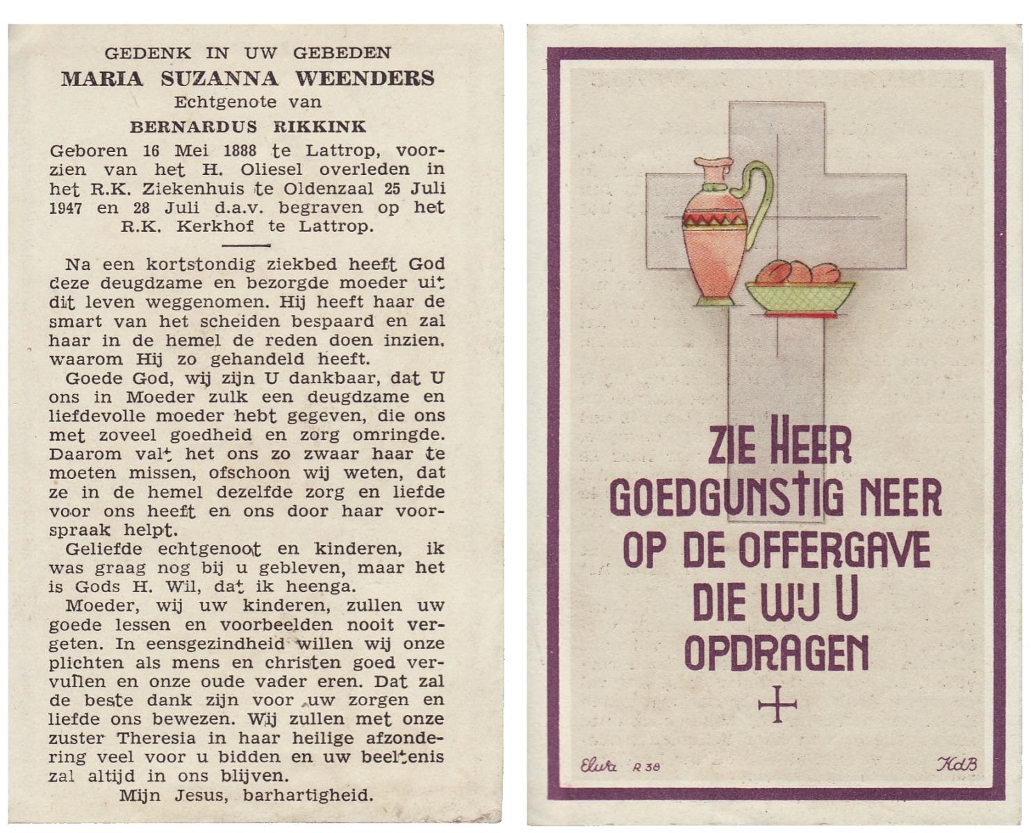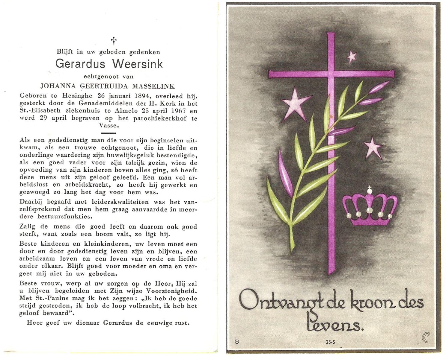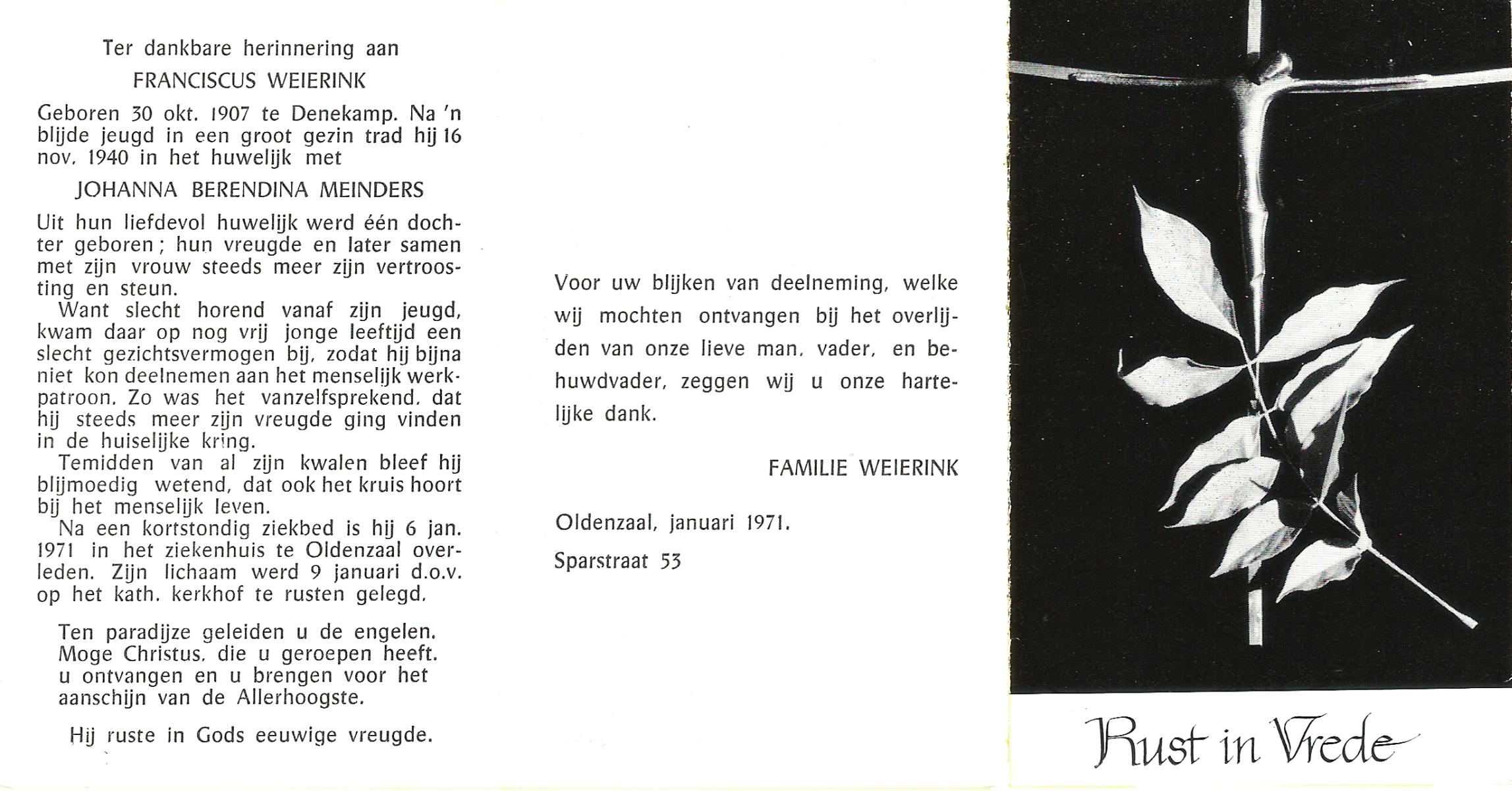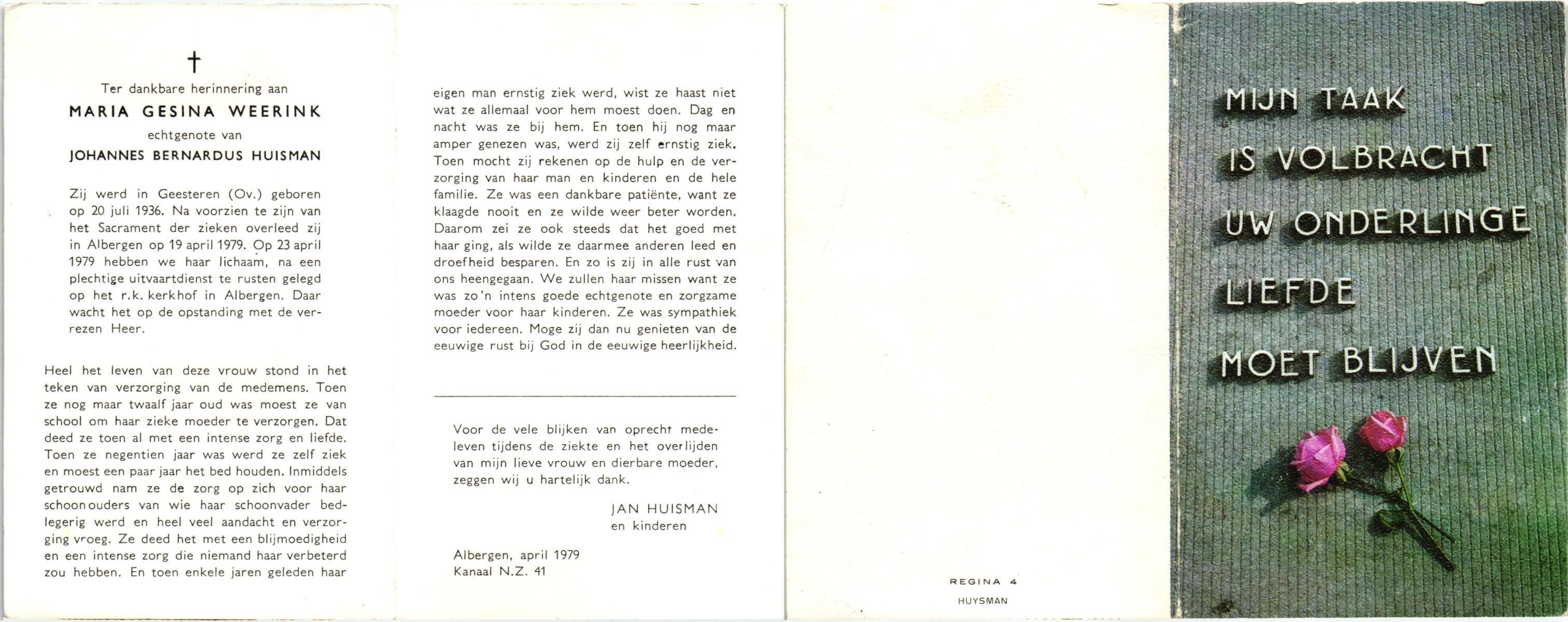 WENINK, Gerarda Maria, geboren op 6-8-1911 te Lonneker, overleden op 16-1-1982 te Oldenzaal op 70-jarige leeftijd, gecremeerd op 20-1-1982 te Usselo.