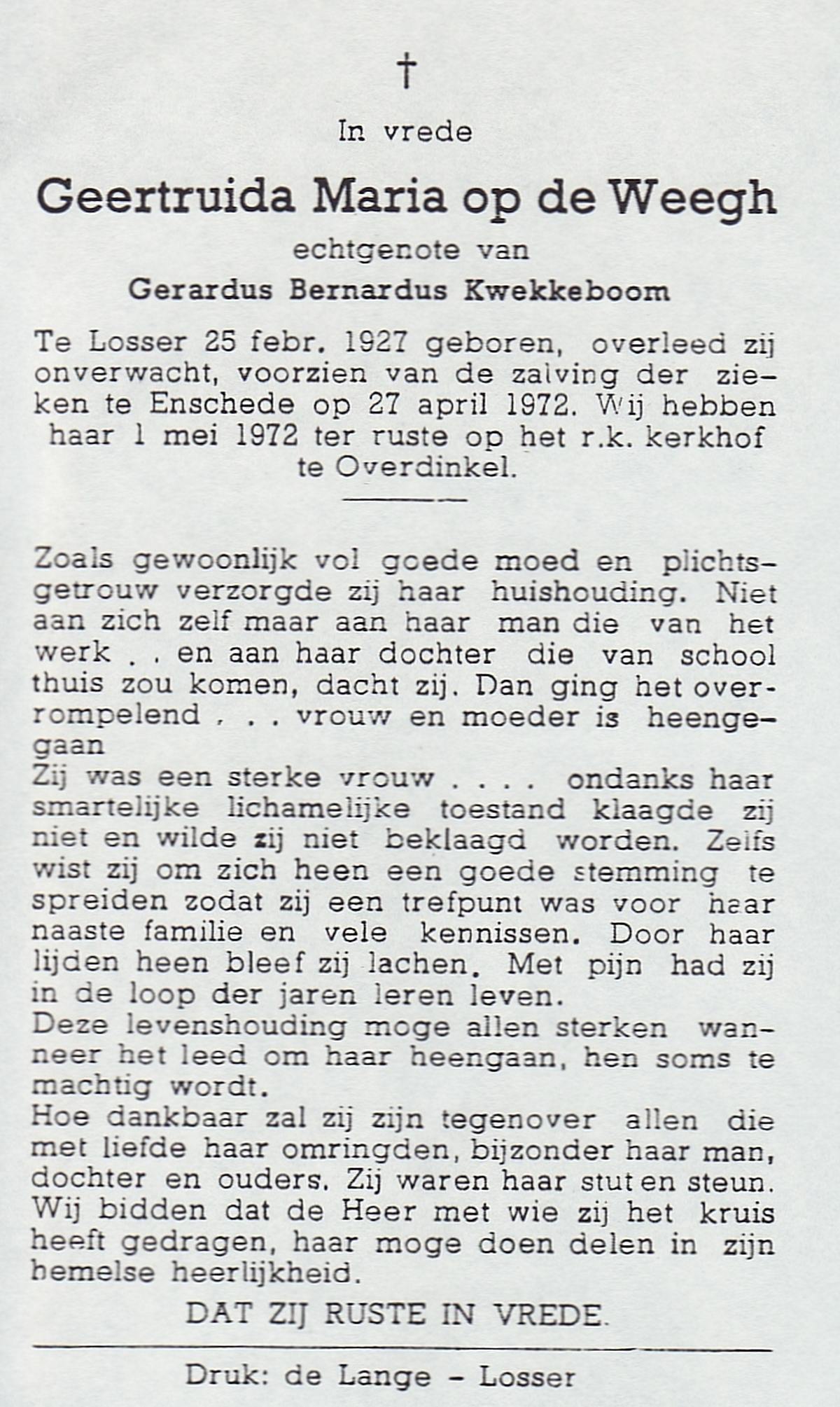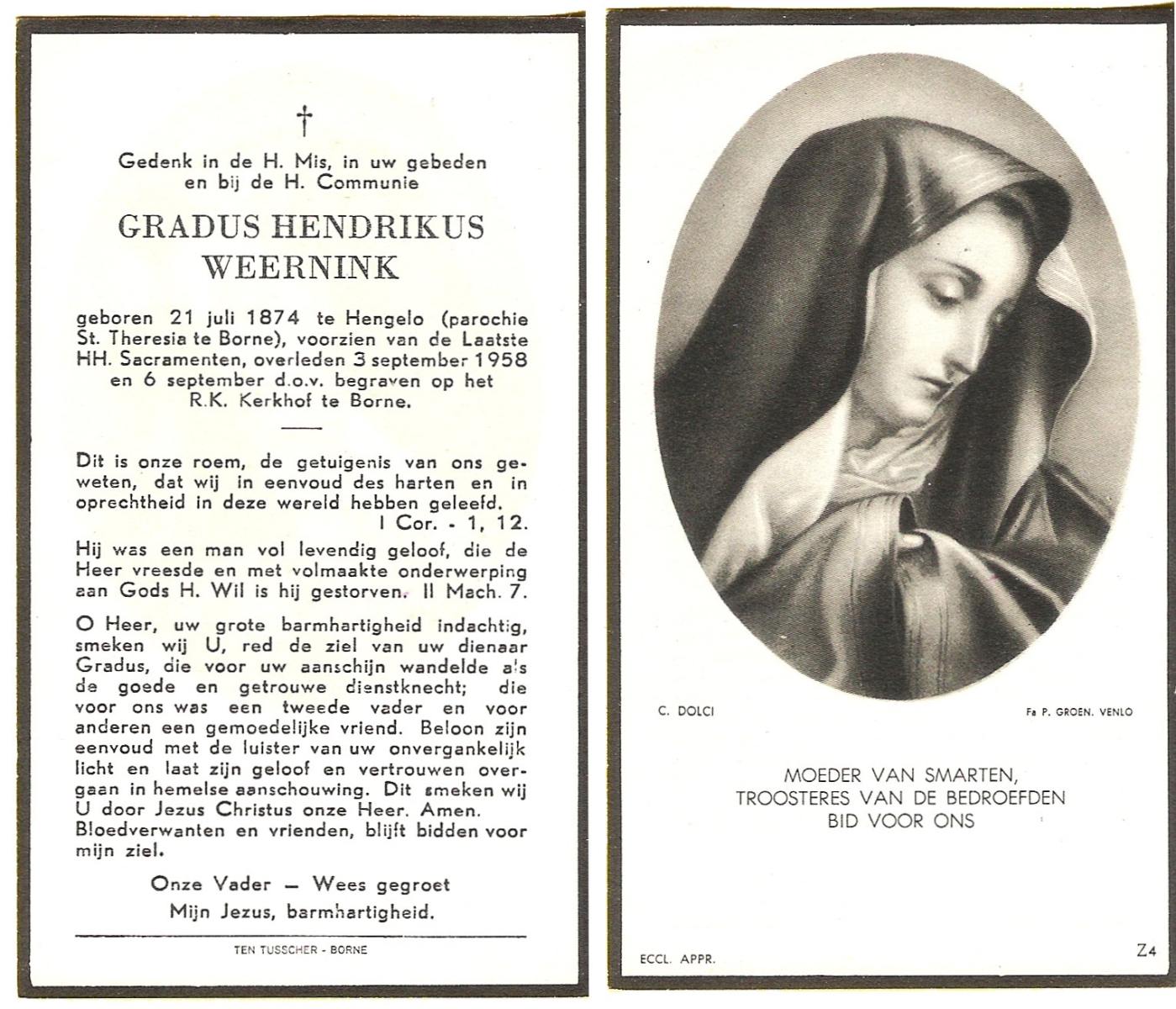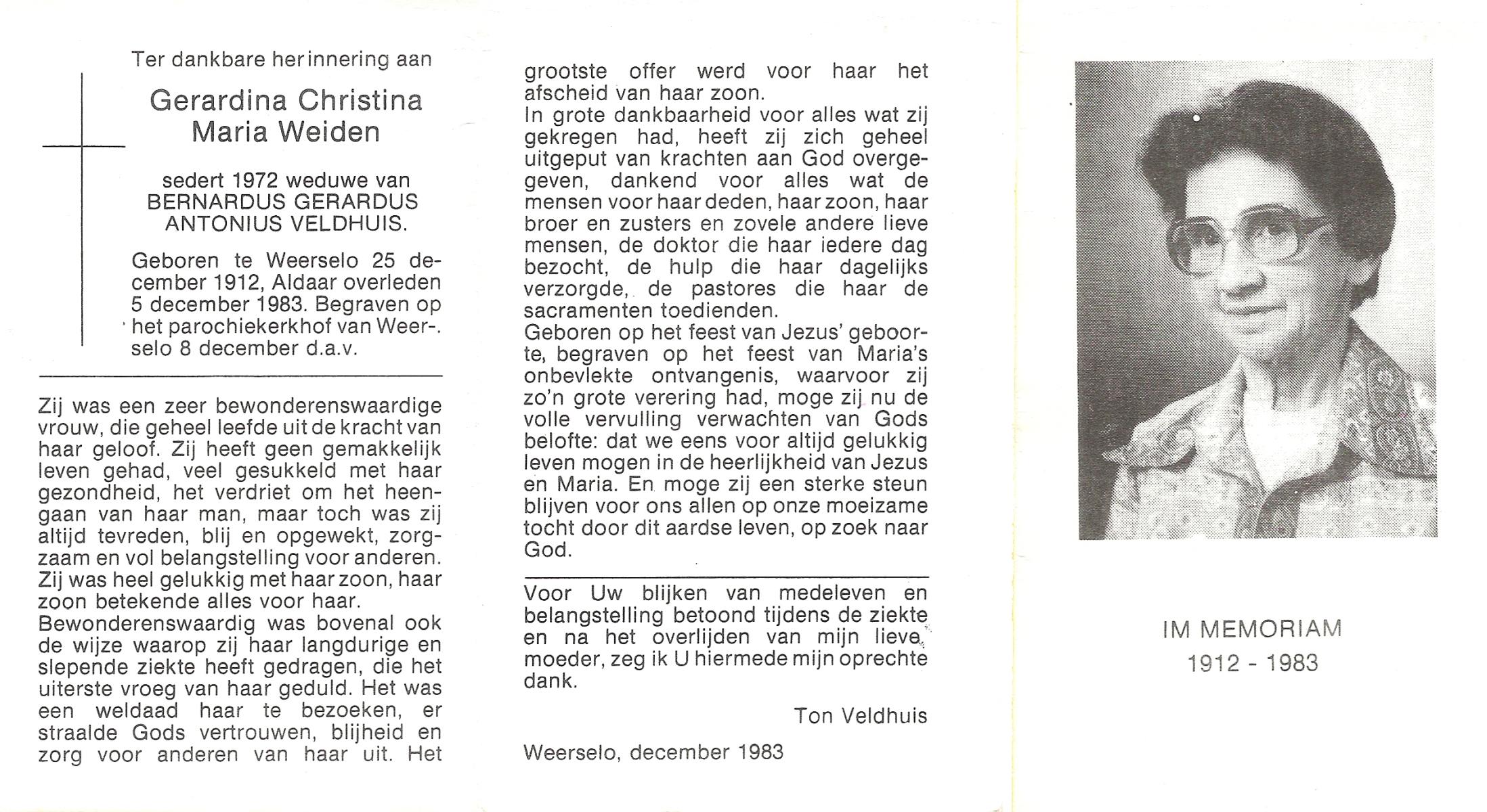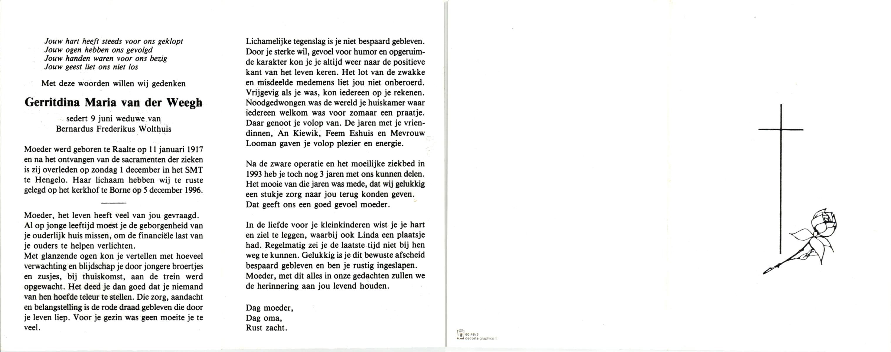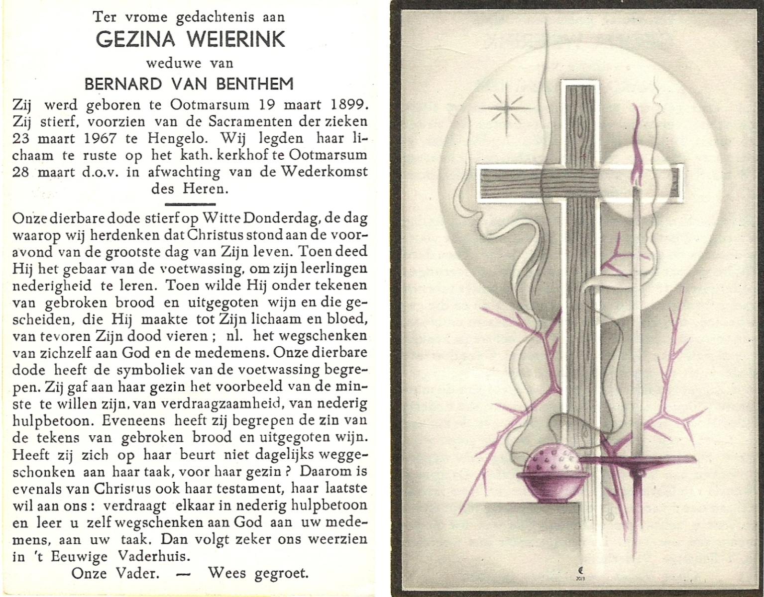 WENINK, Gerarda Maria, geboren op 6-8-1911 te Lonneker, overleden op 16-1-1982 te Oldenzaal op 70-jarige leeftijd, gecremeerd op 20-1-1982 te Usselo.