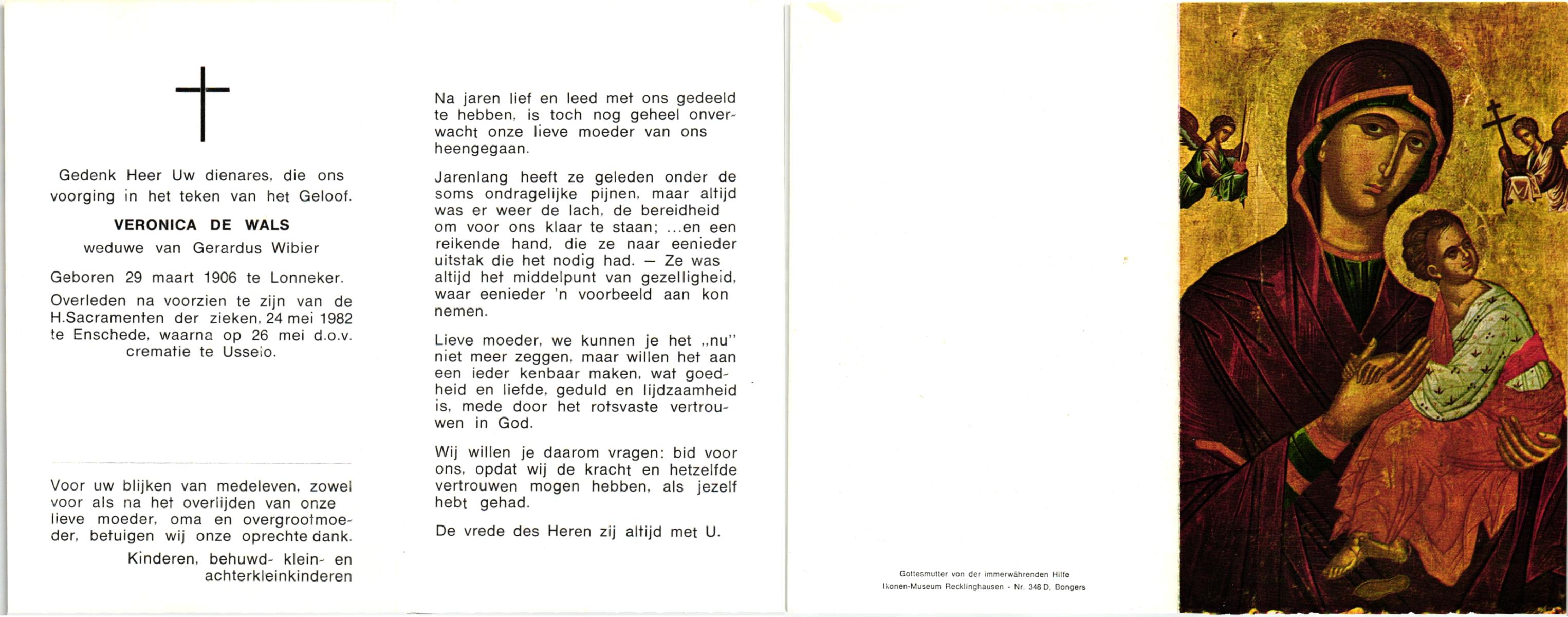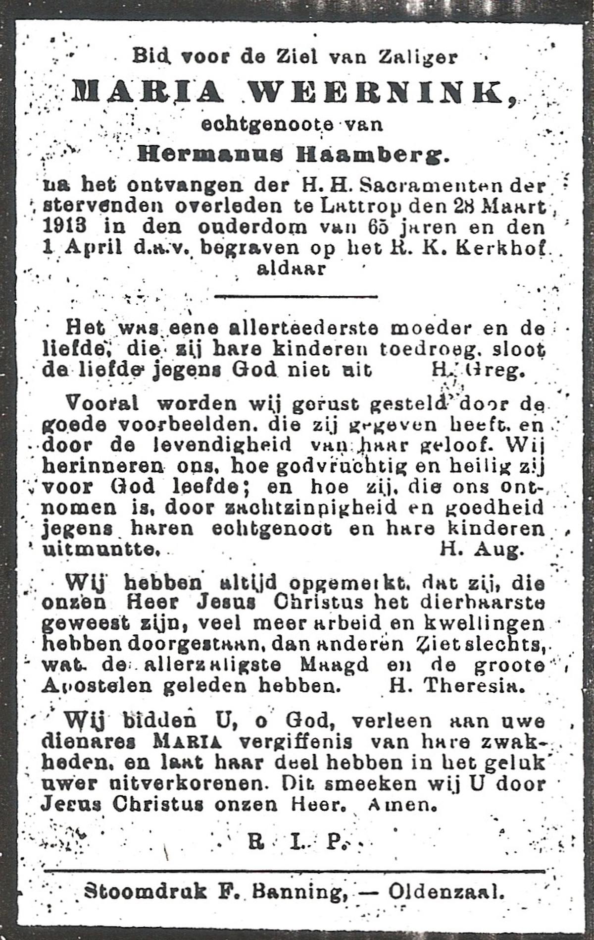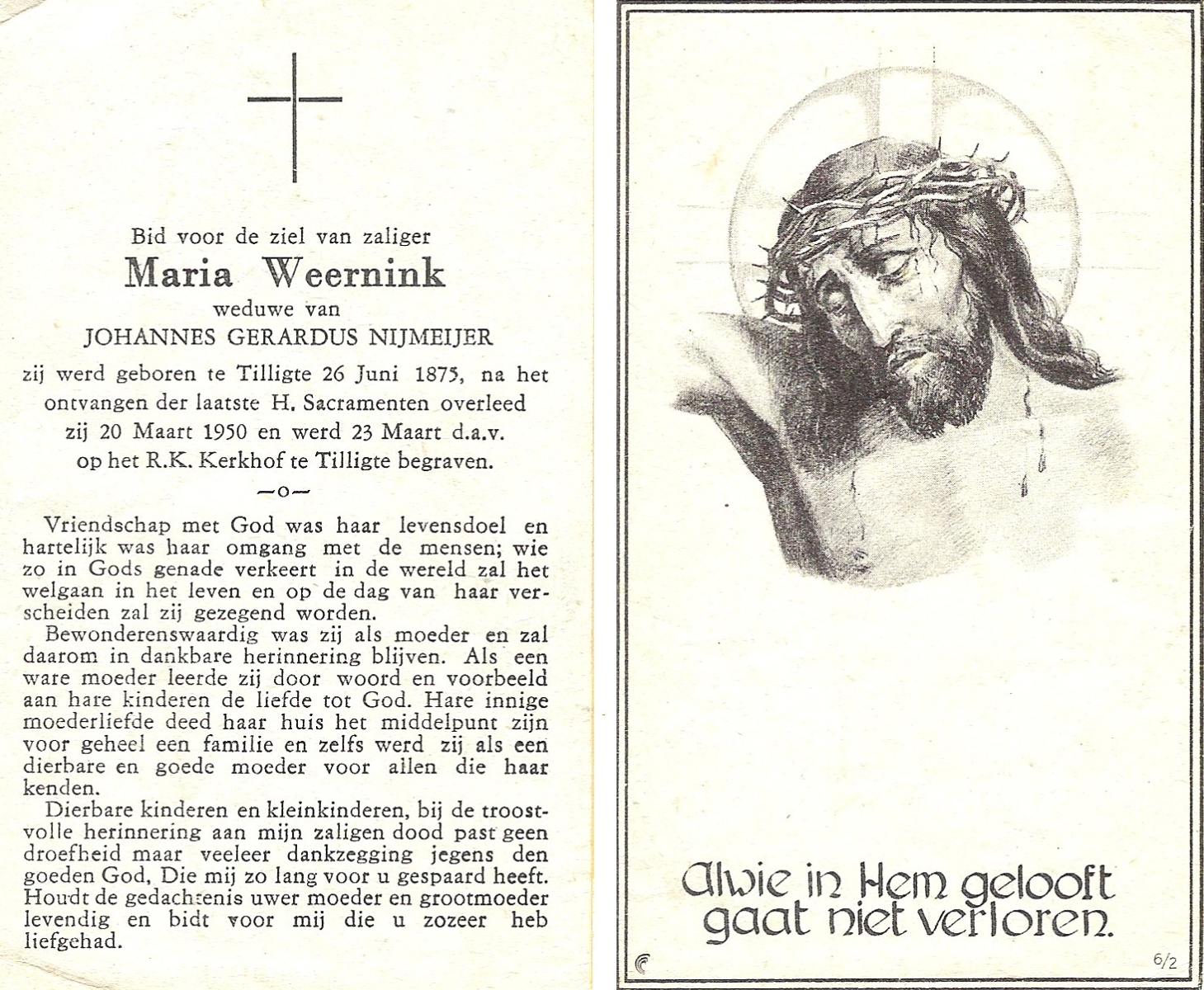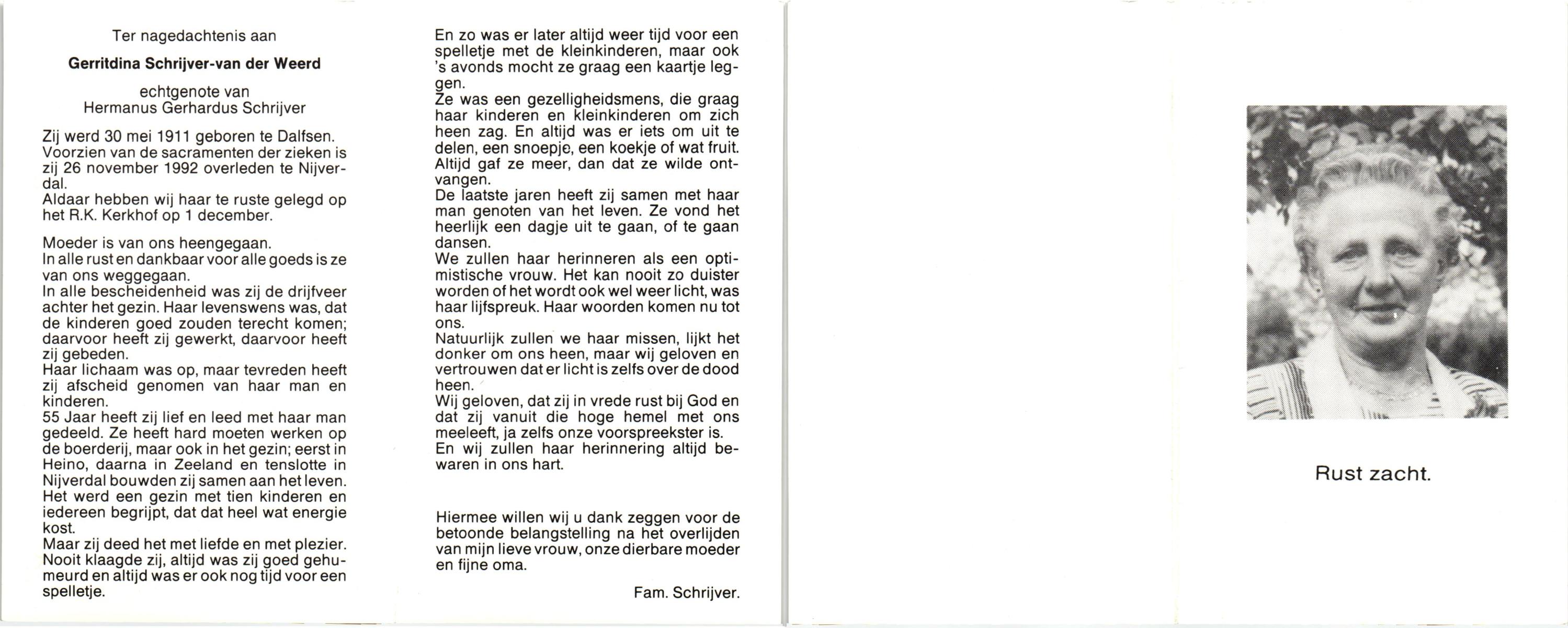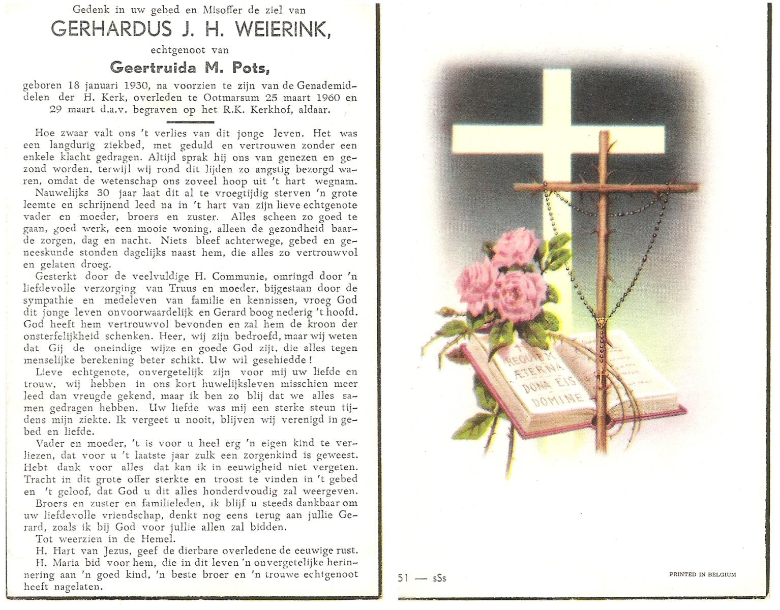 WENINK, Gerarda Maria, geboren op 6-8-1911 te Lonneker, overleden op 16-1-1982 te Oldenzaal op 70-jarige leeftijd, gecremeerd op 20-1-1982 te Usselo.