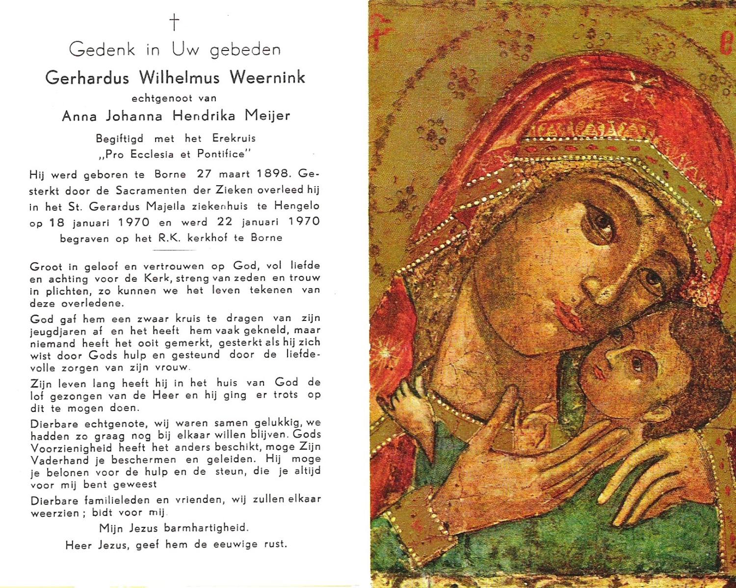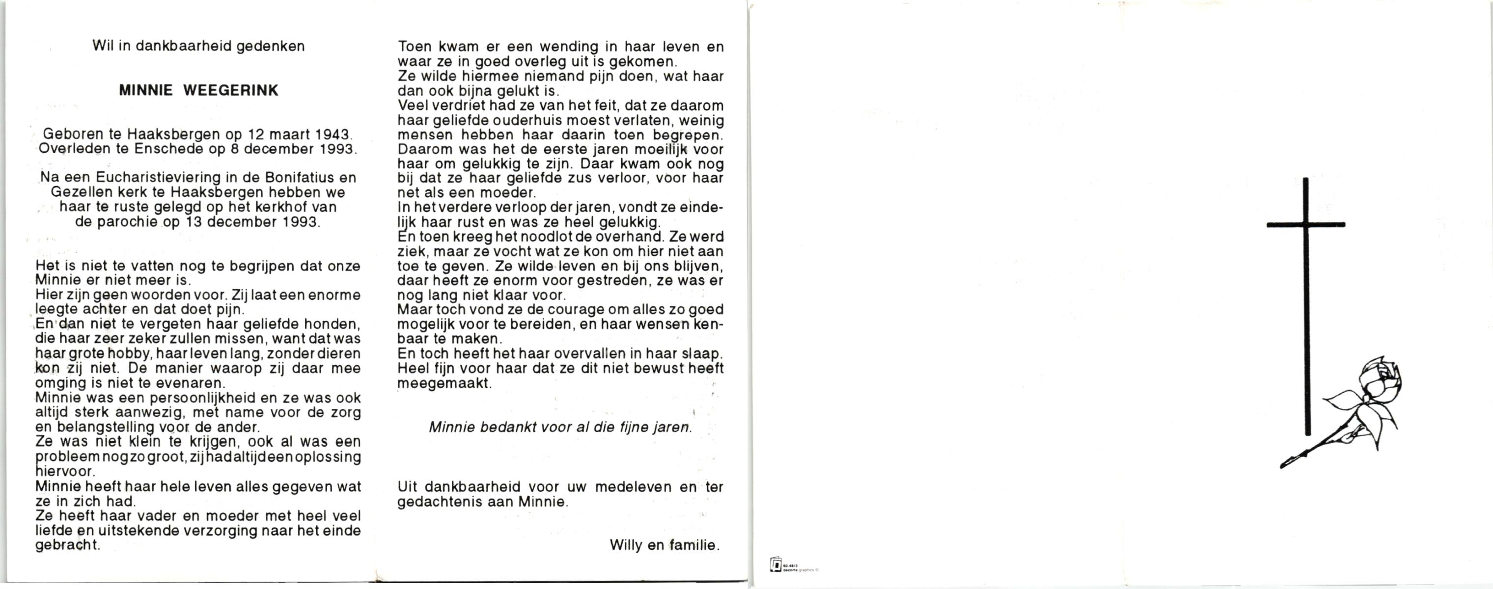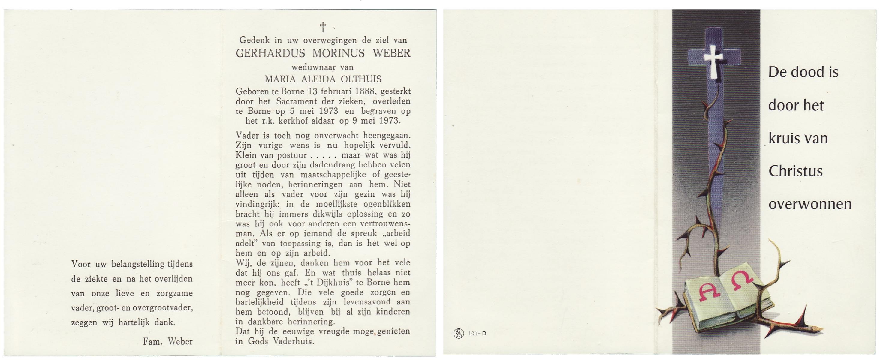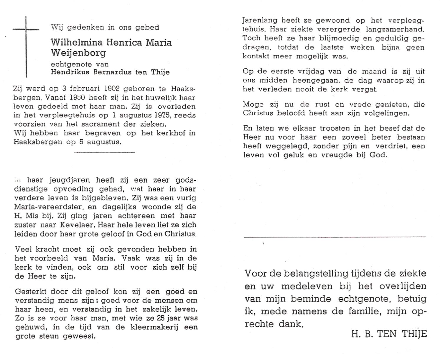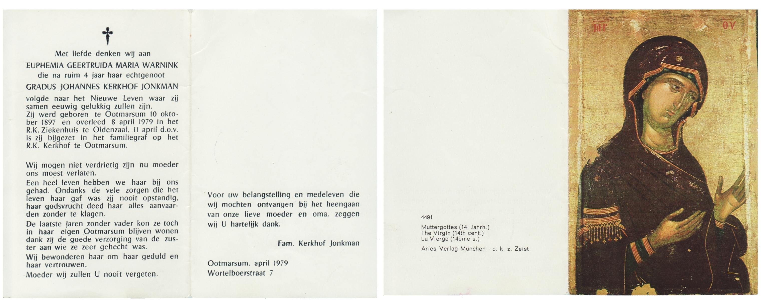 WENINK, Gerarda Maria, geboren op 6-8-1911 te Lonneker, overleden op 16-1-1982 te Oldenzaal op 70-jarige leeftijd, gecremeerd op 20-1-1982 te Usselo.