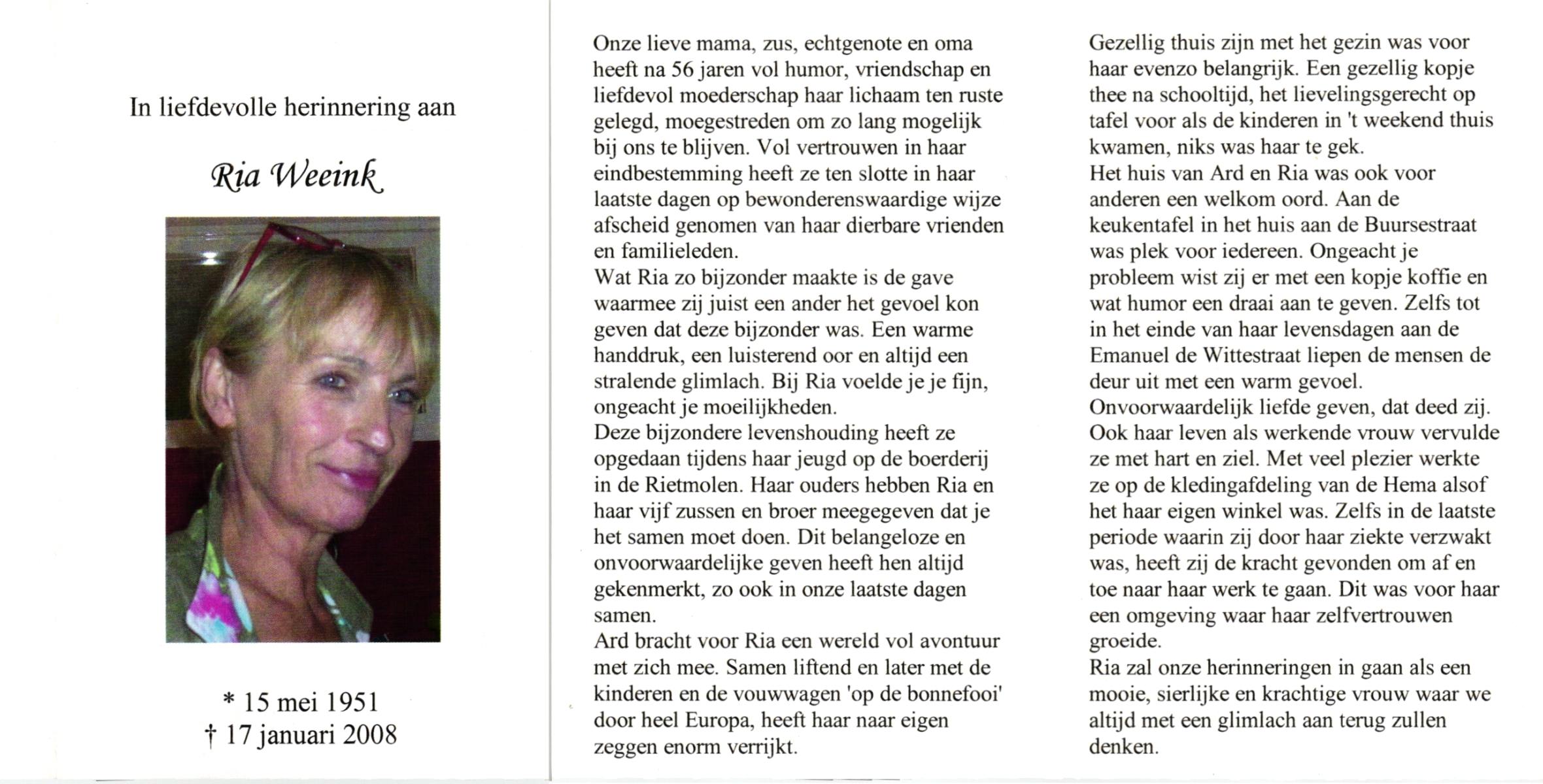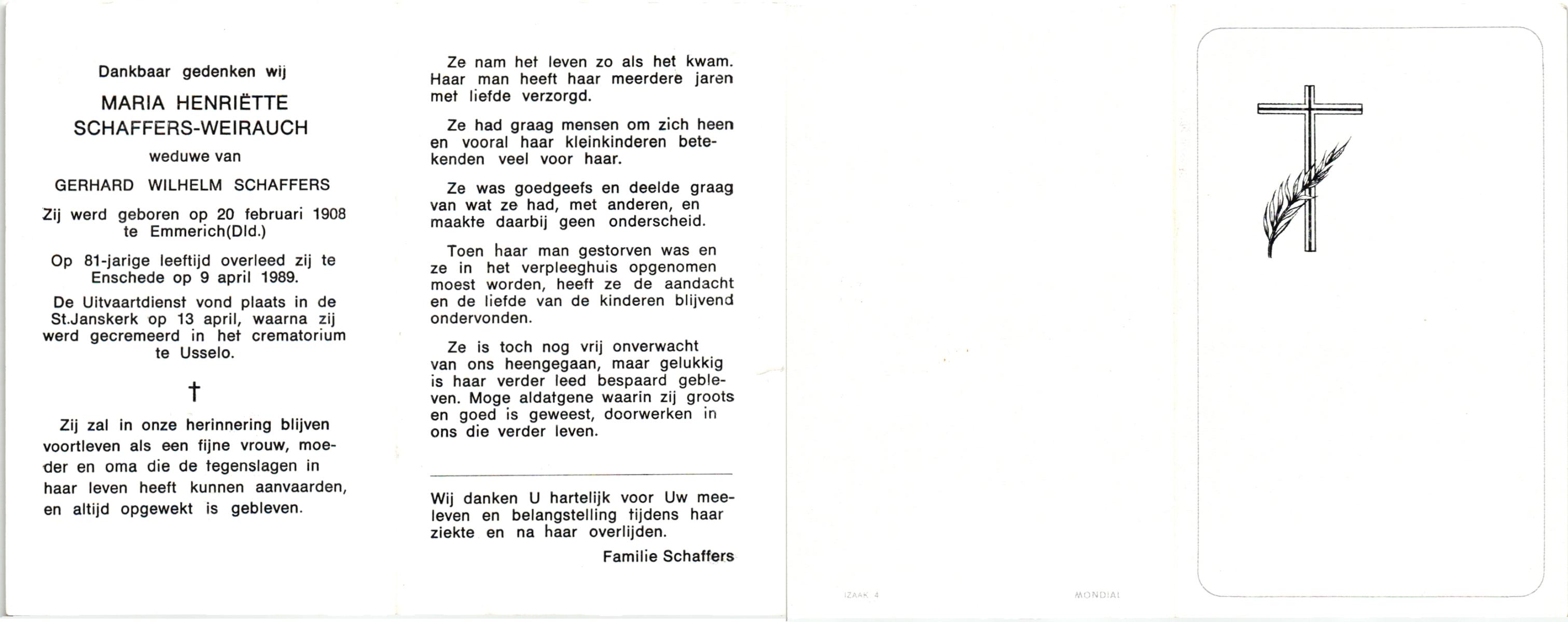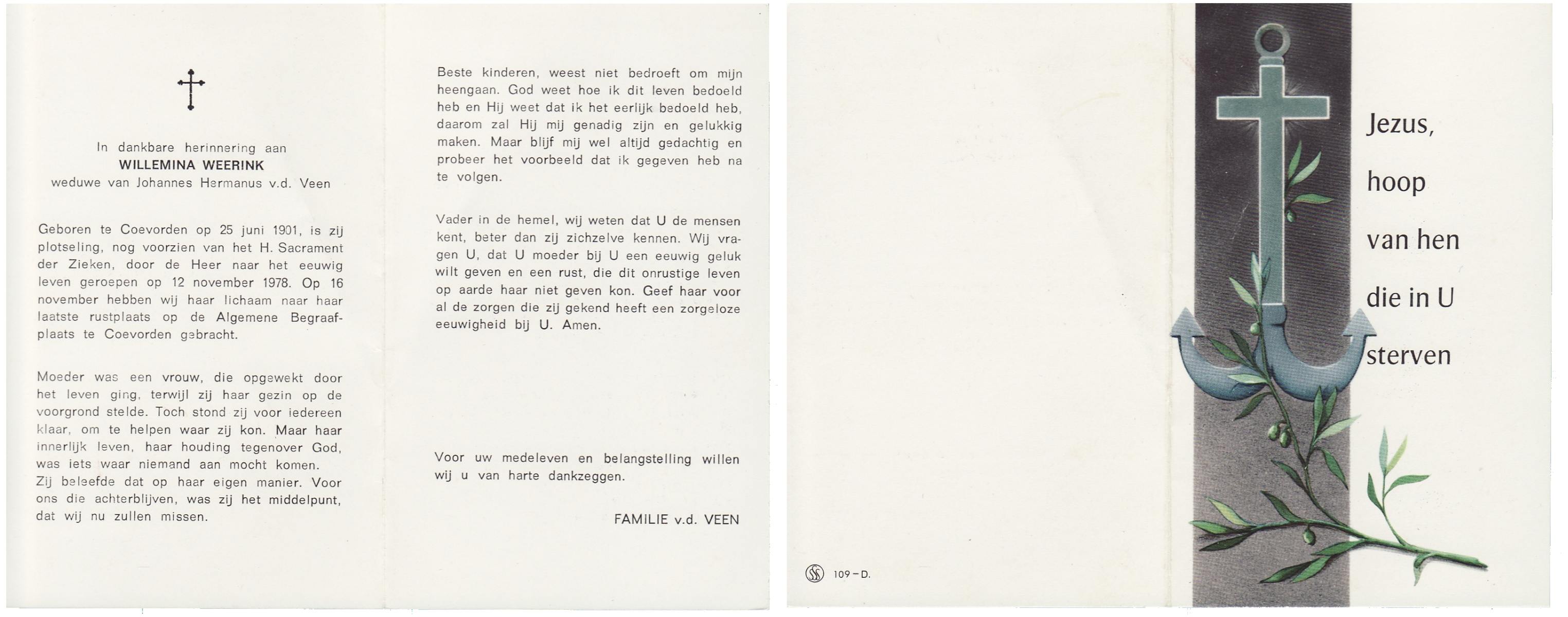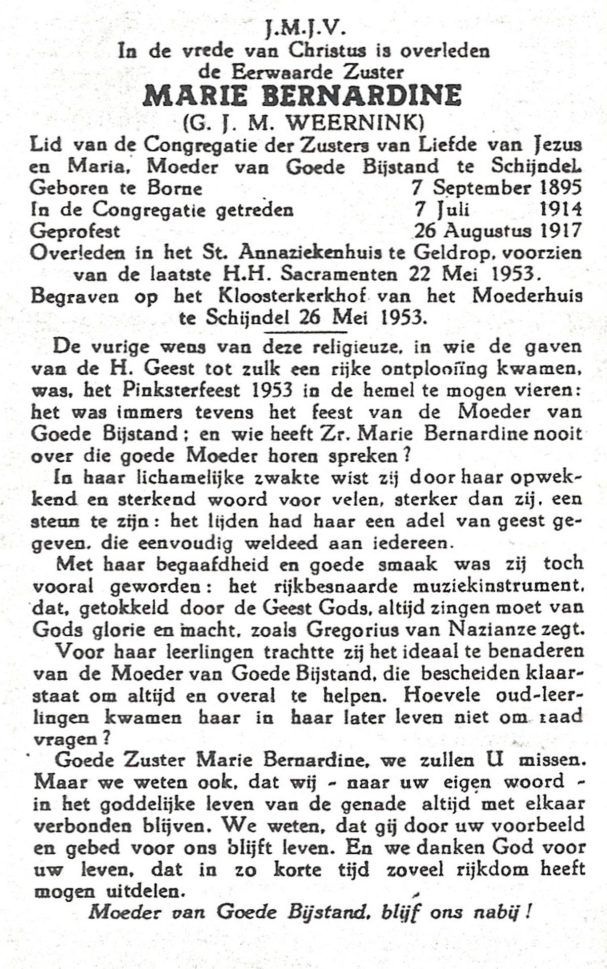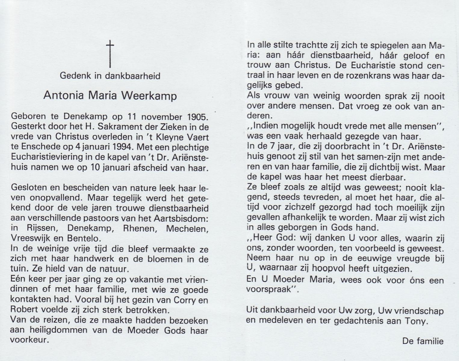 WENINK, Gerarda Maria, geboren op 6-8-1911 te Lonneker, overleden op 16-1-1982 te Oldenzaal op 70-jarige leeftijd, gecremeerd op 20-1-1982 te Usselo.