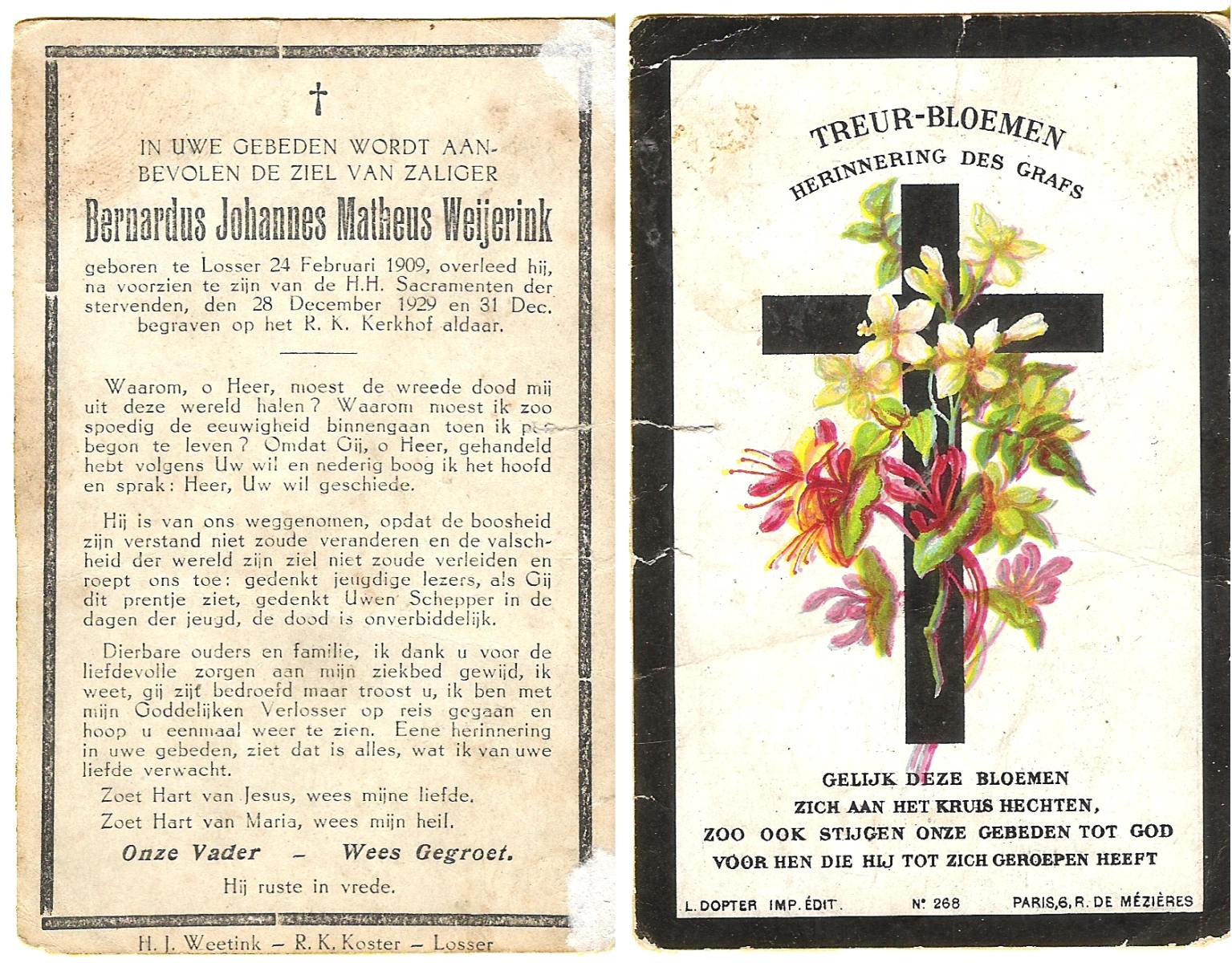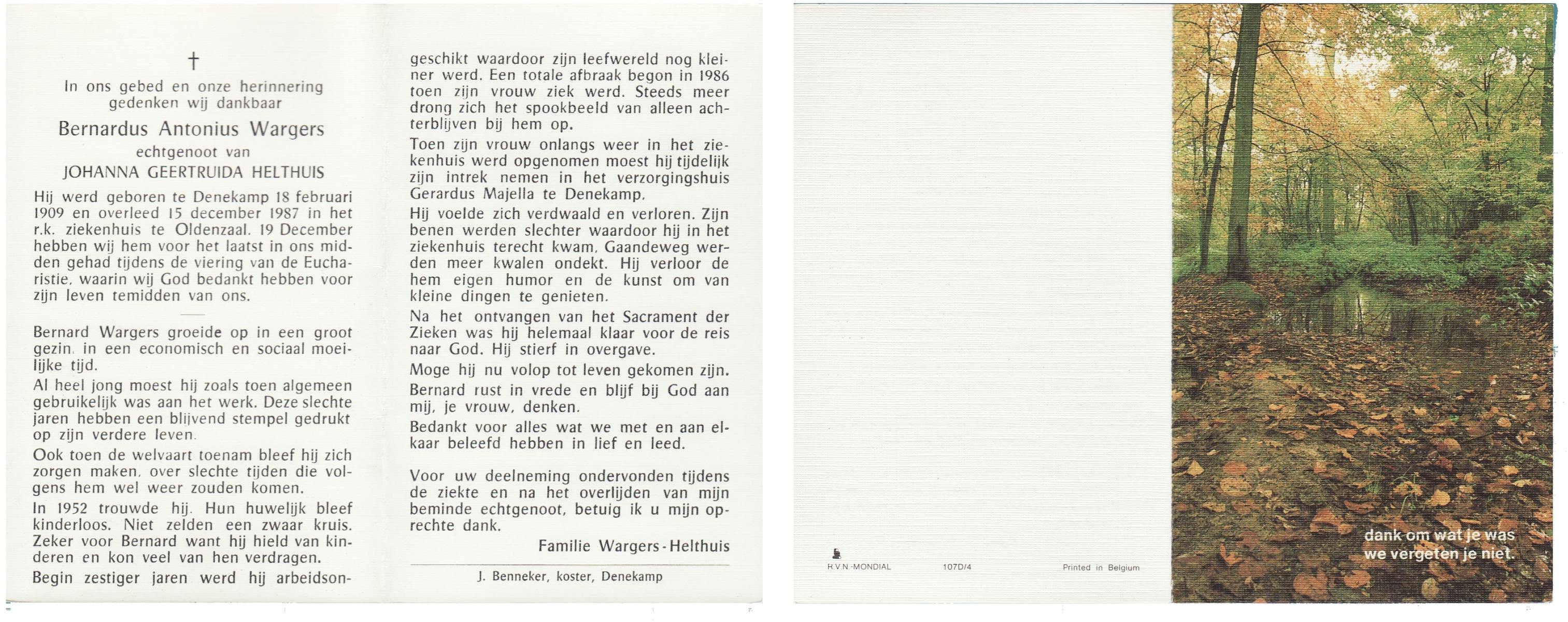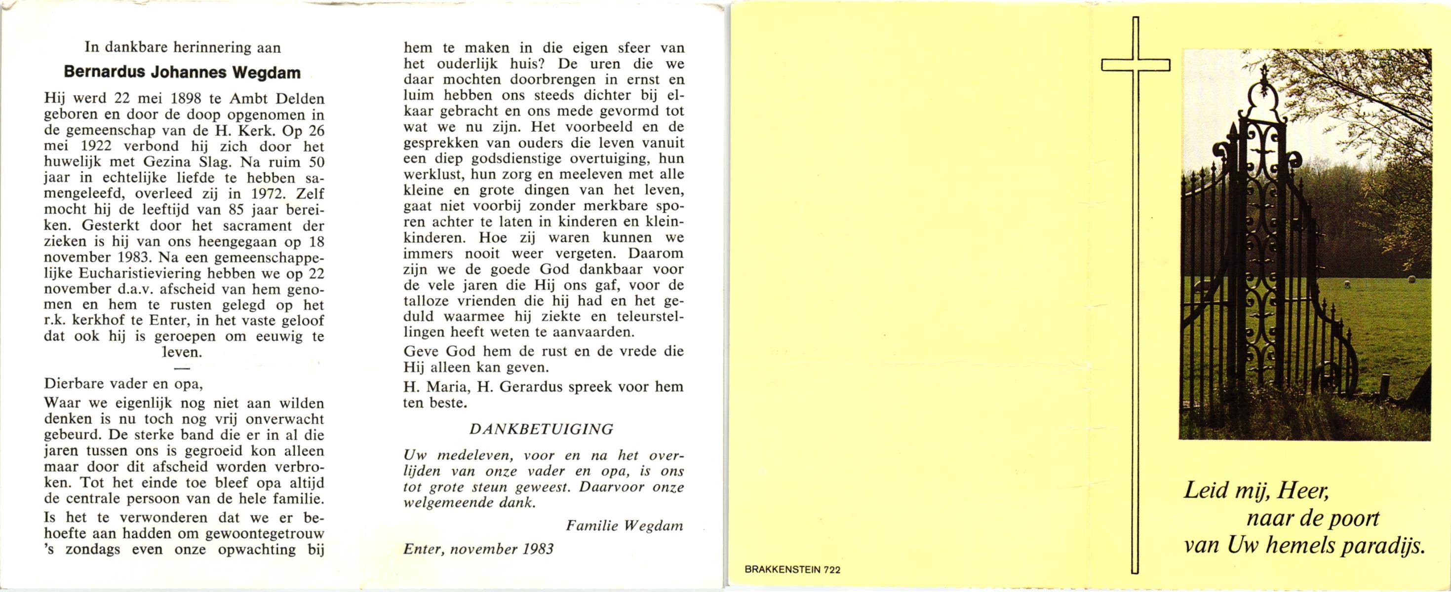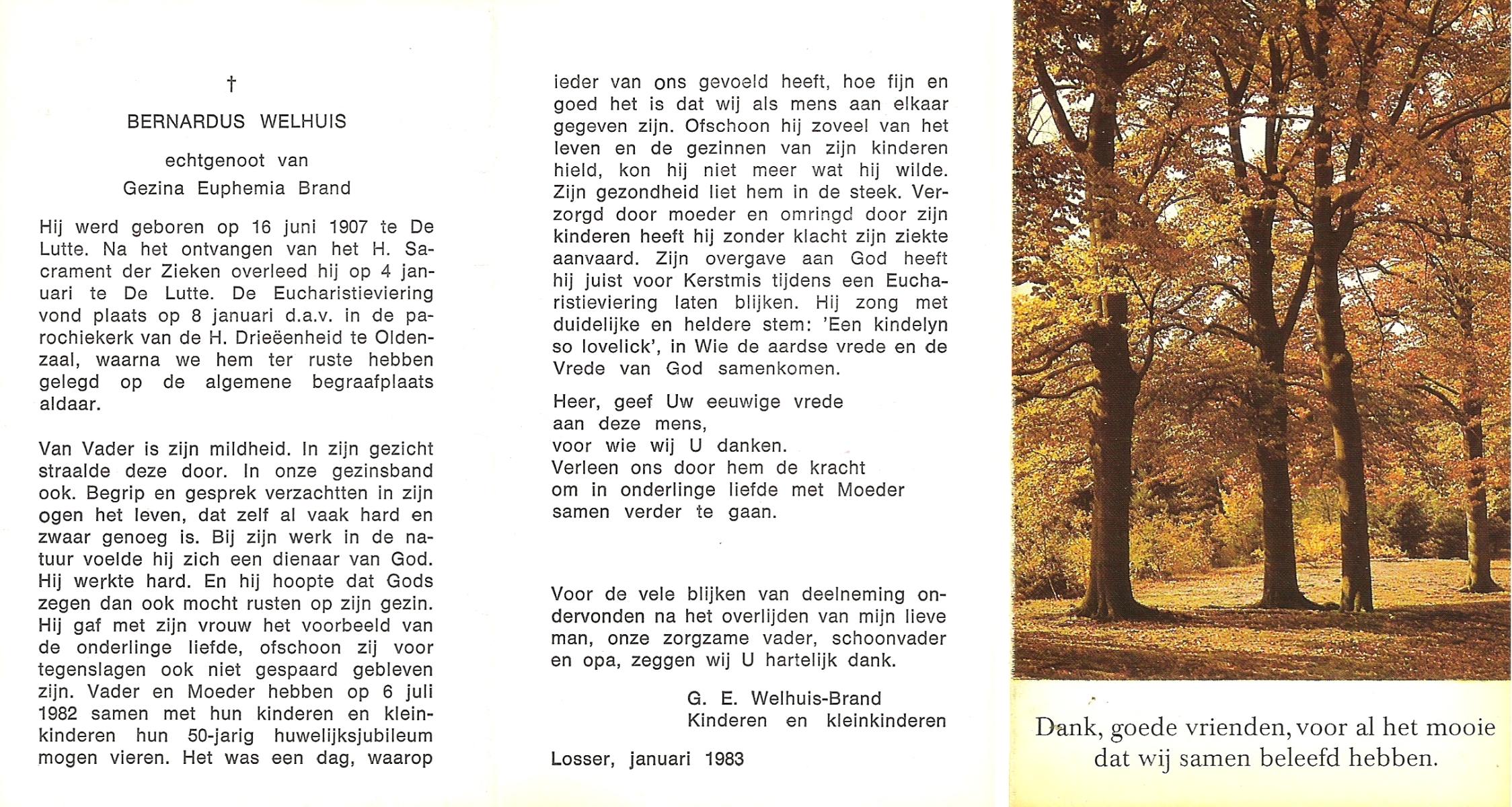 WELHUIS, Bernardus, geboren op 16-6-1907 te De Lutte, overleden op 4-1-1983 te De Lutte op 75-jarige leeftijd, begraven op 8-1-1983 te Oldenzaal.