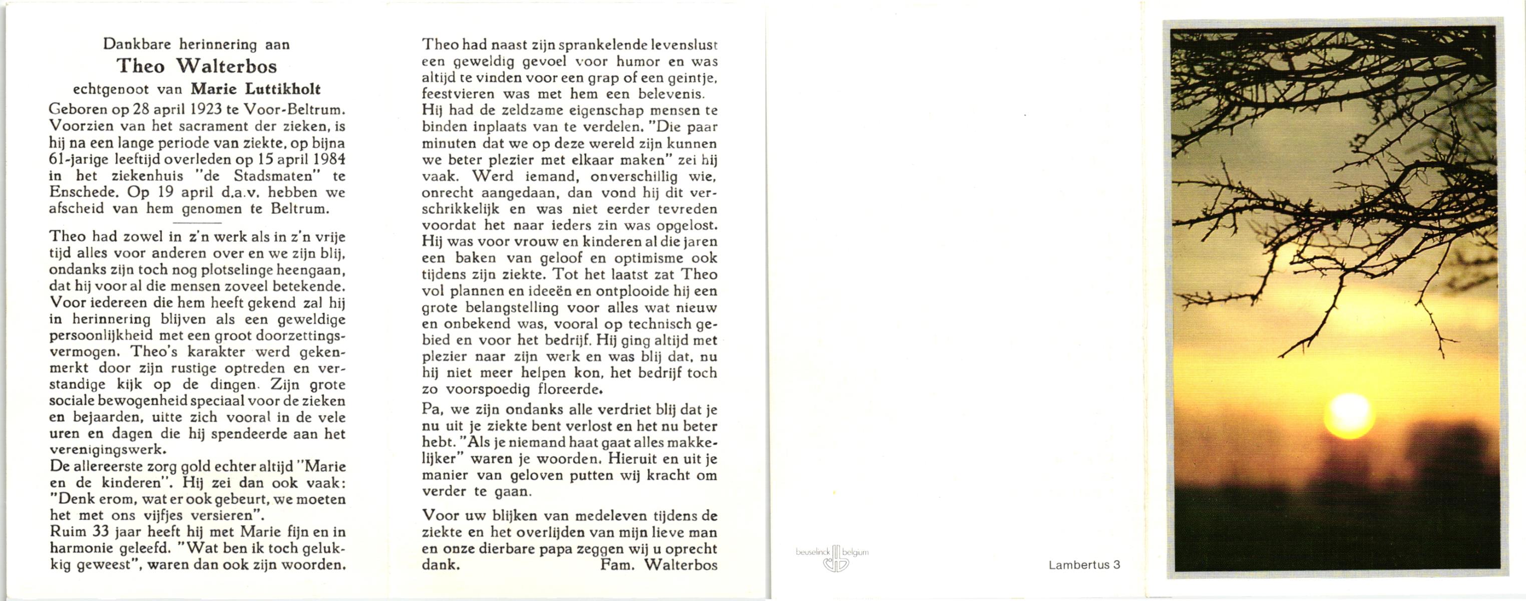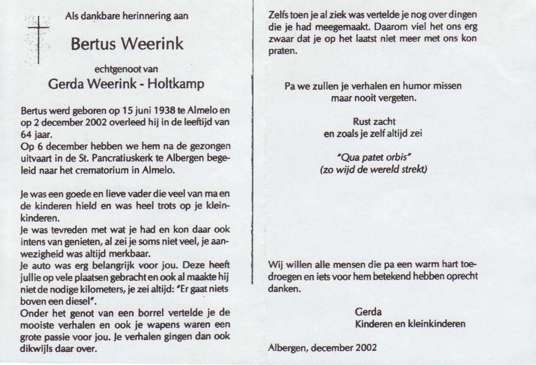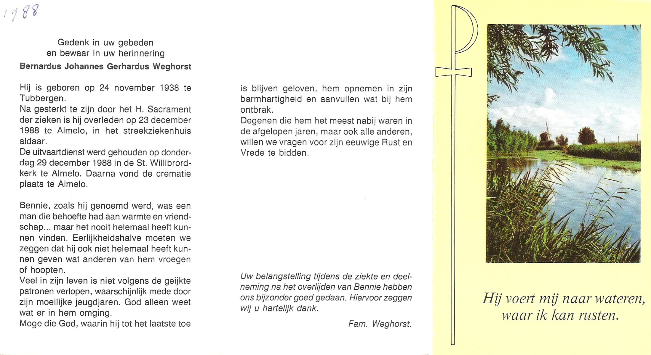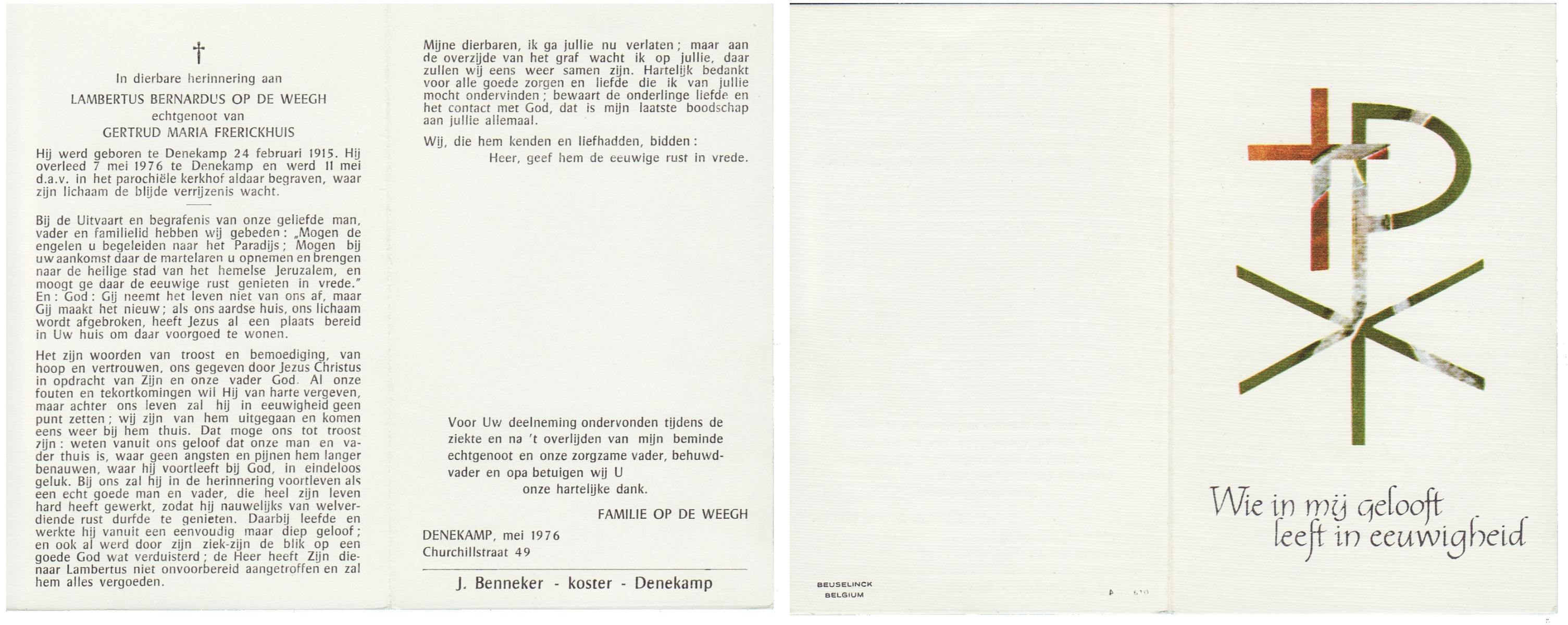 WELHUIS, Bernardus, geboren op 16-6-1907 te De Lutte, overleden op 4-1-1983 te De Lutte op 75-jarige leeftijd, begraven op 8-1-1983 te Oldenzaal.