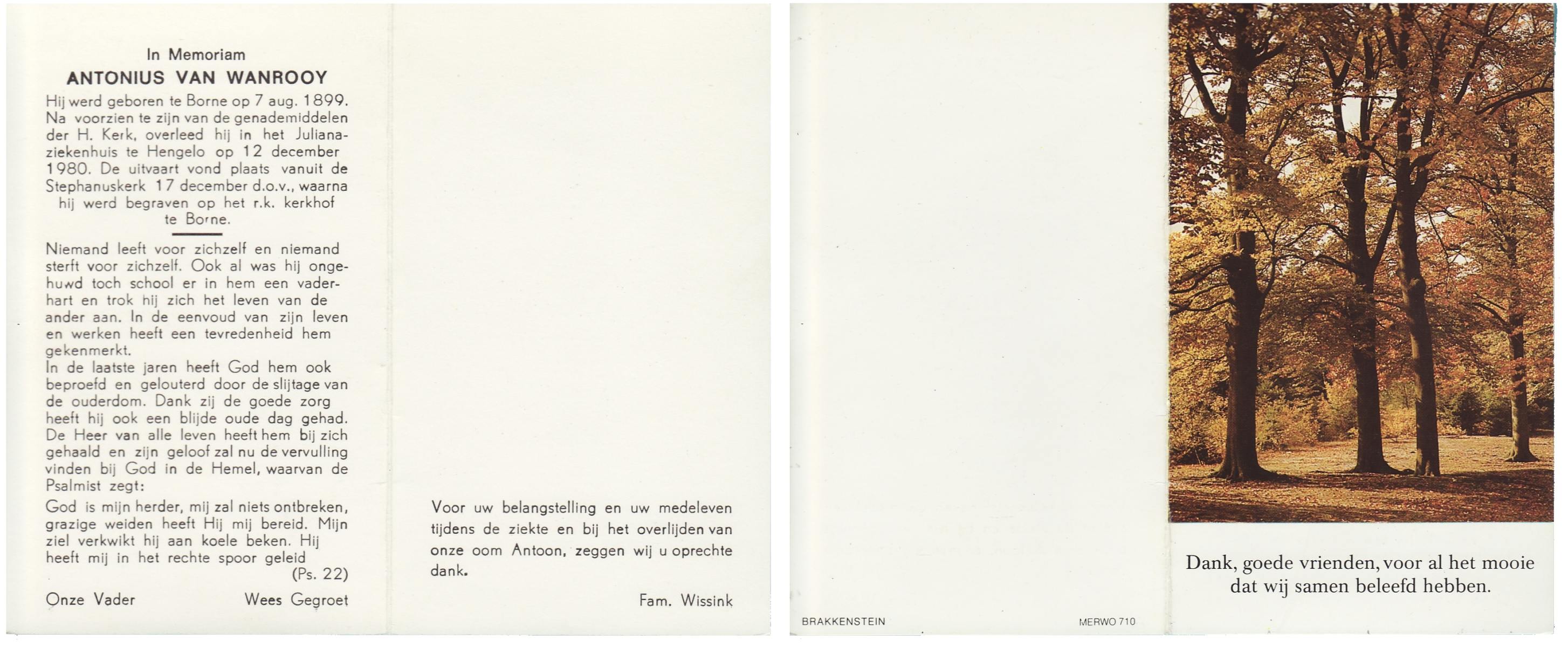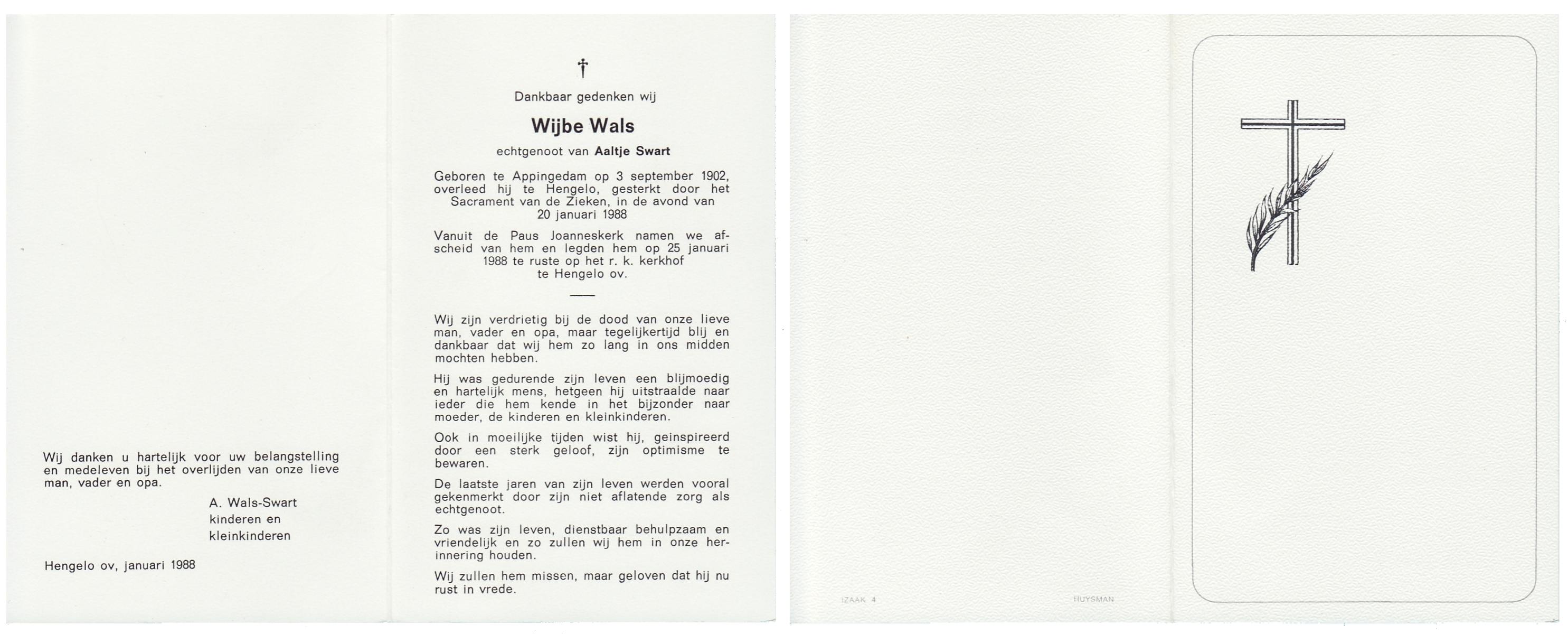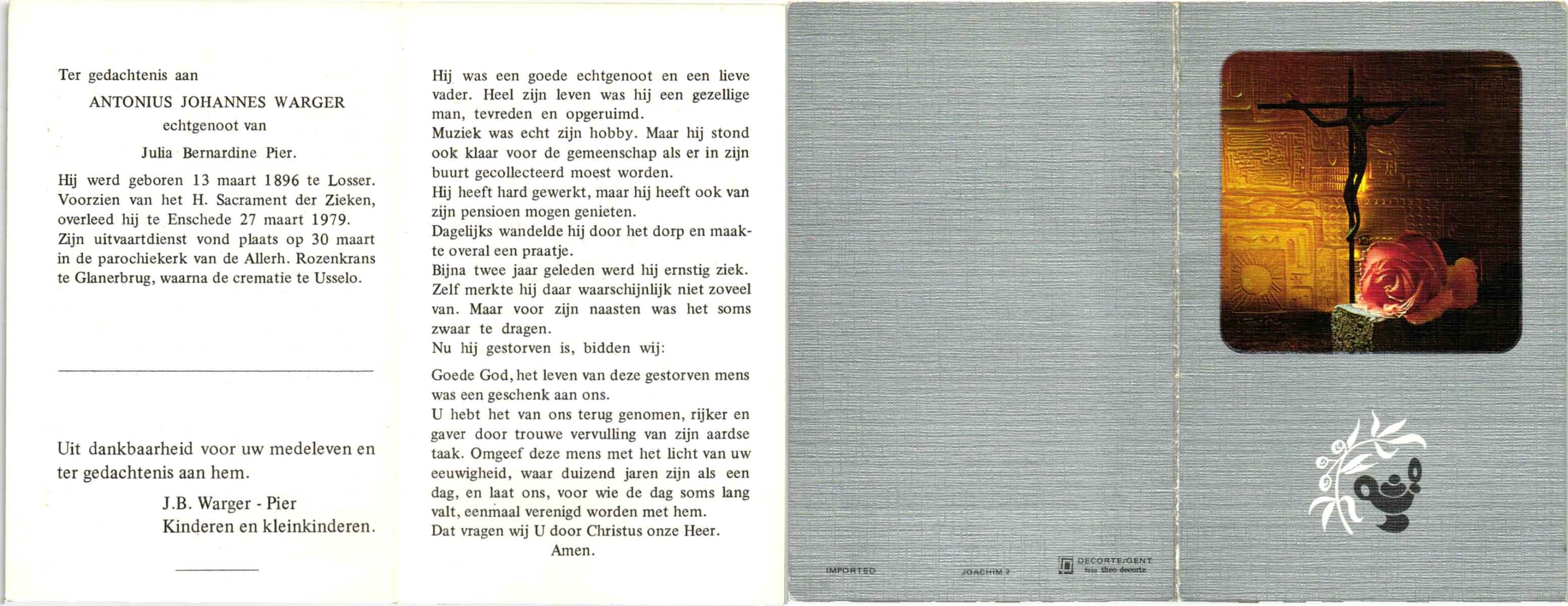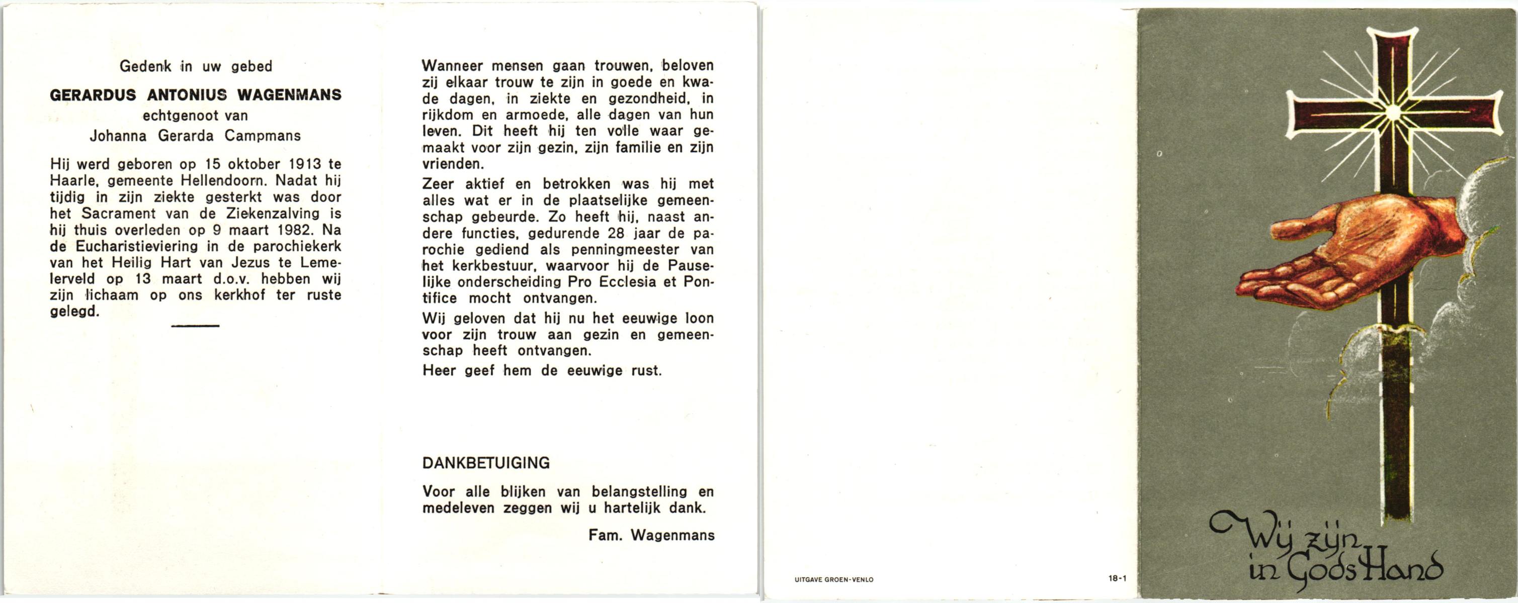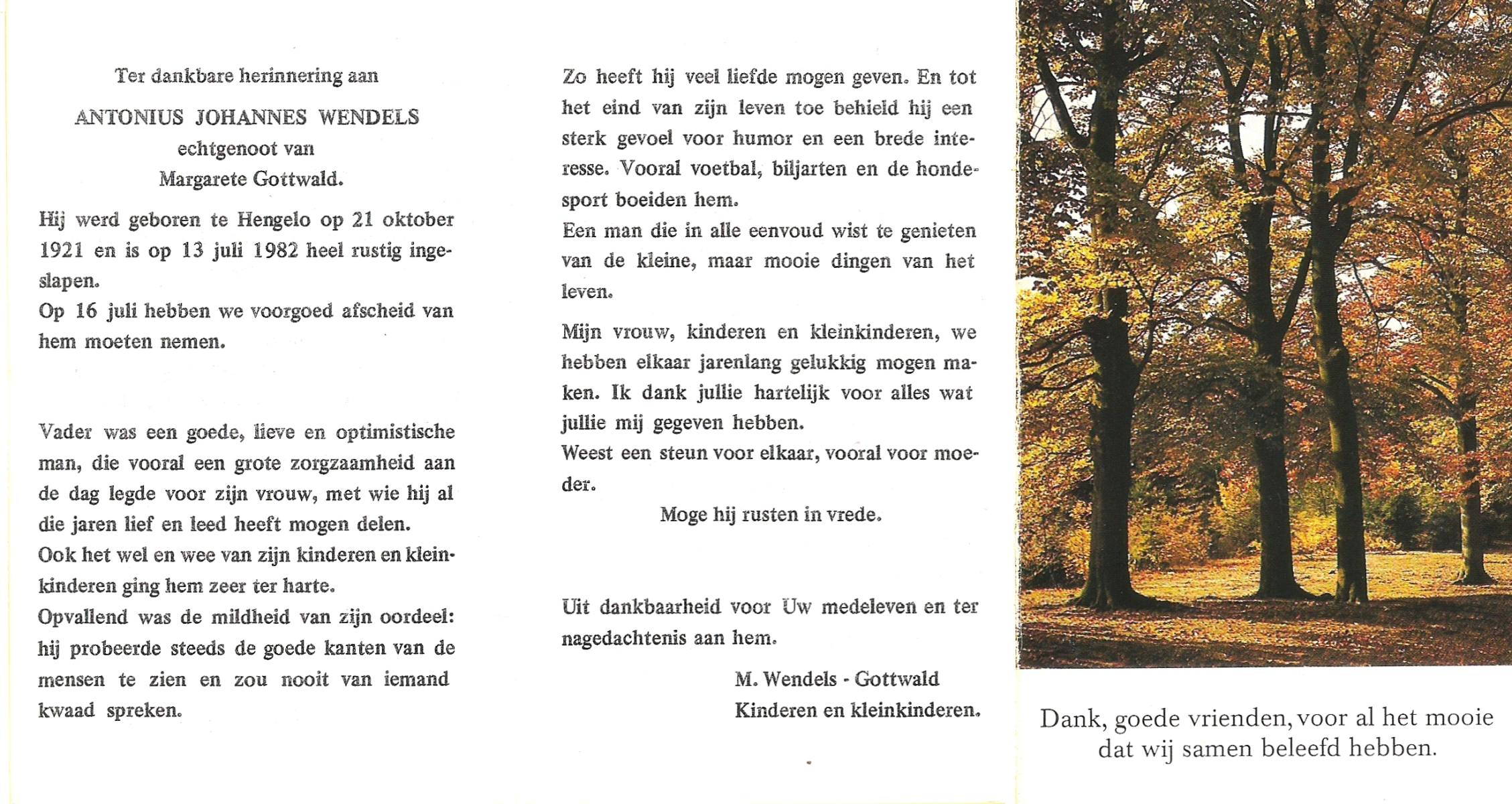 WENDELS, Antonius Johannes, geboren op 21-10-1921 te Hengelo (O), overleden op 13-7-1982 op 60-jarige leeftijd, begraven op 16-7-1982.