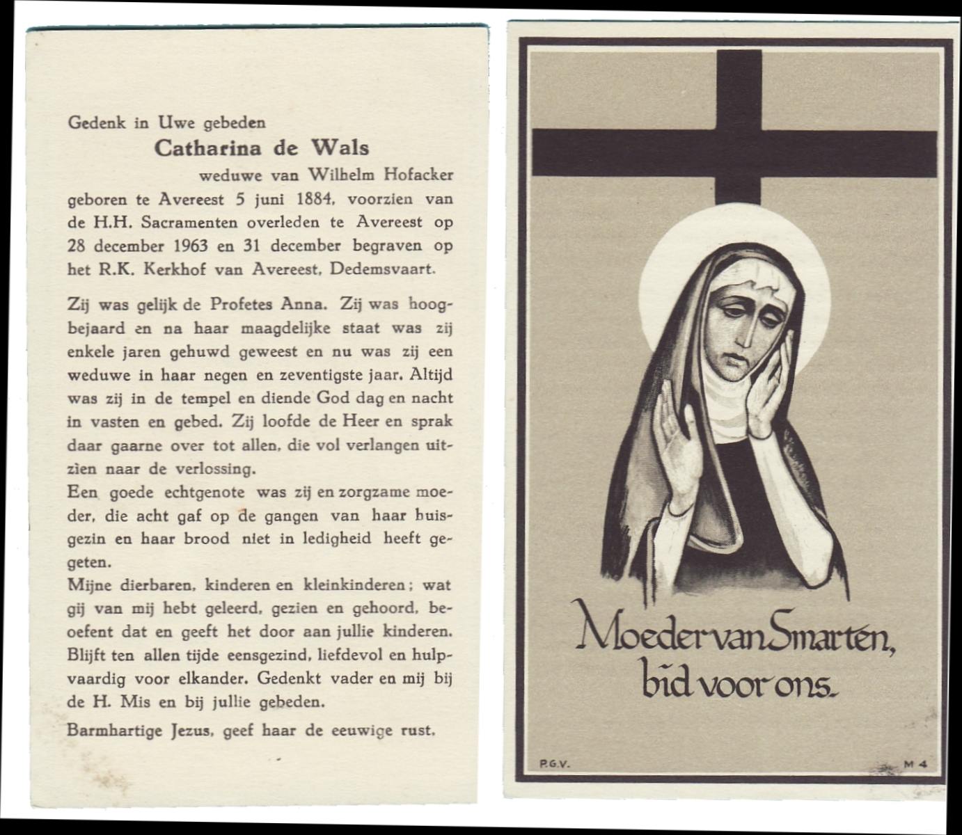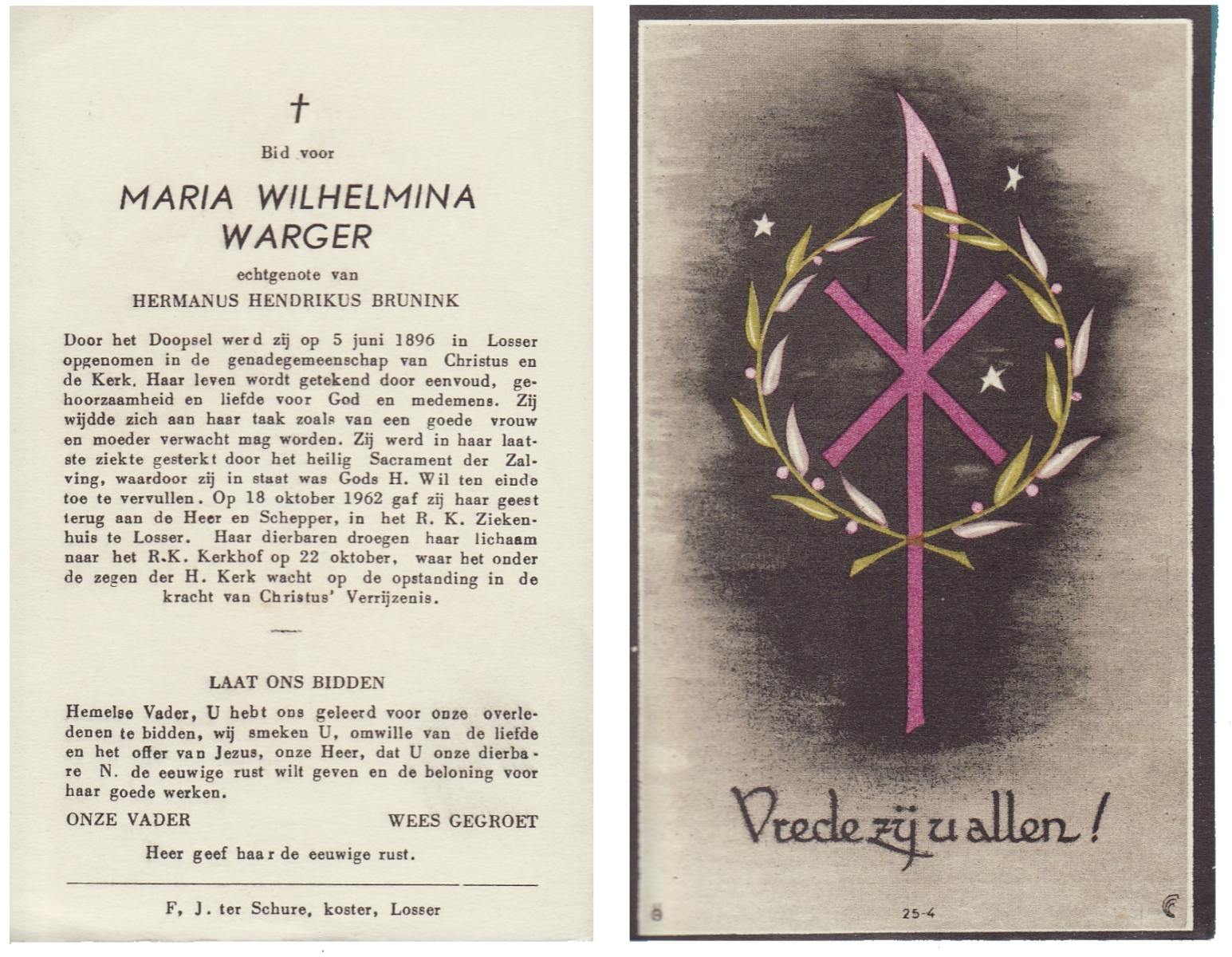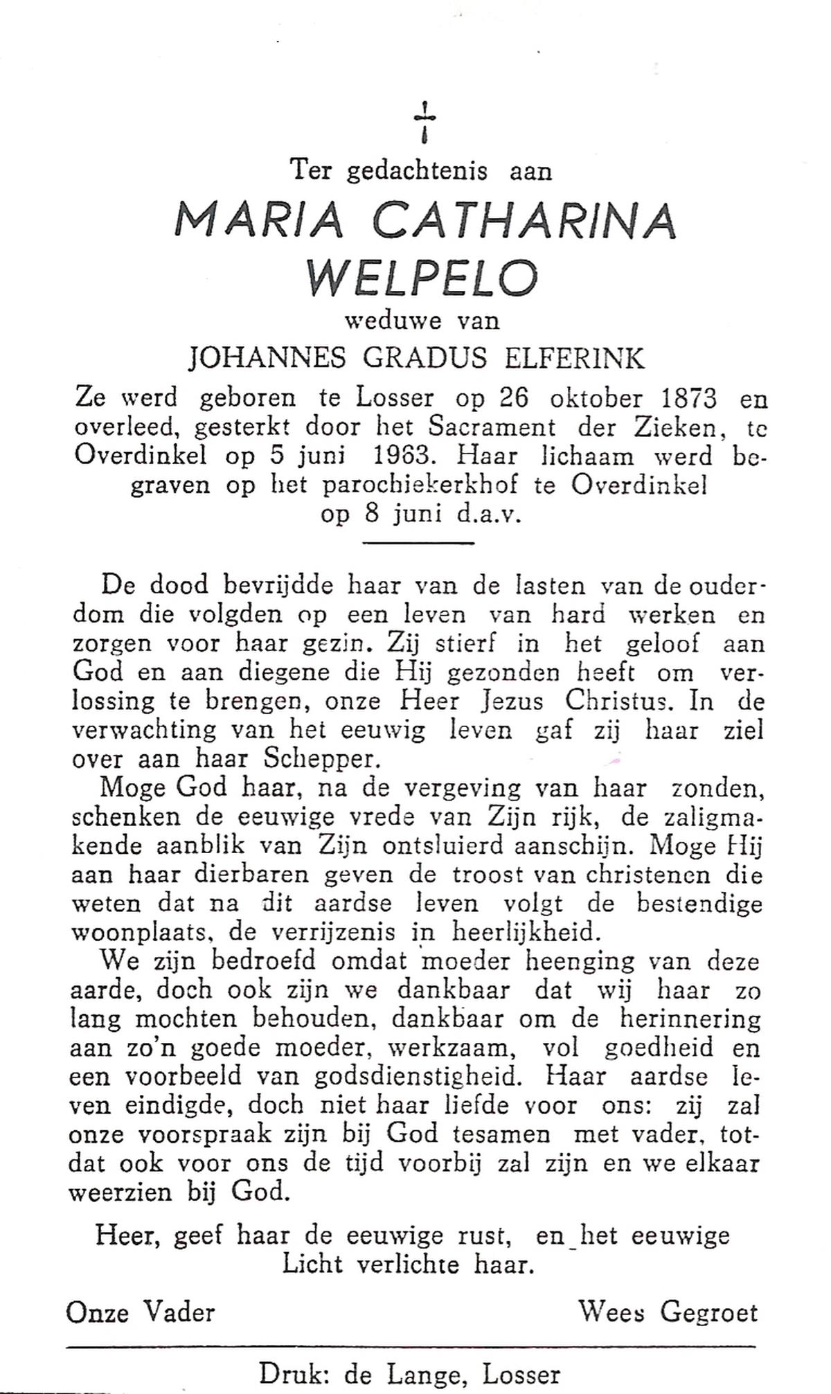 WELPELO, Maria Catharina, geboren op 26-10-1873 te Losser, overleden op 5-6-1963 te Overdinkel op 89-jarige leeftijd, begraven op 8-6-1963 te Overdinkel R.K.kerkhof.